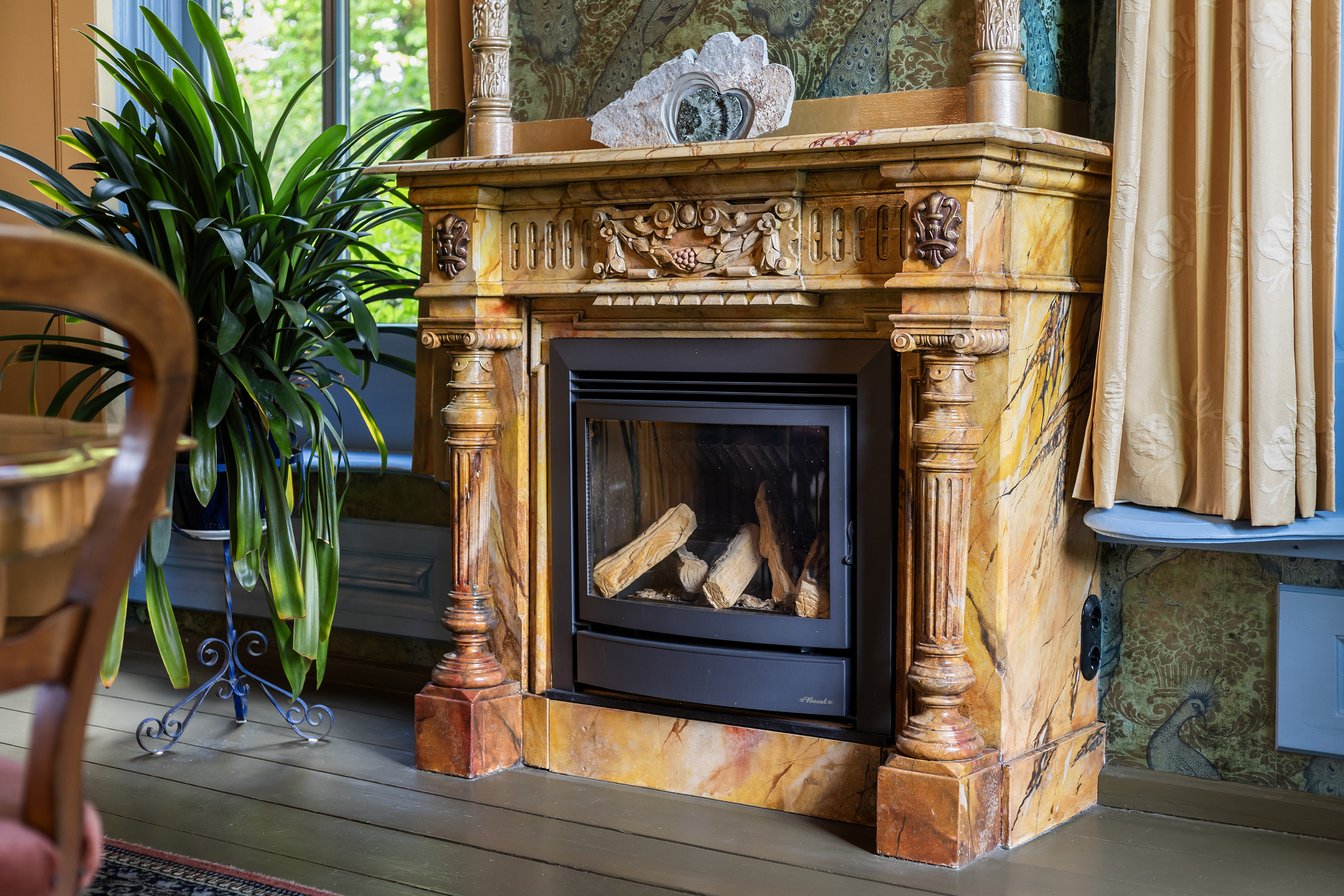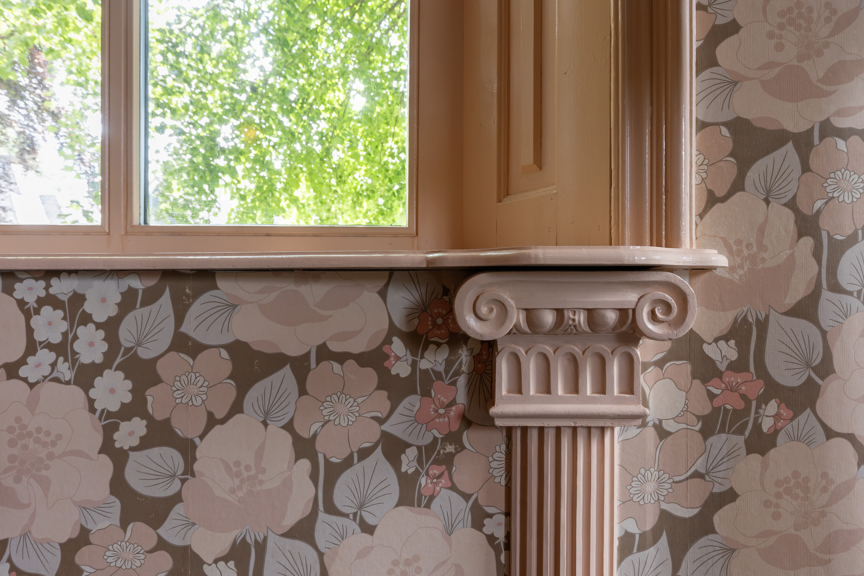 Located at the front of the house, the charming living room radiates grandeur, thanks to its high ceilings, tall sash windows, deep window sills, original wooden floors and a historical fireplace with antique stove. Classic wallpaper, rich detailing and views of the mature trees in the front garden enhance the warm, welcoming atmosphere. This room, like the adjacent formal dining room, features a gas heater and has been insulated from below via the cellar.