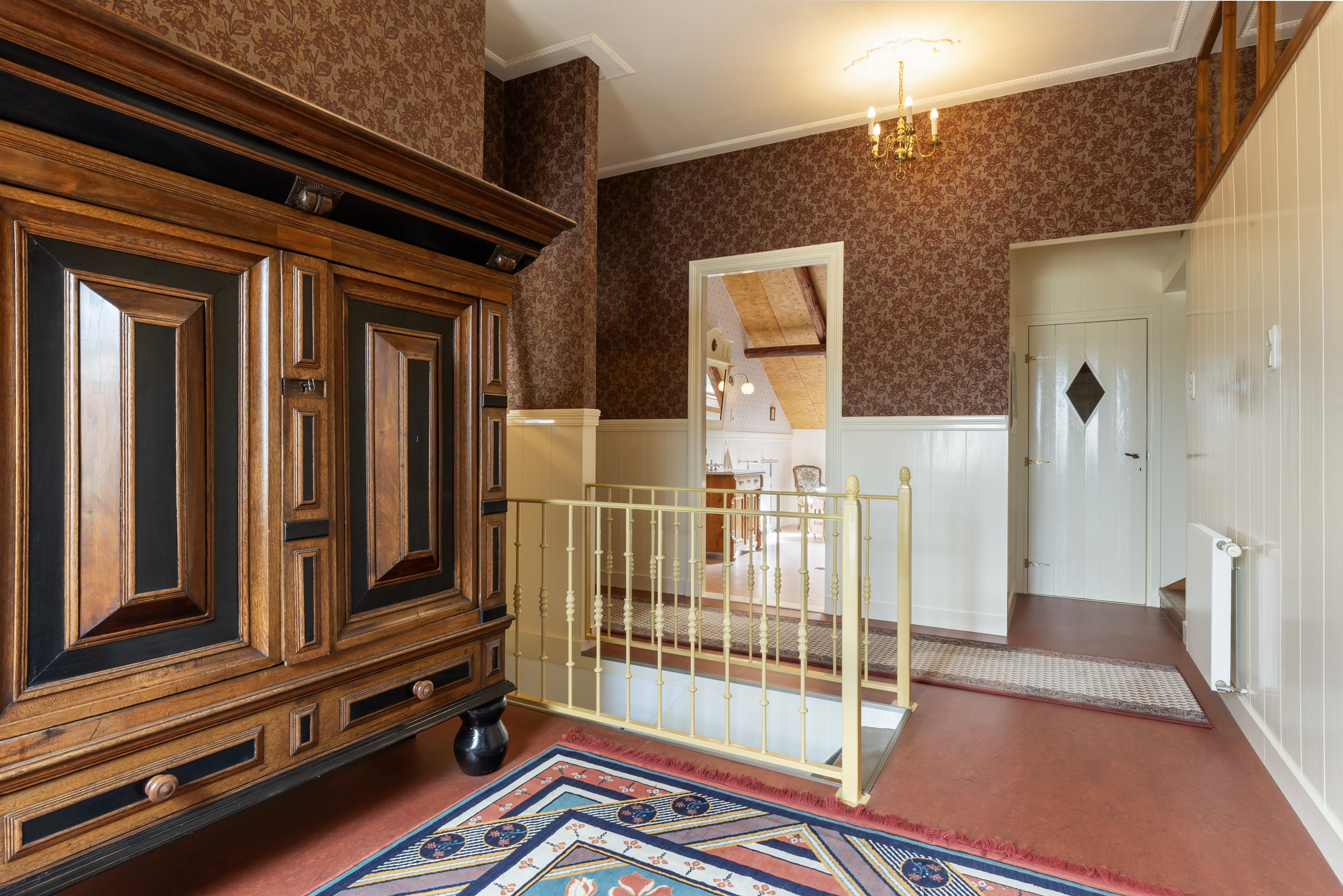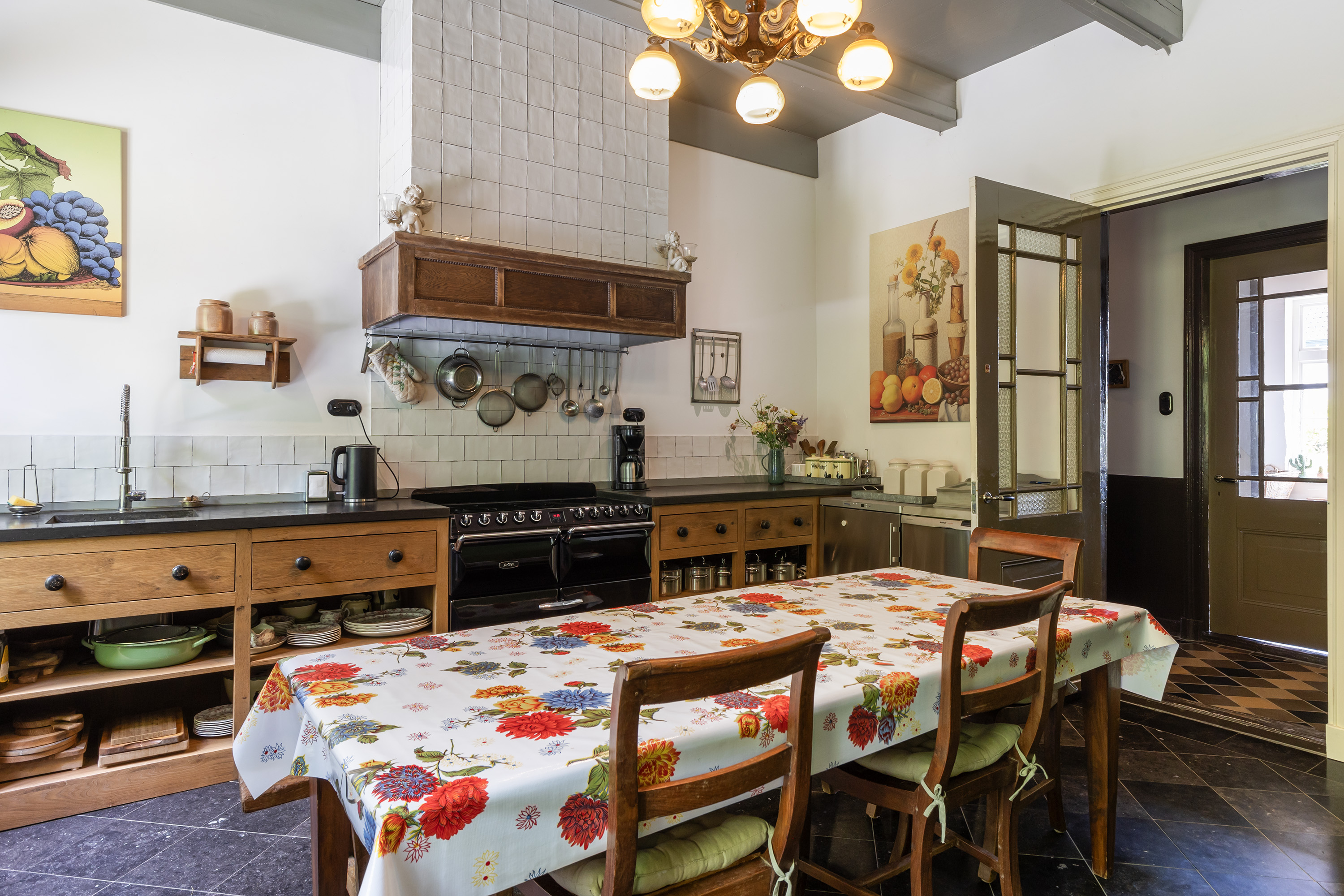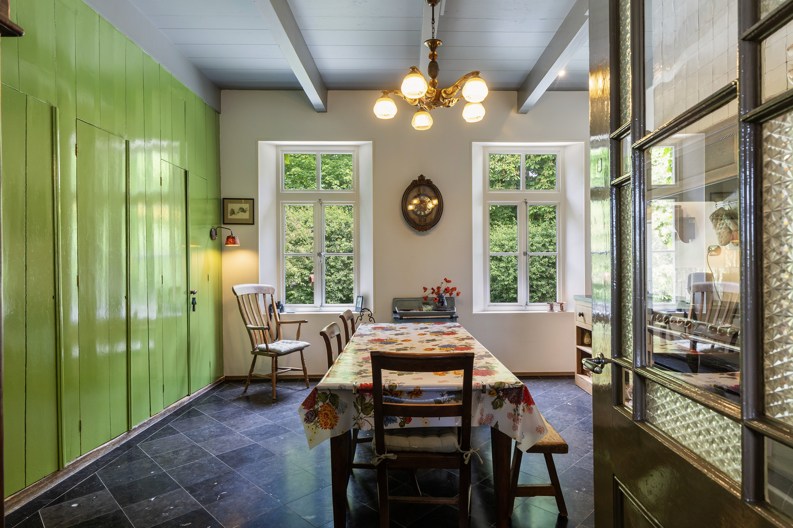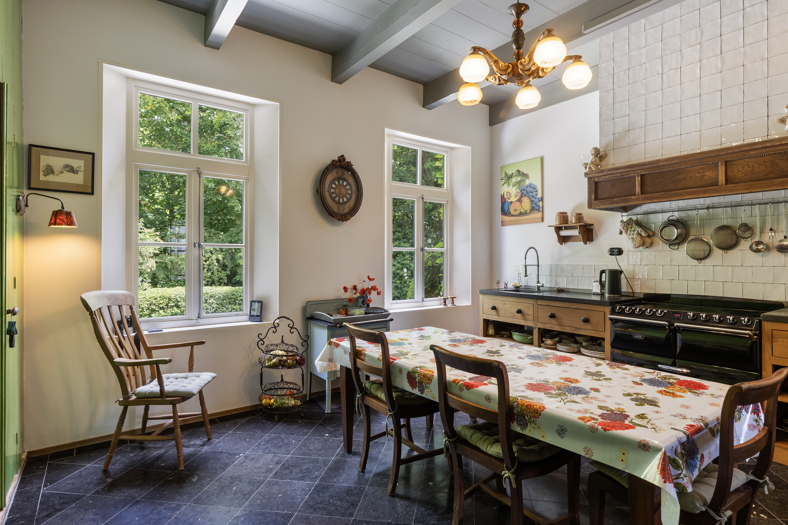 The spacious kitchen harmonises perfectly with the home’s overall style and is fitted with a black natural stone floor, traditional wooden cabinetry, a classic AGA cooker with halogen hobs, electric grill and ovens, and a tiled hearth. Double windows ensure ample daylight and views of the greenery. The kitchen forms part of the oldest, lower-level central section of the house.