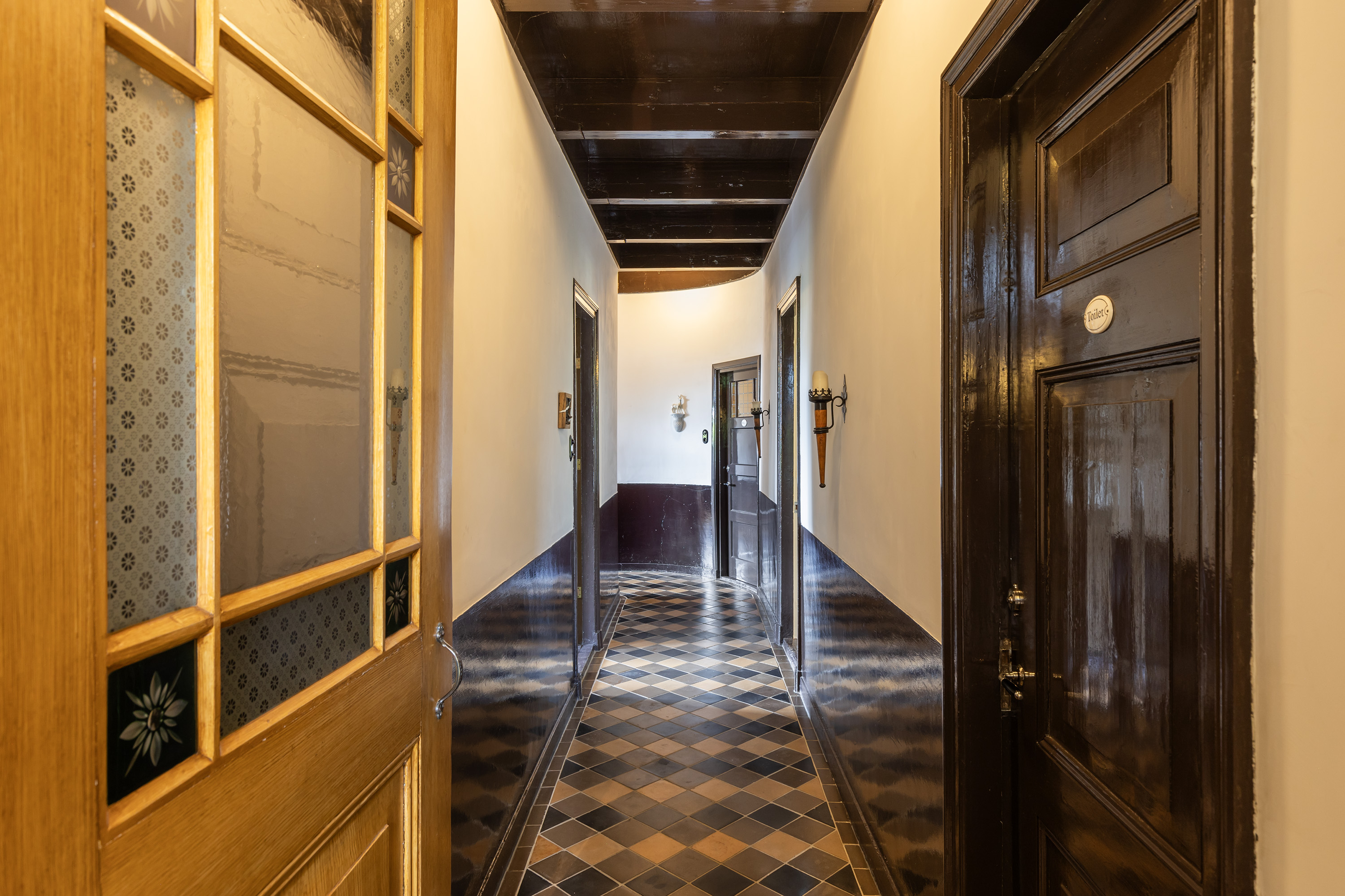 The imposing front door with wrought iron details opens into a stylish reception hall with marble flooring, wainscoting and high ceilings with refined plasterwork. This stately corridor forms the central axis of the home, granting access to the front and rear living rooms, kitchen, utility room, bathroom, cellar, toilet and a storage room. A side door leads to the barn and former stables.