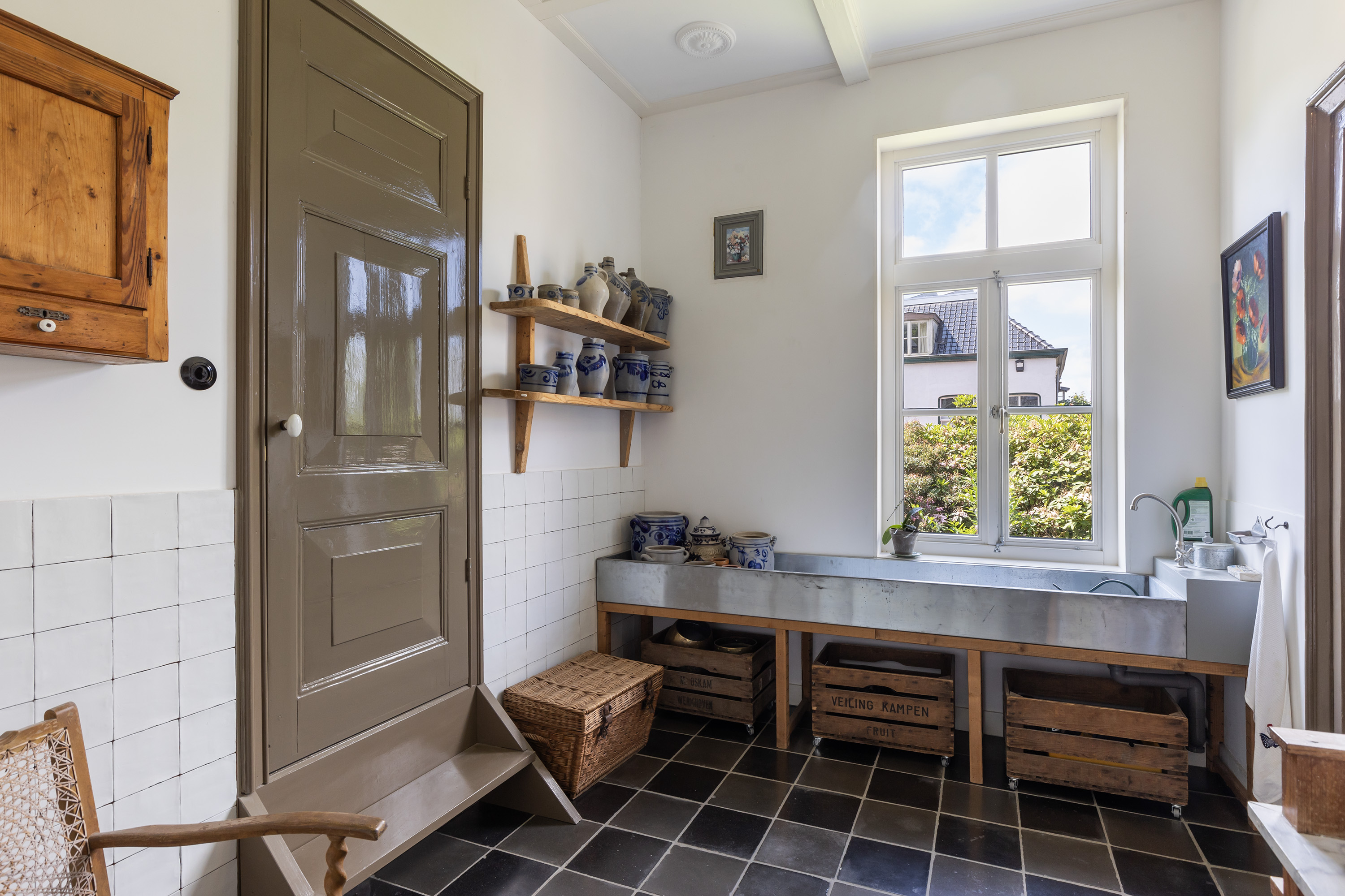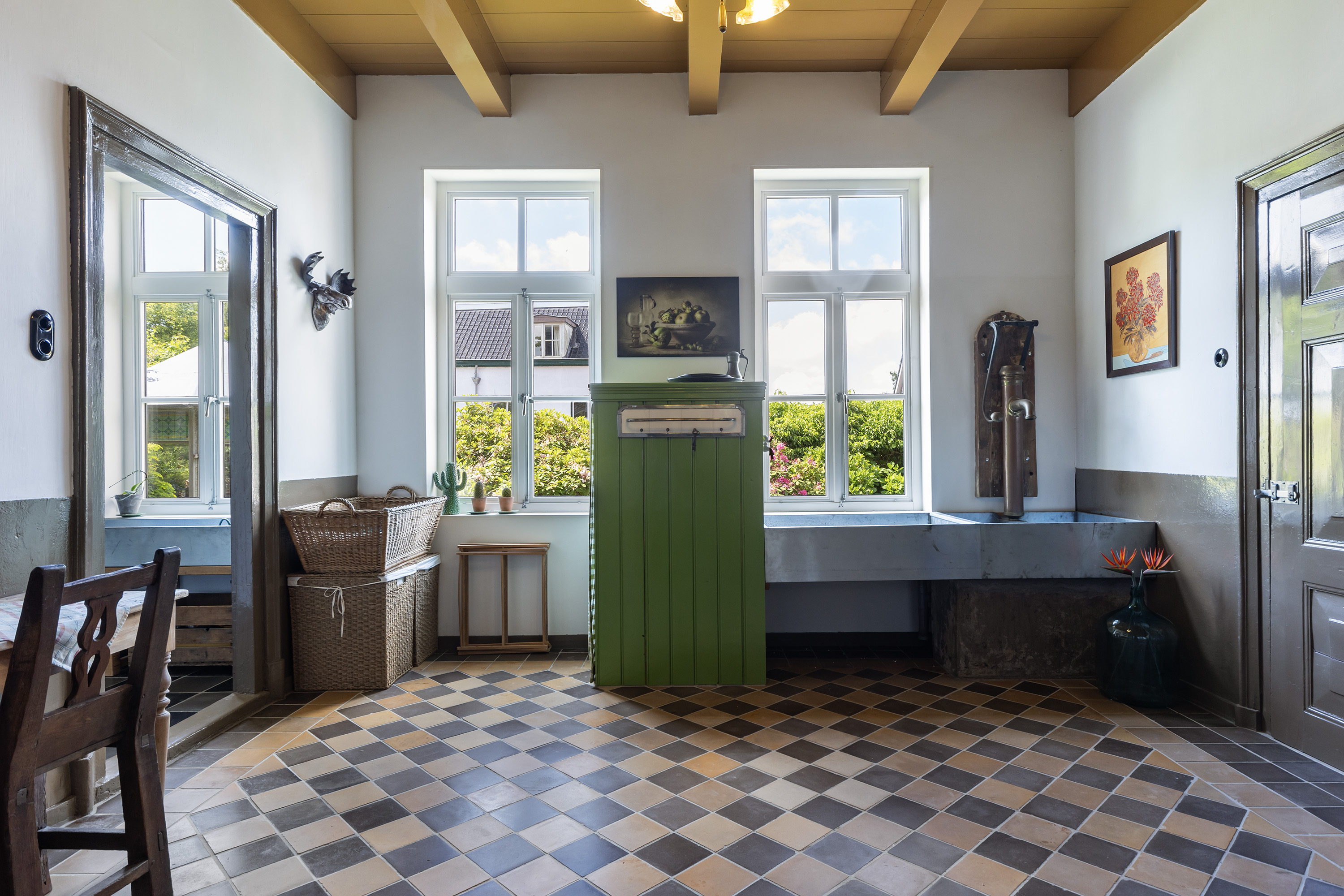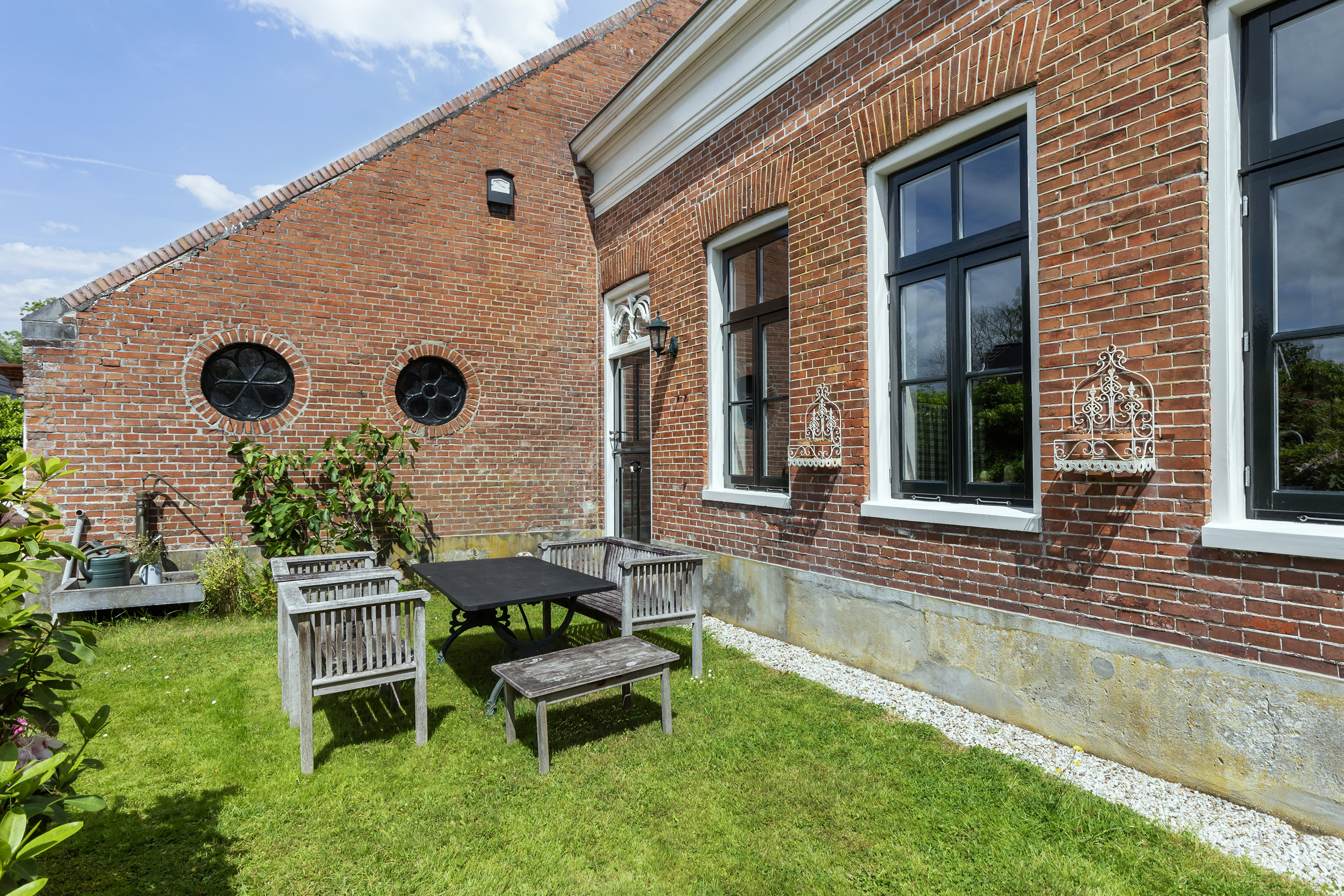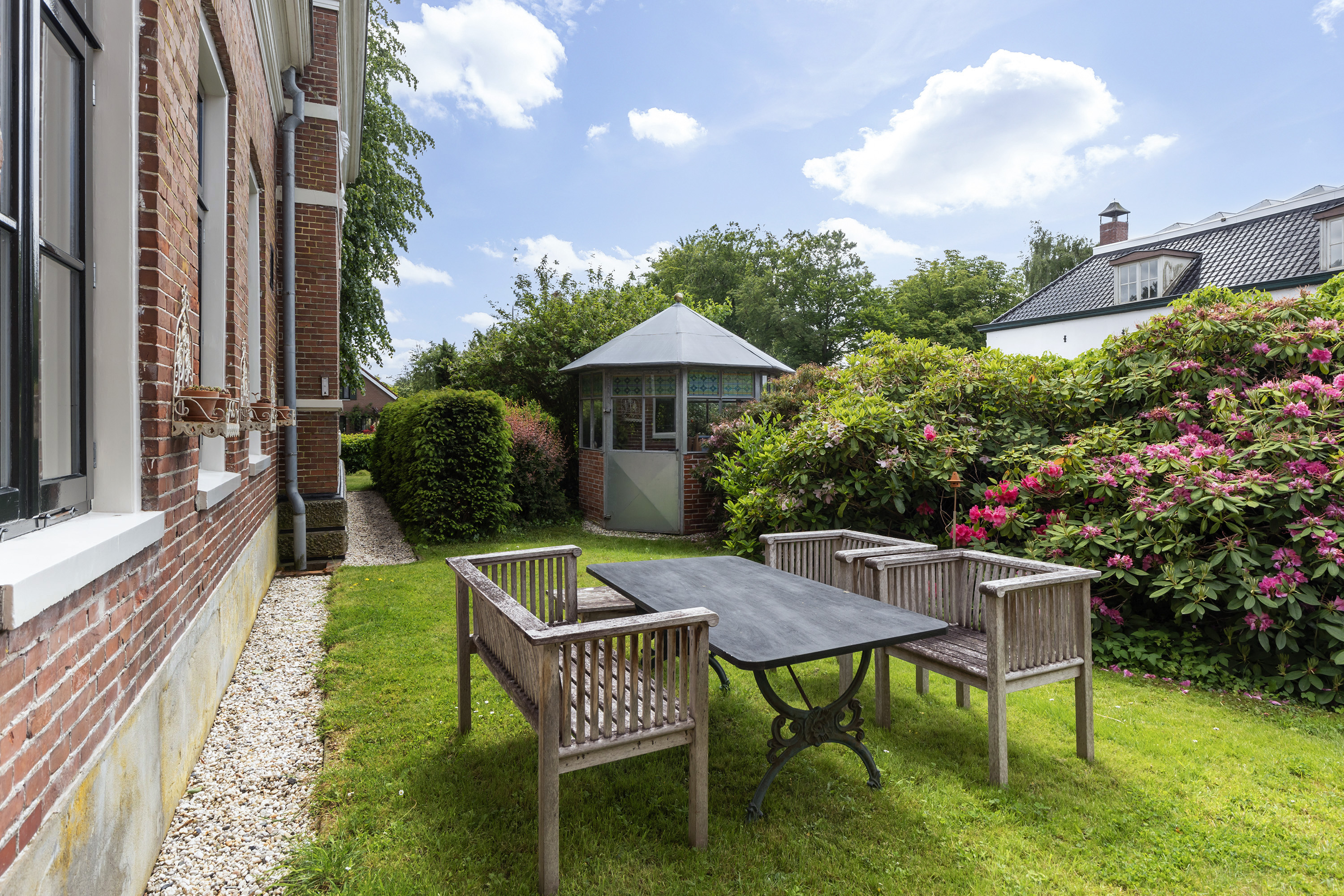 From the orangery, one steps into the garden and orchard with various old Dutch fruit trees. A large rainwater-fed pond adds to the idyllic setting.