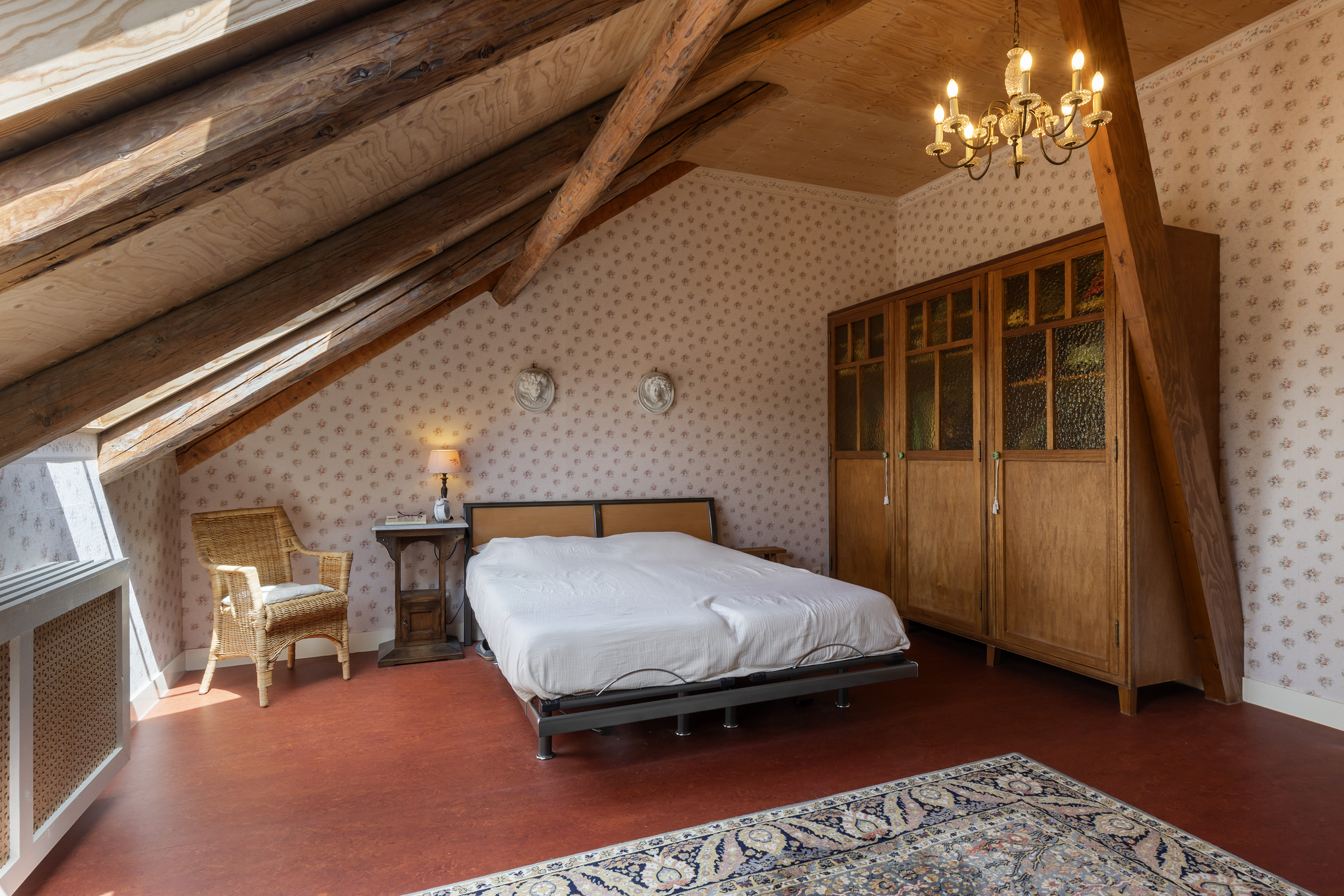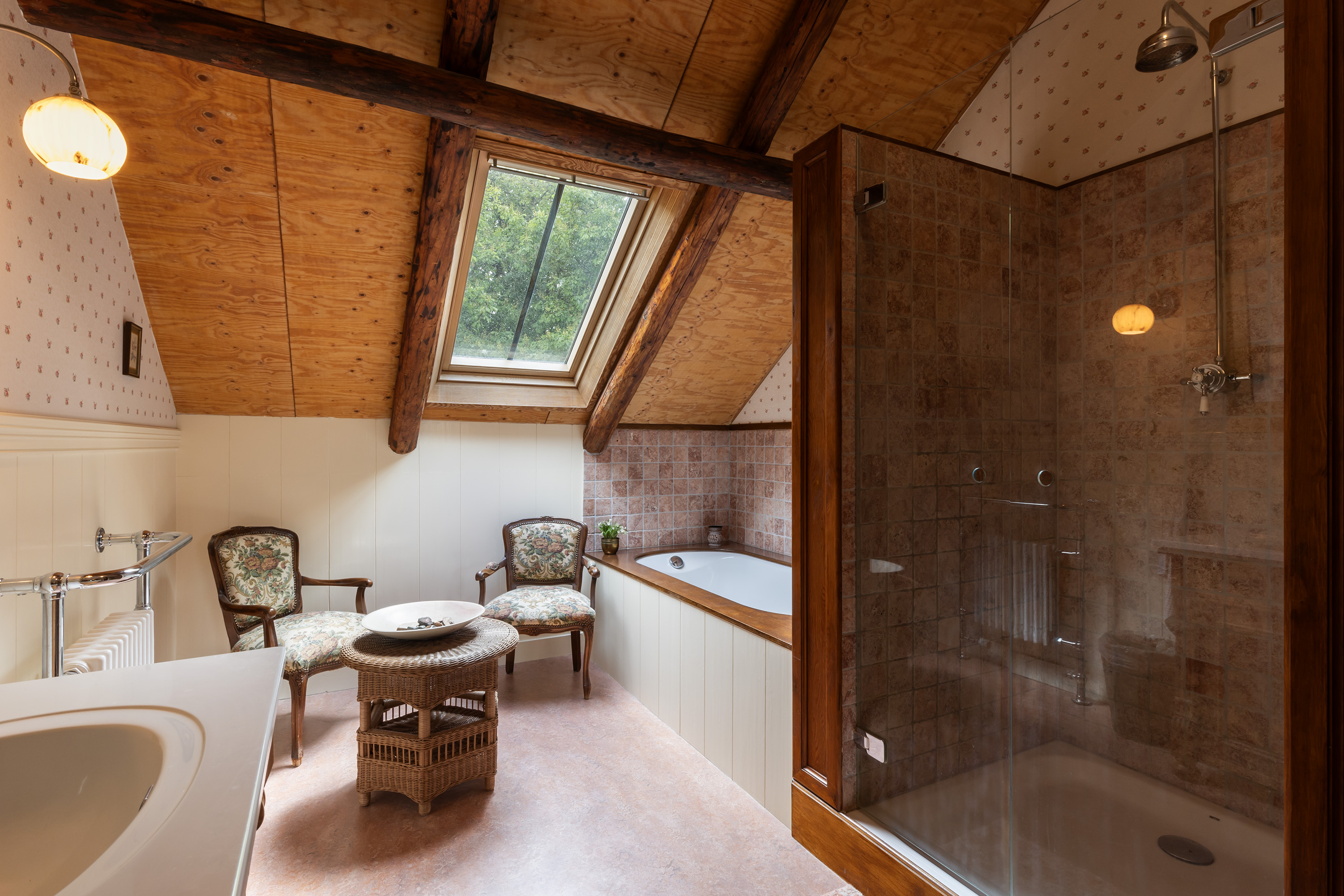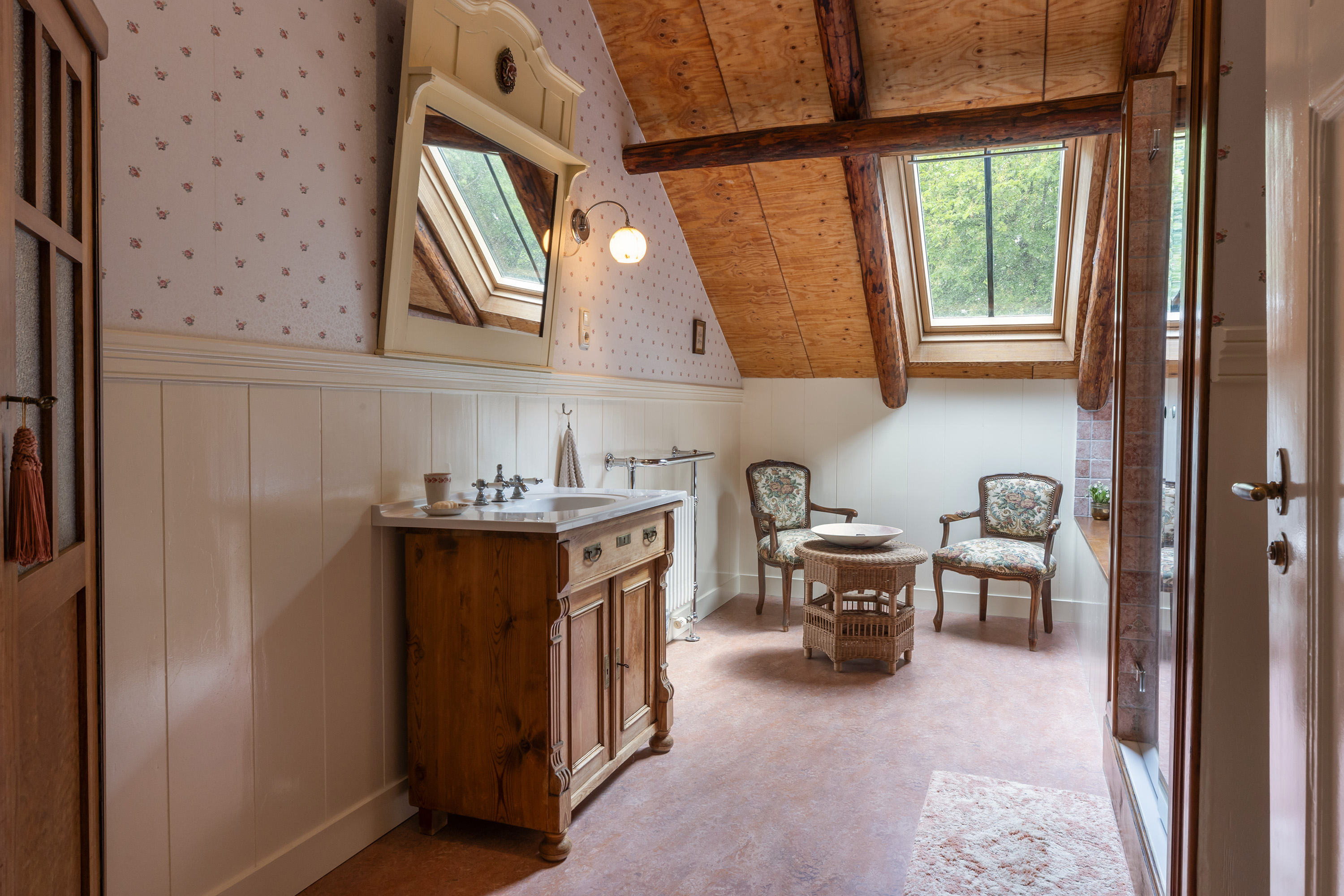 The upper floor was completely renovated during the refurbishment. Old subfloors were removed and rebuilt, creating a large loft-like space. This floor now accommodates a charming office/sitting area, two bedrooms, a stylish bathroom and a separate toilet. The luxurious bathroom features a freestanding bathtub under a skylight, a spacious walk-in shower and a custom vanity unit. The combination of timber elements with natural stone wall tiles provides a serene and elegant ambiance. Five recently installed Velux skylights with double glazing ensure abundant daylight. Heating is provided via the hybrid heat pump.