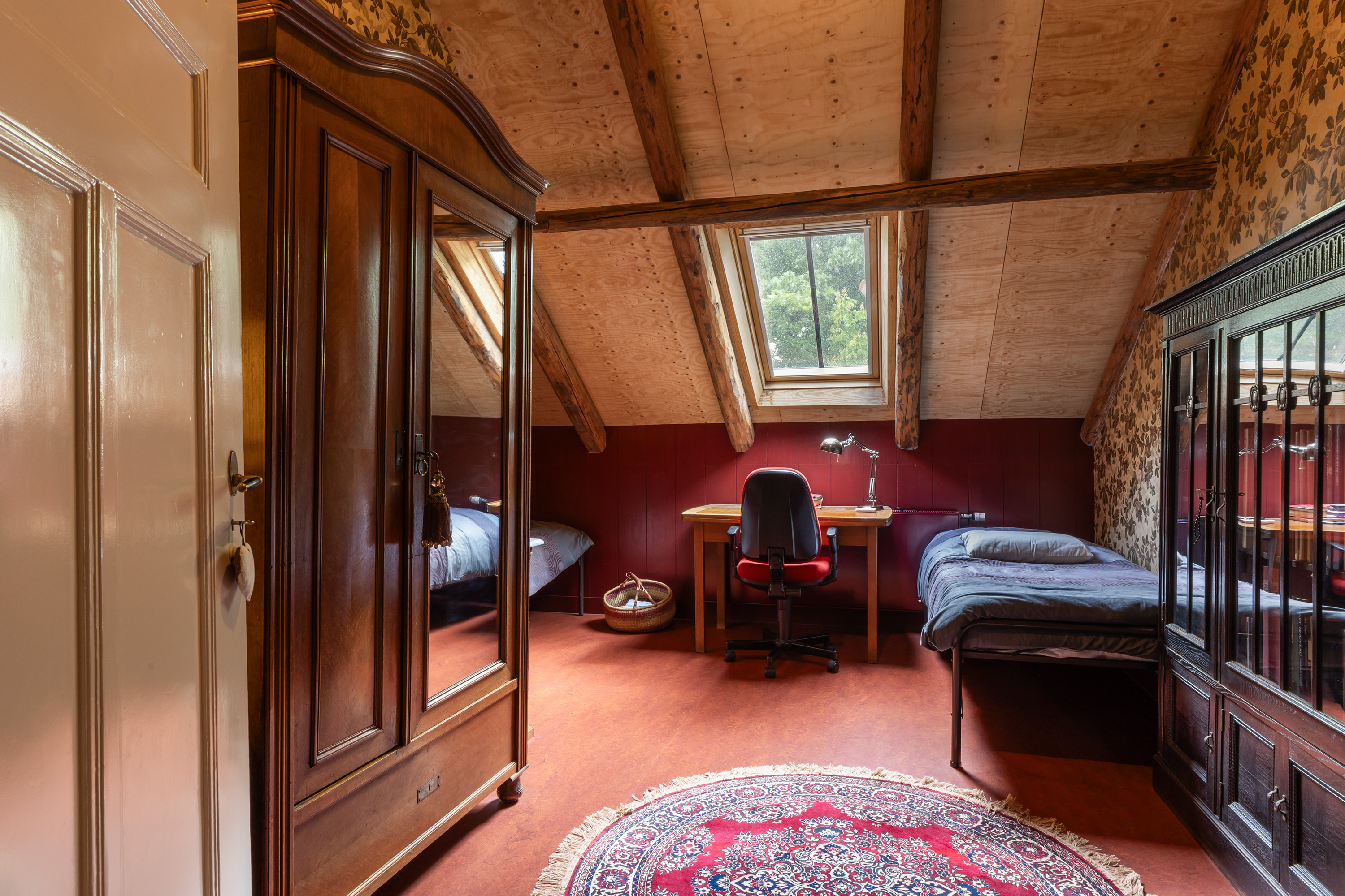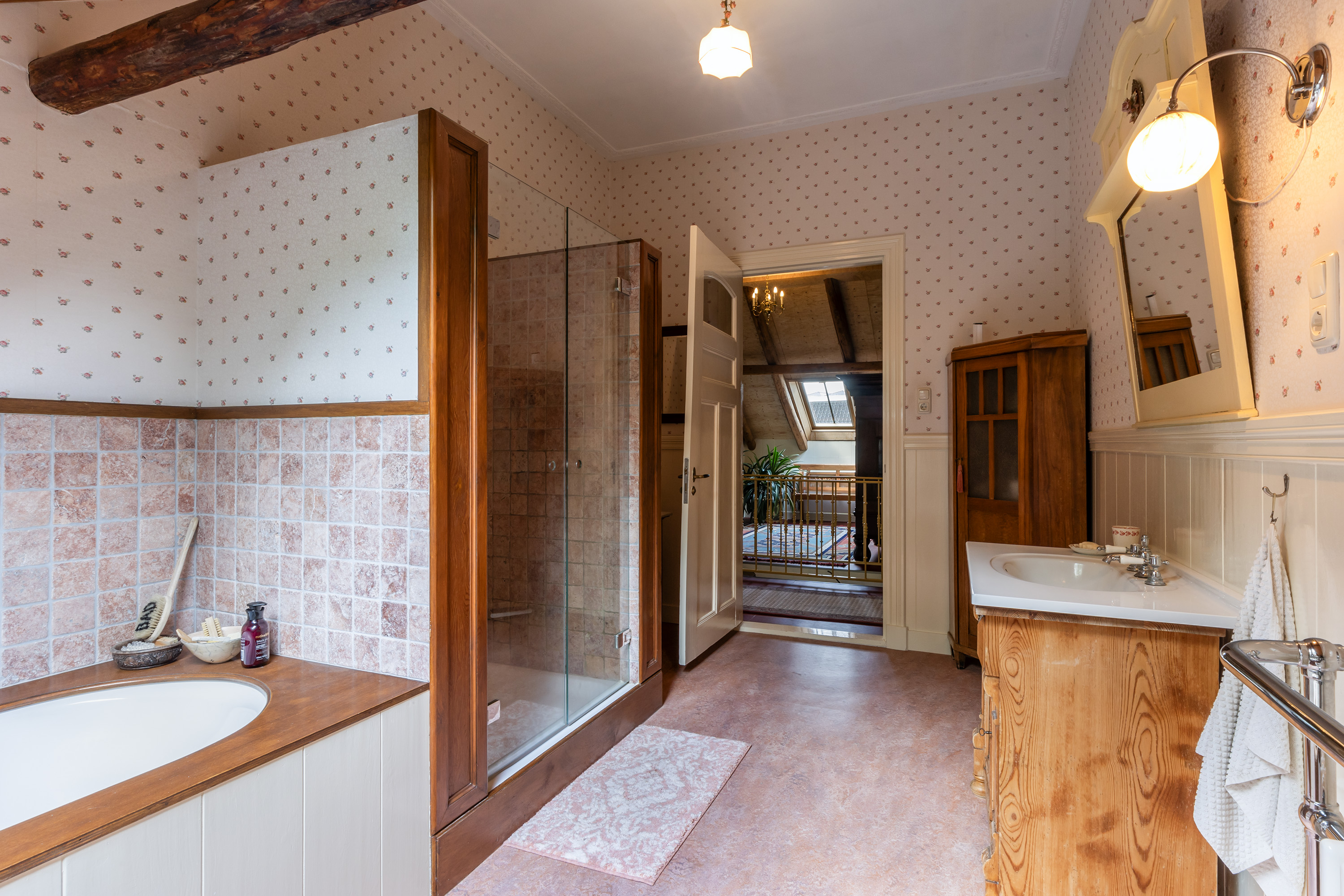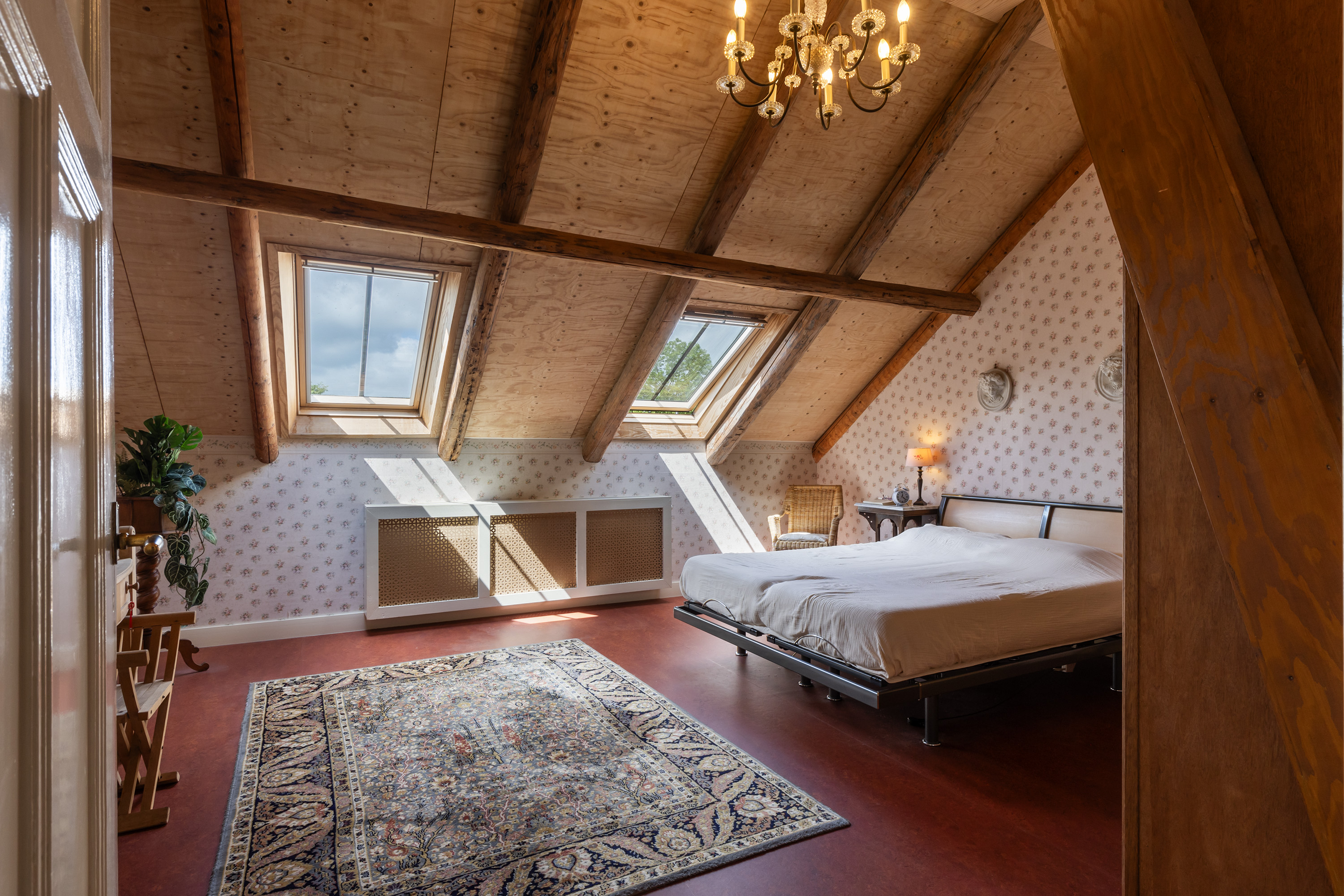 The upper floor was completely renovated during the refurbishment. Old subfloors were removed and rebuilt, creating a large loft-like space. This floor now accommodates a charming office/sitting area, two bedrooms, a stylish bathroom and a separate toilet. The luxurious bathroom features a freestanding bathtub under a skylight, a spacious walk-in shower and a custom vanity unit. The combination of timber elements with natural stone wall tiles provides a serene and elegant ambiance. Five recently installed Velux skylights with double glazing ensure abundant daylight. Heating is provided via the hybrid heat pump.