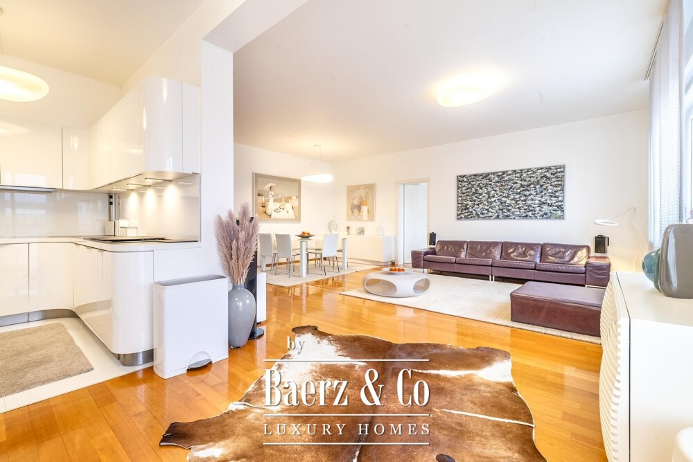 The apartment is sold fully furnished, featuring custom-made furniture and a NOLTE kitchen with integrated MIELE appliances. The layout balances sophistication and function, with a welcoming entrance, guest WC, two bedrooms, a master suite with en-suite bathroom, and an additional well-appointed bathroom. The heart of the home is an expansive open-plan living and dining space flowing seamlessly onto a 30 m² terrace, inviting in natural light and open views. Adjacent, a private 50 m² garden offers rare outdoor space within the city.