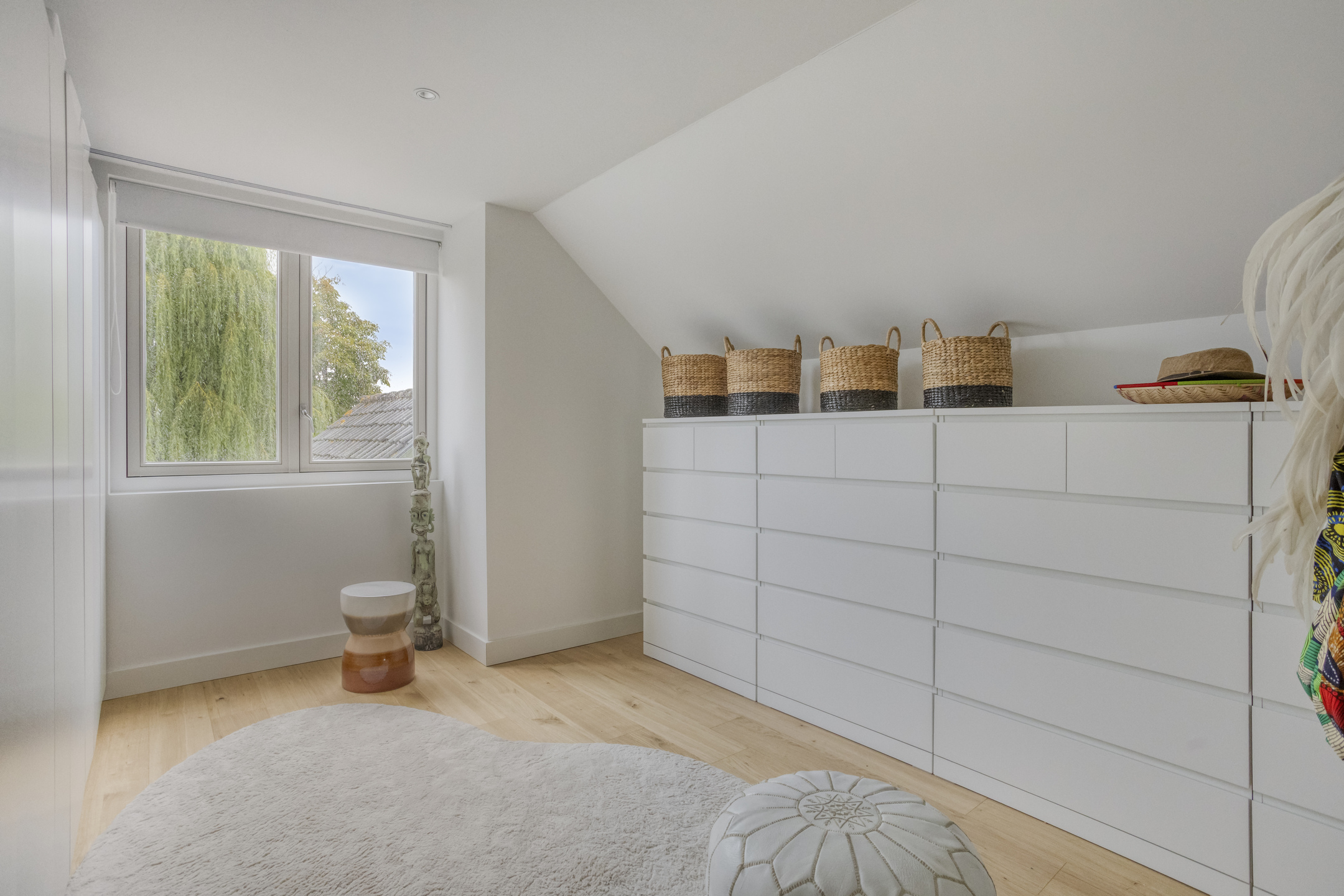Upstairs you'll find three bedrooms, one of which has been transformed into a generous walk-in closet adjoining the master bedroom—easily converted back into two separate bedrooms if needed. The luxurious bathroom features underfloor heating, dual natural stone sinks with gunmetal taps, an oak vanity unit, a walk-in shower, and a second toilet.