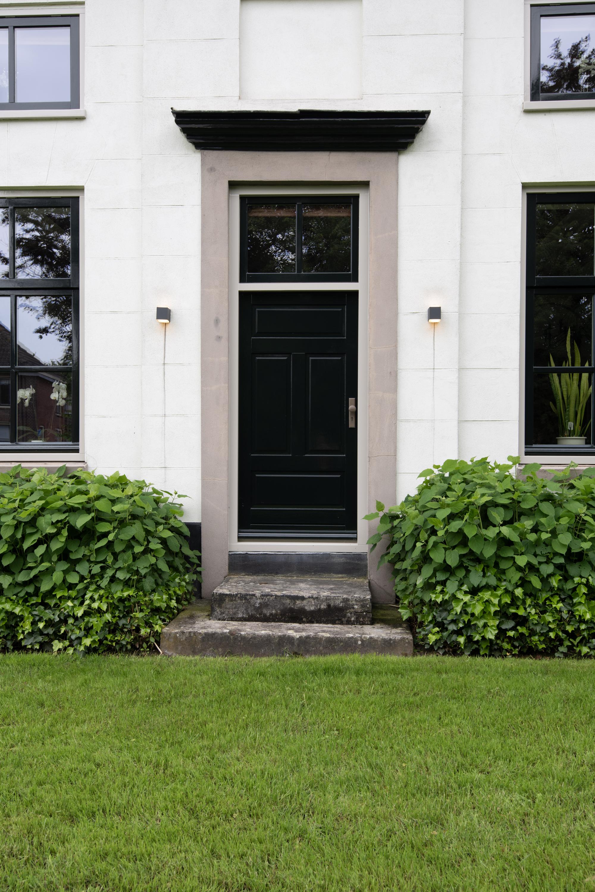 The original front door is located centrally in the front house but it is no longer used. The daily entrance is on the driveway side. The entrance is spacious and furnished with closets and a toilet. From the adjacent hallway is access to the living room. This sunny room with many skirted windows, flanked by interior shutters, breathes -with the almost three-meter high beamed ceiling- a pleasant atmosphere. In addition to the luxurious ceramic floor with underfloor heating, there is a natural stone fireplace with an open gas fire. In the living room are two passages that offer a view of the adjacent dining kitchen. This space offers access to the south-facing terrace through double French doors. Three mature Plane trees act as natural umbrellas there in the summer.
