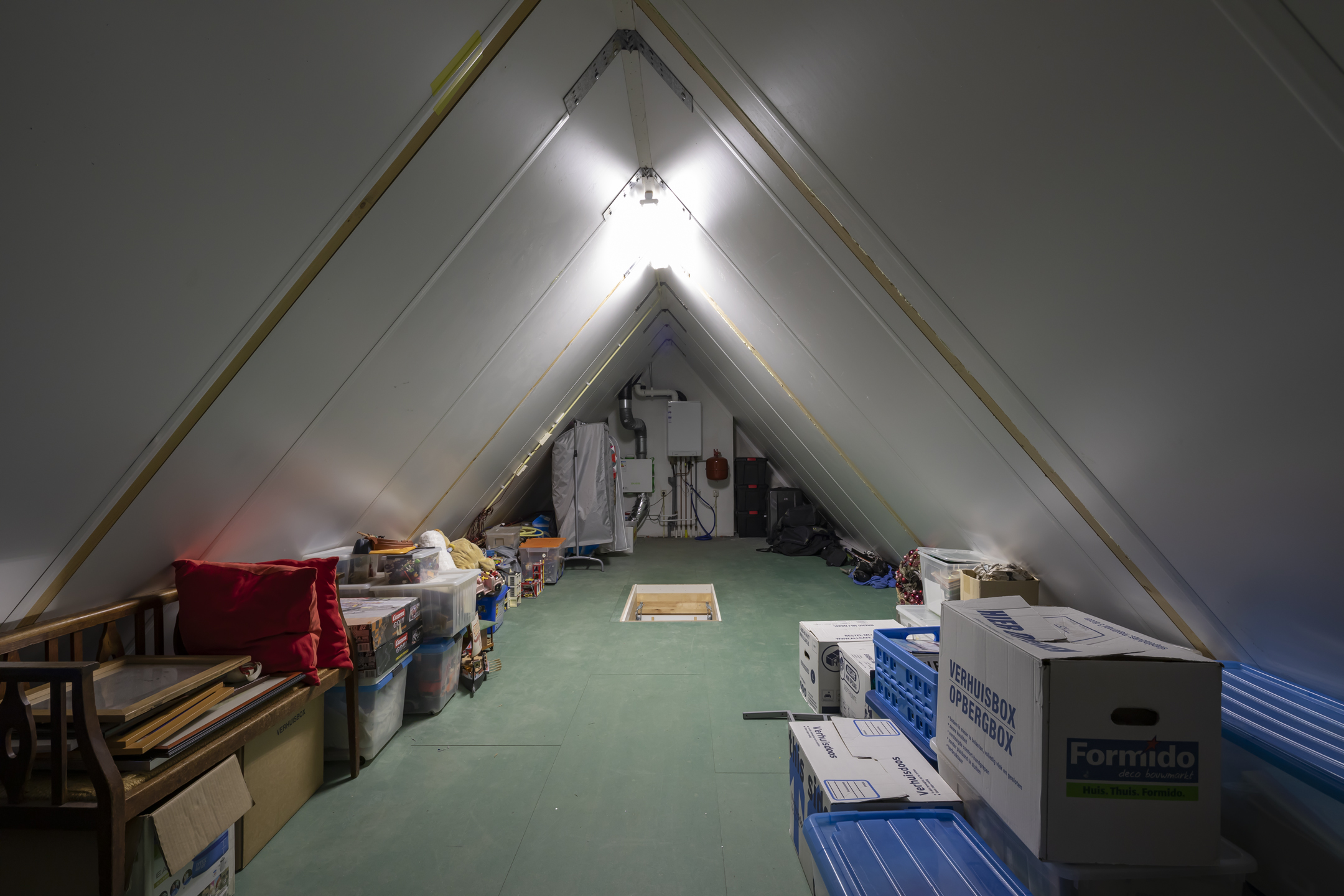 This pleasant, practical space offers space for all your non-daily necessities. The attic storage extends the entire length of the house, approximately 11.5 meters.