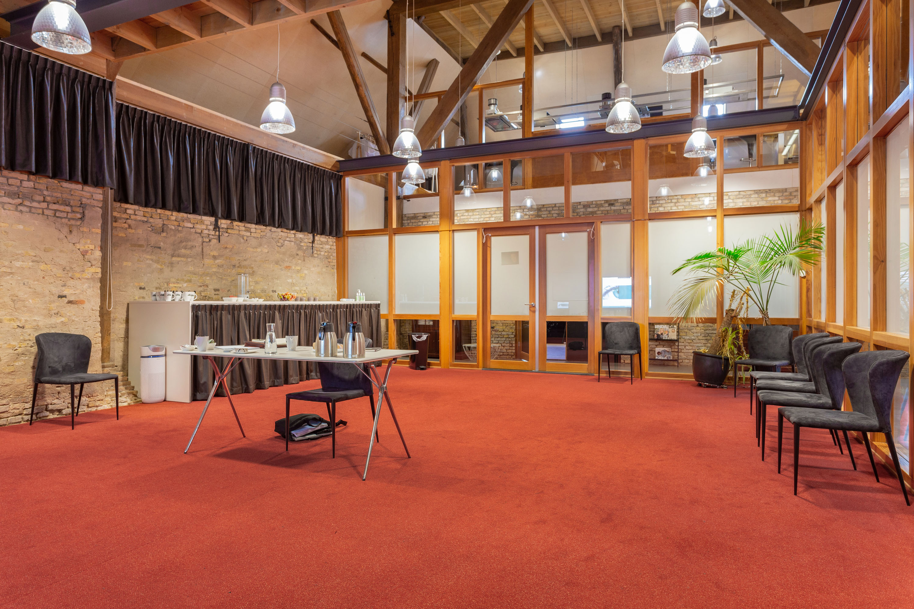 The former barn has been professionally renovated and completely modernized. Imposing open stable doors with glass entrance, is a striking feature upon arrival at Harlingen Staete. There are now 4 beautiful fully furnished rooms with en-suite bathroom. Furthermore, downstairs are 3 spacious multifunctional rooms situated around a large open-plan hall with a view of the imposing ridge in the middle of the barn. All rooms are light and atmospheric due to the use of a lot of glass, the preservation of the old stable windows and the beautiful old beams of the 6-sided part of the barn in sight. It goes without saying that all high-tech connections/wiring for internet, light, presentations etc. are present as well as a pantry and separate toilet groups.