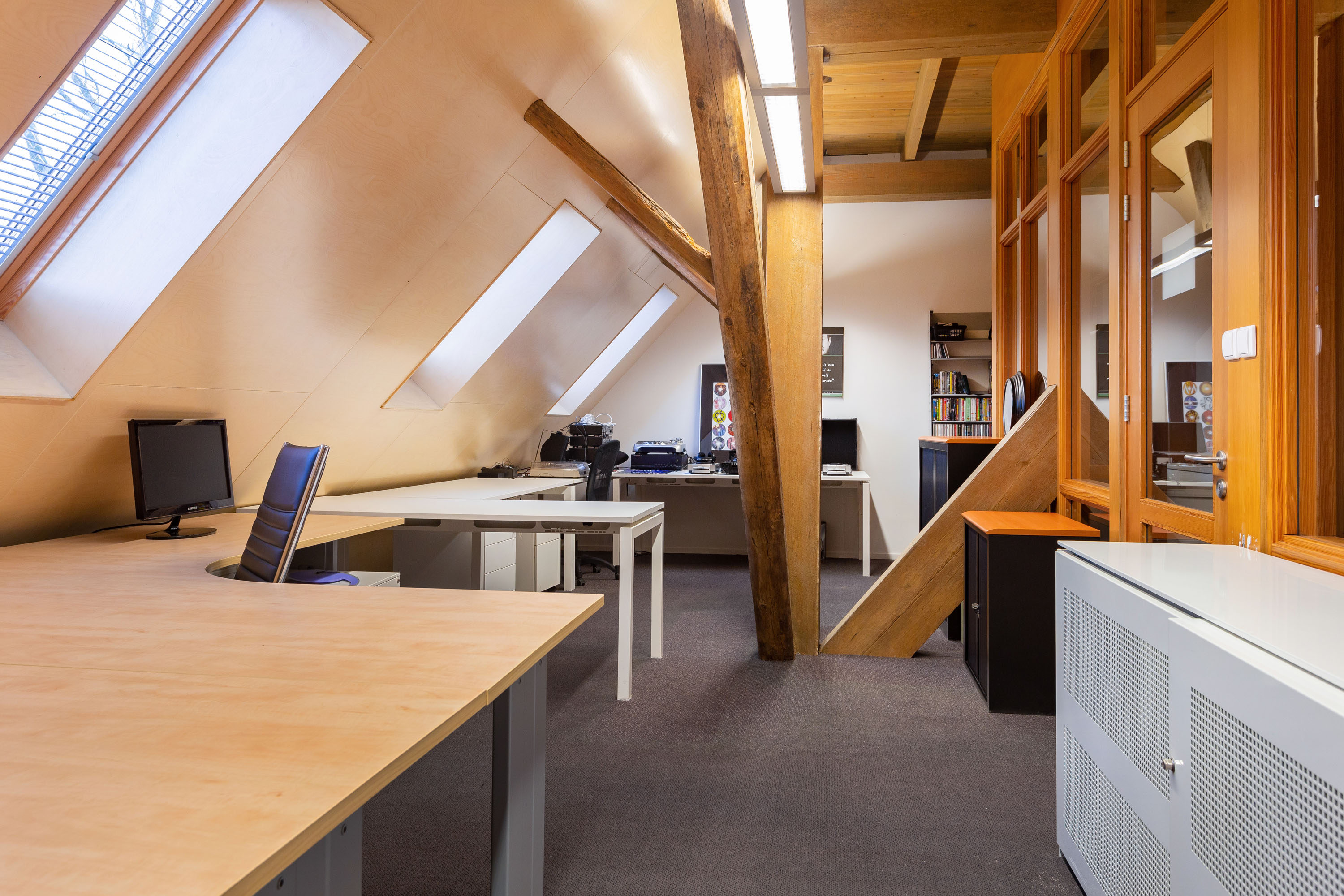 The imposing wooden former stable doors immediately indicate where the entrance is located. As you enter through these doors into the glass front porch you will discover 3 modern rooms that are set up as offices, but can be used for a variety of purposes. The open center of the large section can be used as a living room, fitness or meeting room. All rooms look light and attractive because of the glass walls and the impressive old beams and trusses left in sight up to the ridge. The spacious pantry and separate toilets are located at the rear of the former barn.