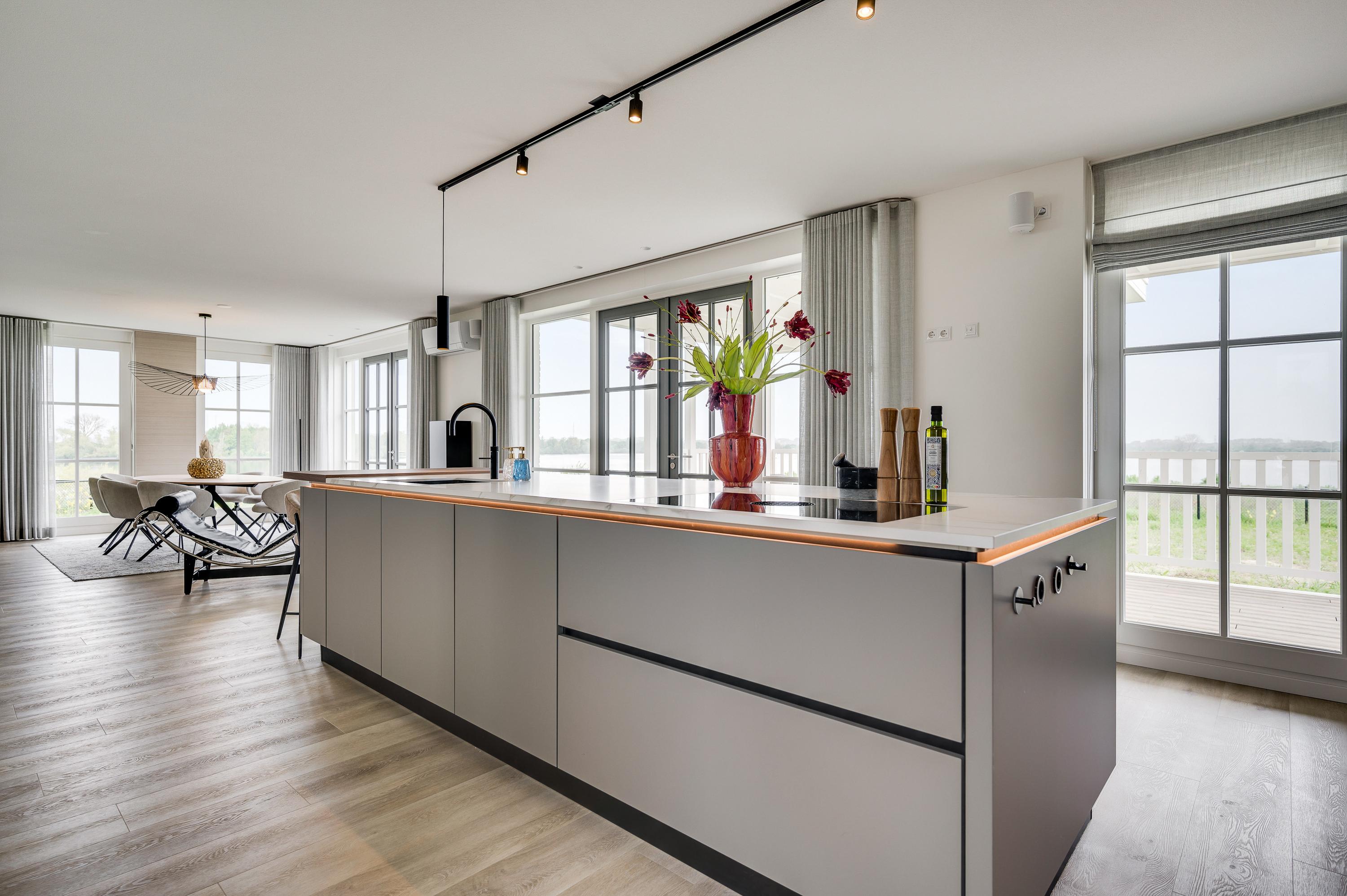 A bar has been created at the end of the island. Here you can enjoy a cup of coffee and the newspaper in the morning or the children can do their homework while you are cooking. All conveniences have been considered, such as a Quooker with hot and cold water, a Bora induction hob, a dishwasher, fridge, freezer and wine climate cabinet from Miele and an oven and microwave from AEG. The utility room is equipped with the white goods connections and has a door to the outside, so you don't have to go through the house with the groceries.