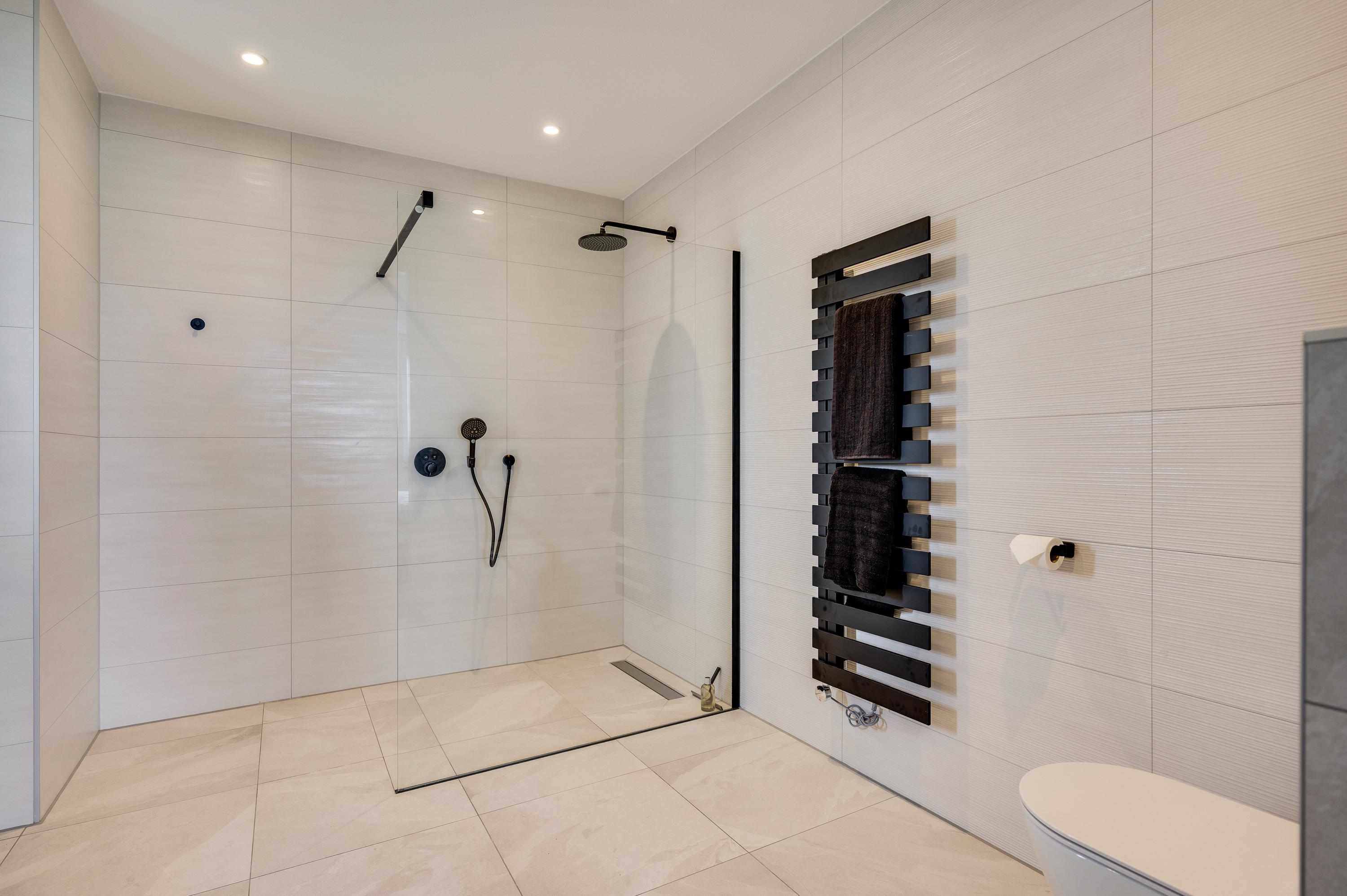 On the L-shaped second floor with high ceilings and a dormer window you will find bedroom 3 and 4. Both rooms are spacious and overlook the water. The third bathroom is also located here, which has a walk-in shower, sink and toilet. Finally, you will find the technical room here, where you will also find white goods connections.