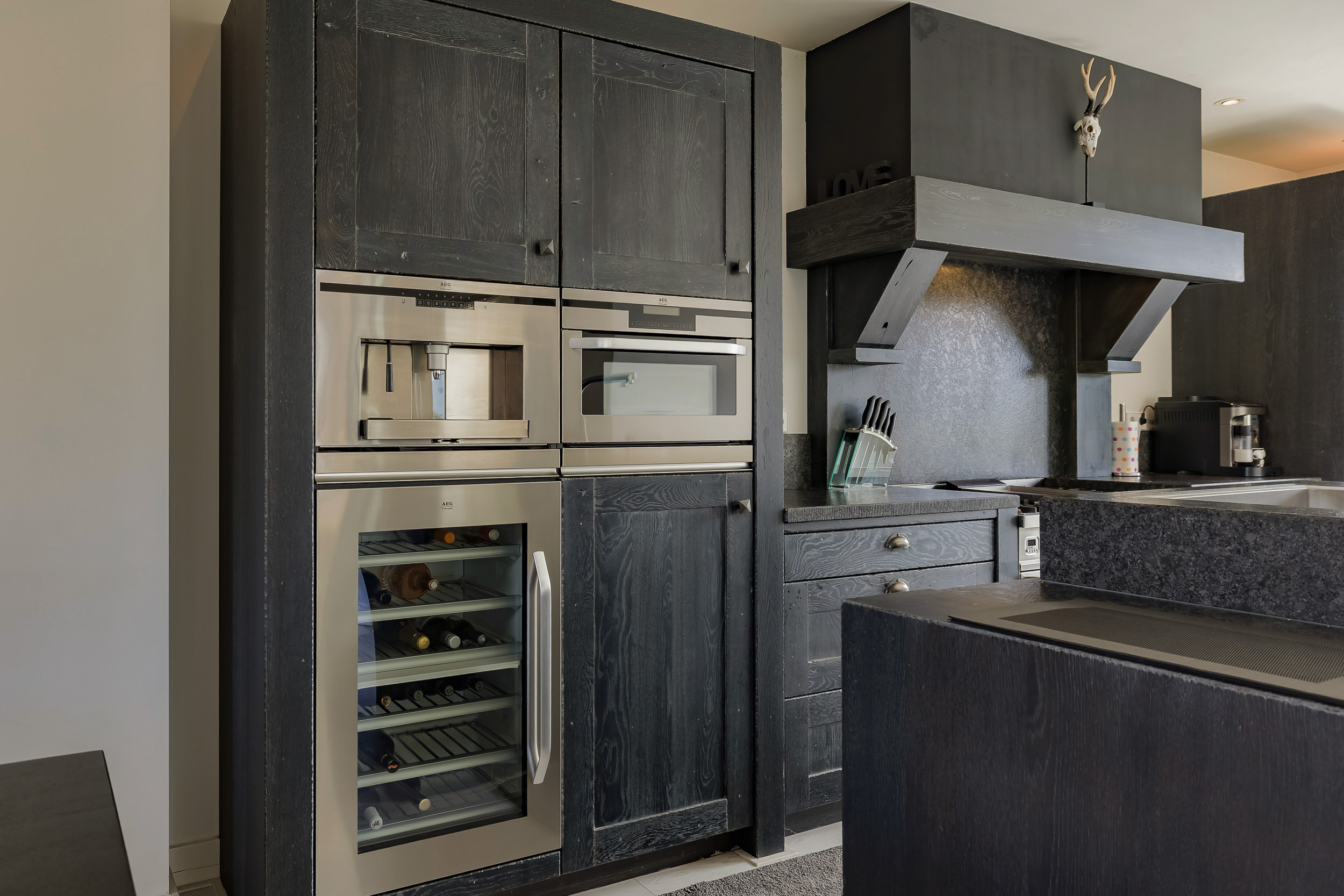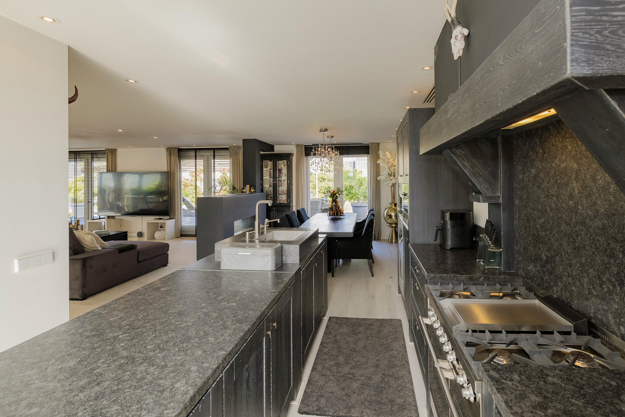 The live-in kitchen is a dream for the cooking enthusiast. Equipped with a central sink island and high-quality built-in appliances, this kitchen is perfect for cozy dinners or long evenings of dining.