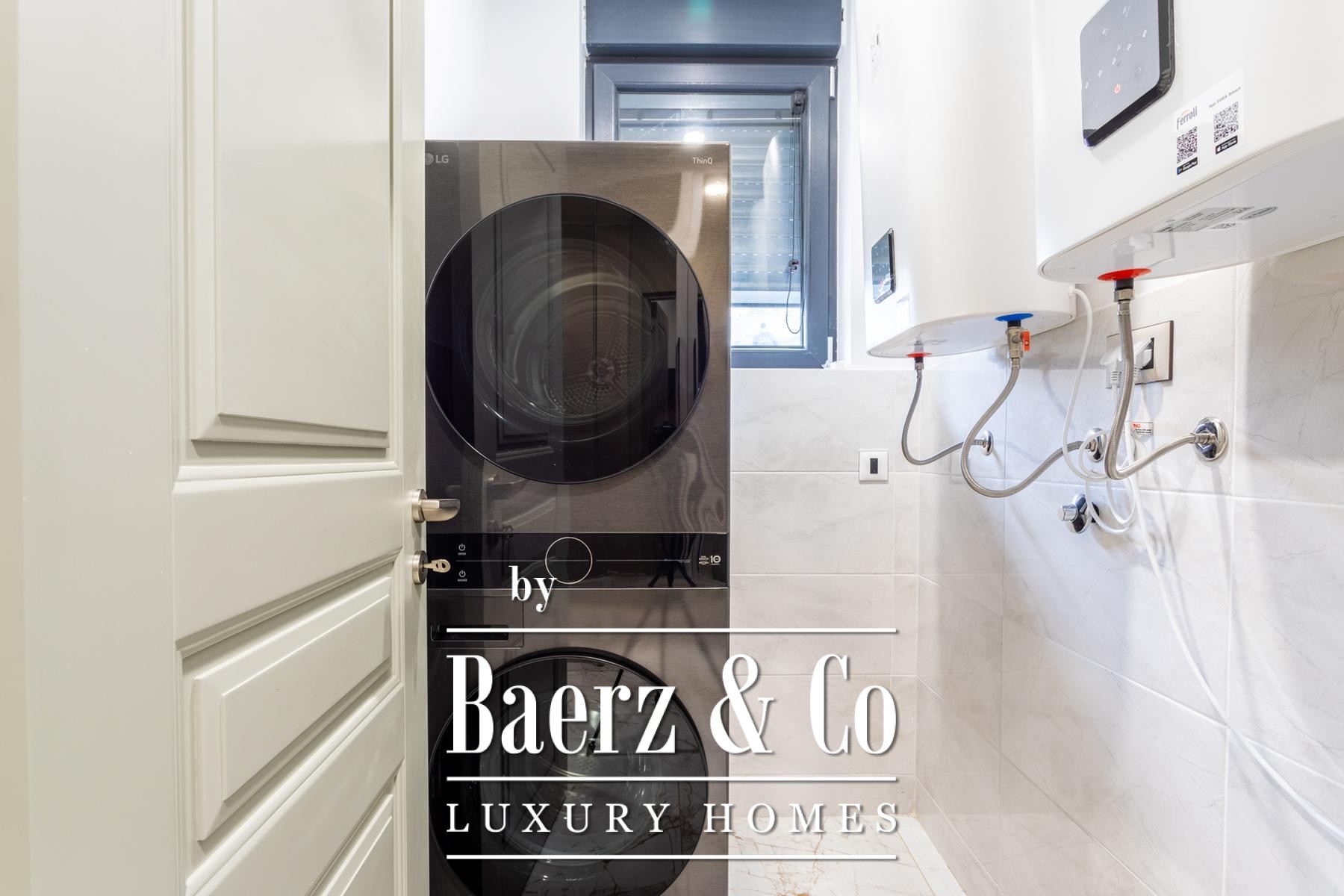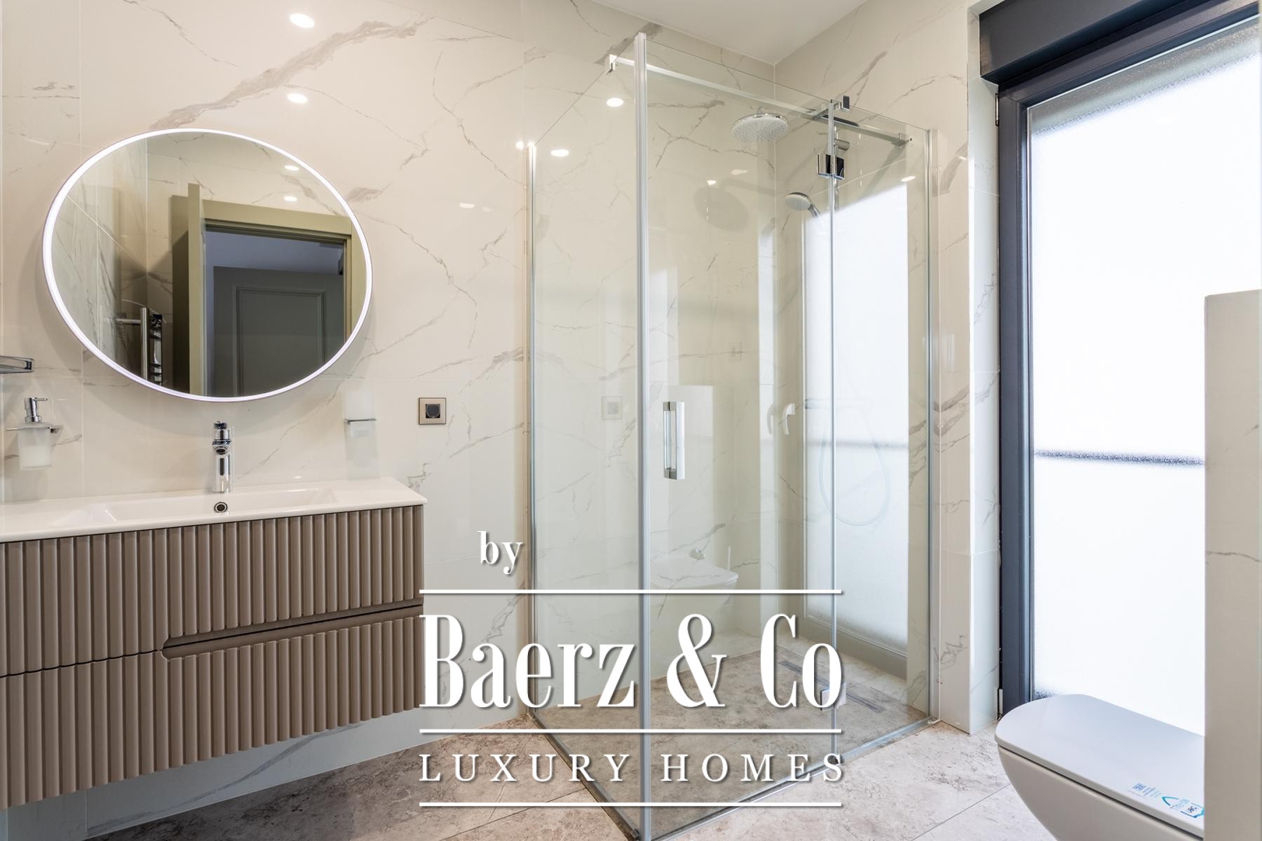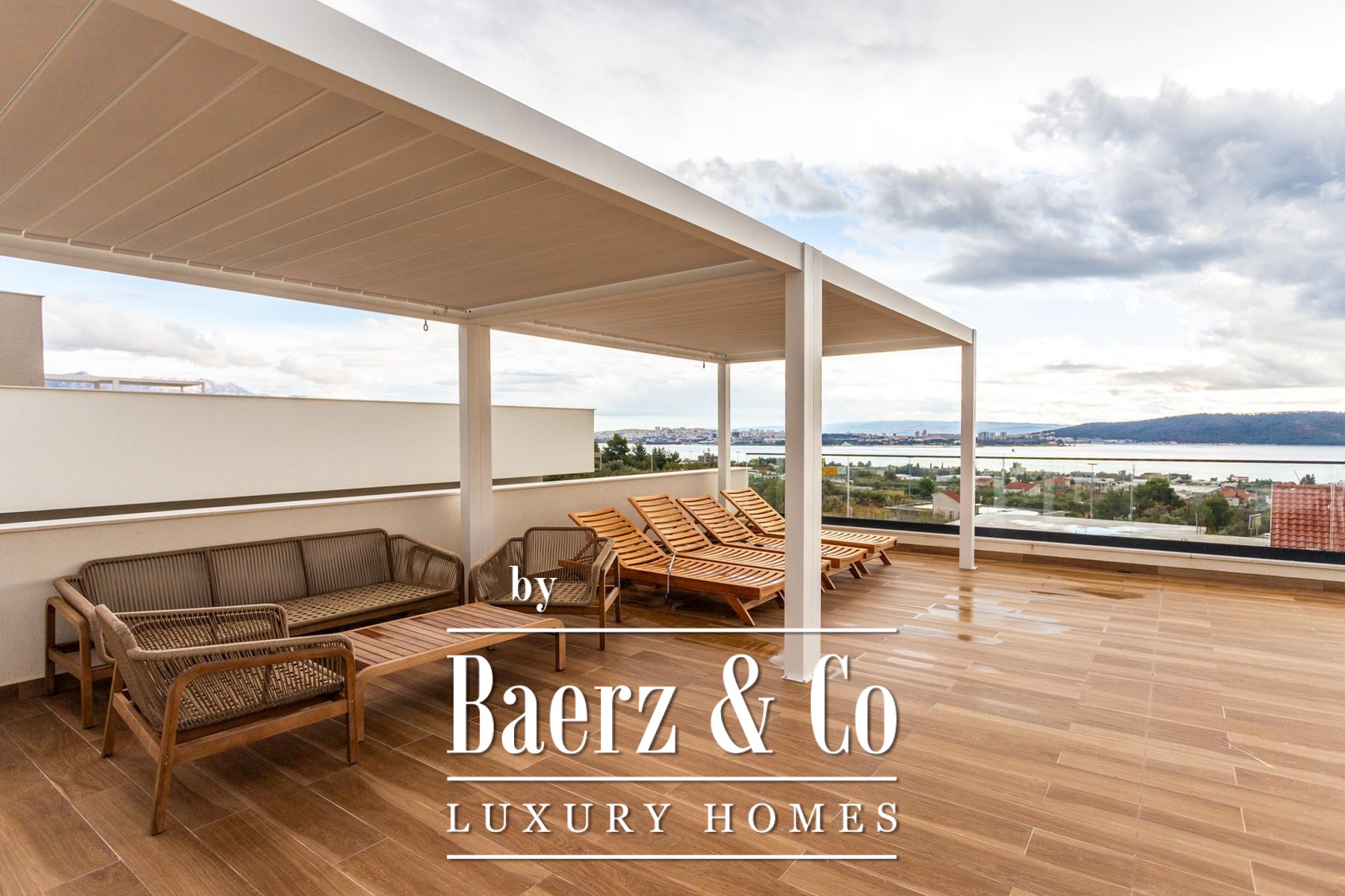 The journey concludes on a roof terrace that offers a jacuzzi, barbecue, and a sheltered relaxation corner for year-round enjoyment. Underfloor heating and individual air conditioning in all rooms ensure comfort in every season. The villa is available for purchase through a company structure, providing exemption from the local 3% property tax. This luxury villa for sale in Kaštela stands as a discreet retreat for those seeking light, calm, and panoramic perspectives above the Adriatic.