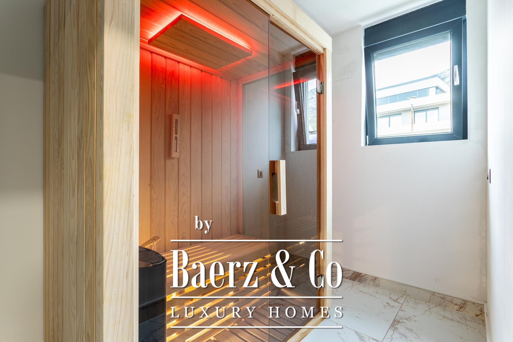 On the ground floor, a luminous open-plan living area welcomes you, featuring a fully equipped kitchen that integrates naturally with the terrace and garden. Every practical consideration is met, with a guest toilet, laundry room, storage, and a sauna positioned to the north. Ascend to the first floor to find four bedrooms, each en suite and each with direct access to an outdoor terrace, affording privacy and unbroken sea views.