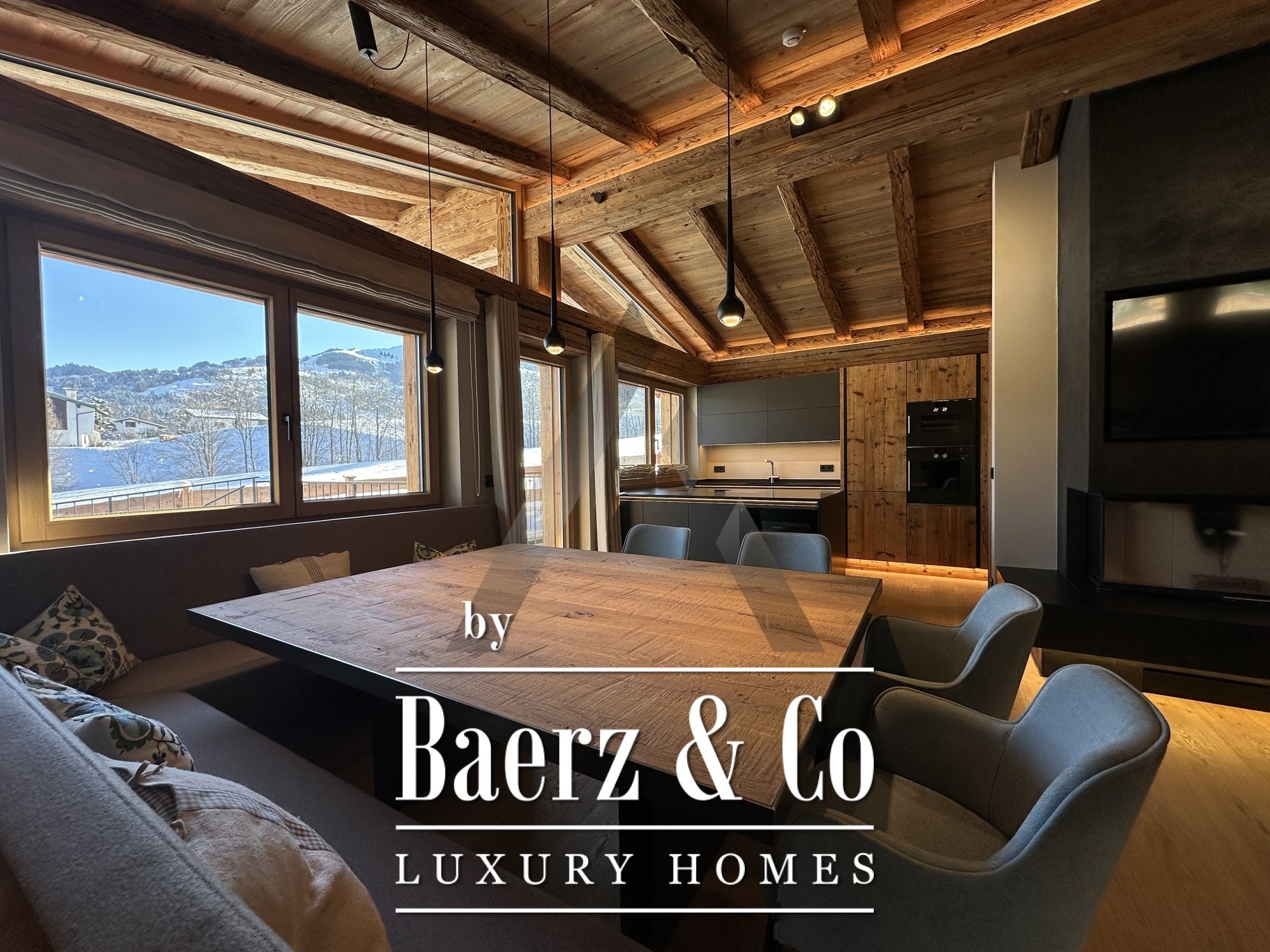 The chalets are delivered fully furnished, showcasing elegant finishes and first-class materials — from reclaimed wood beams and oak parquet flooring to Gaggenau, Miele, Bora and Liebherr appliances. Living spaces open to expansive terraces and balconies, some with private gardens, while amenities include wellness areas with sauna, fireplaces, Dornbracht bathrooms, alarm systems and advanced home technology. Layouts are tailored for comfort and guest privacy, with each unit featuring two underground or carport parking spaces and living room ventilation systems, and most offering elevator access.