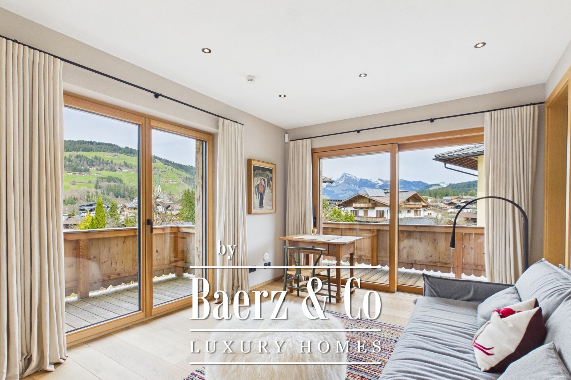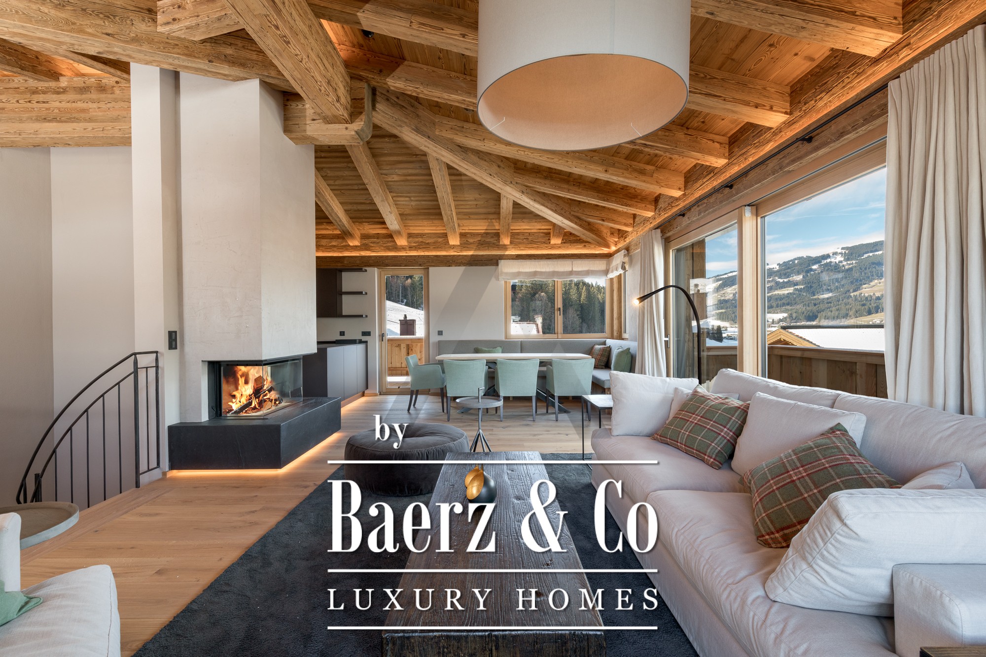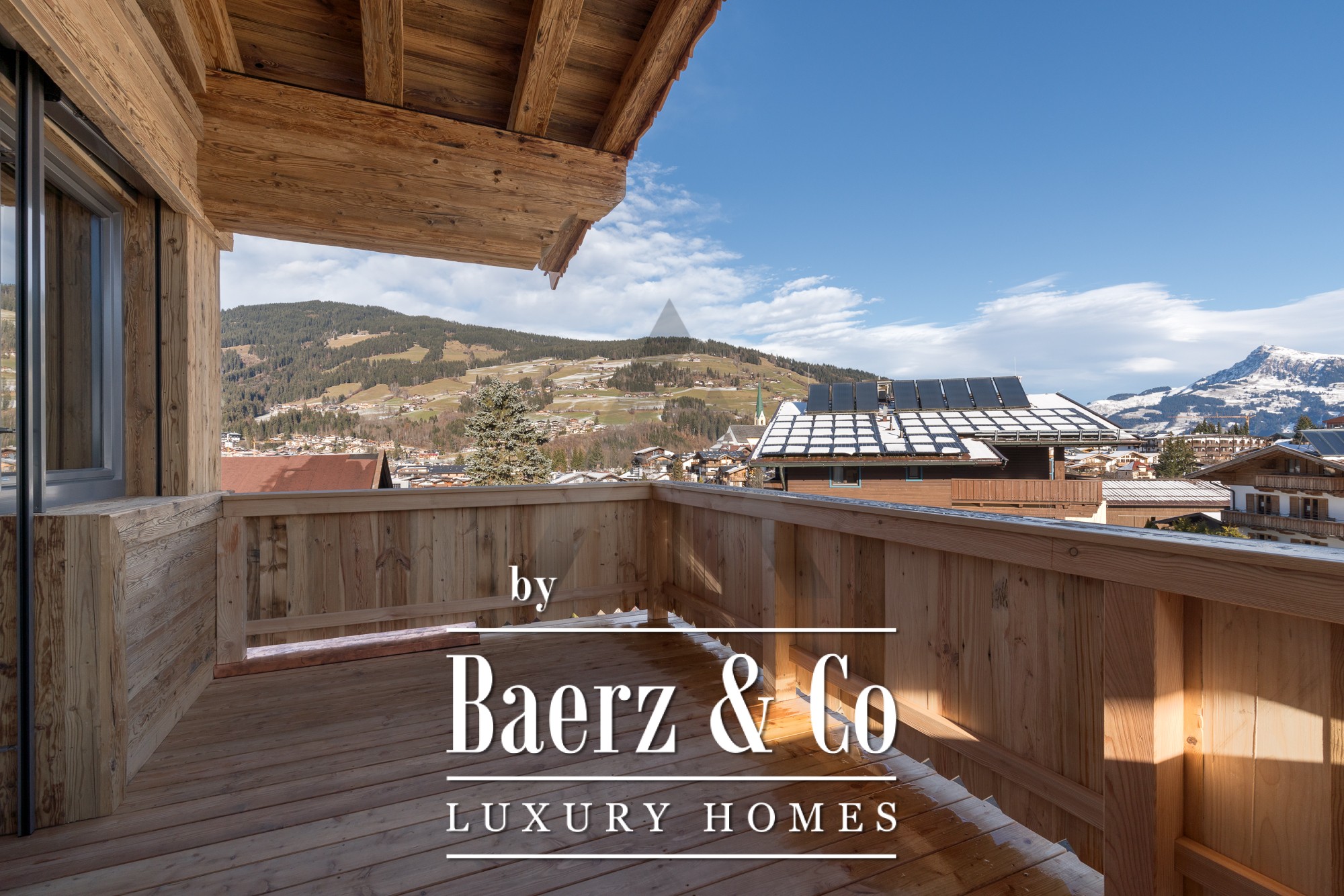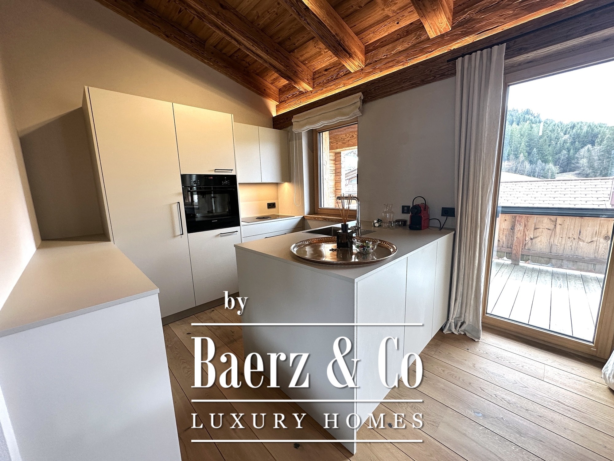 Further amenities include a covered parking space with an electric vehicle charging point, an additional outdoor parking spot, a spacious storage room with ski facilities and laundry, and advanced systems such as electric blinds, an alarm system, and a bus system. The penthouse is fully and luxuriously furnished, and rests in a tranquil, elevated cul-de-sac, moments from ski slopes and the town center, surrounded by the timeless beauty of Kirchberg in Tirol.