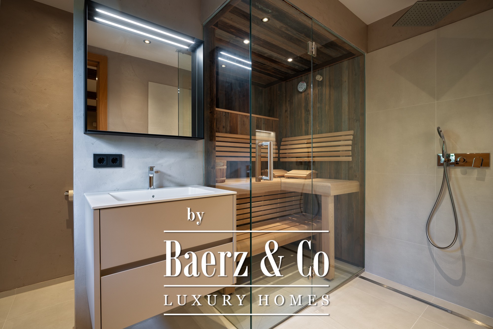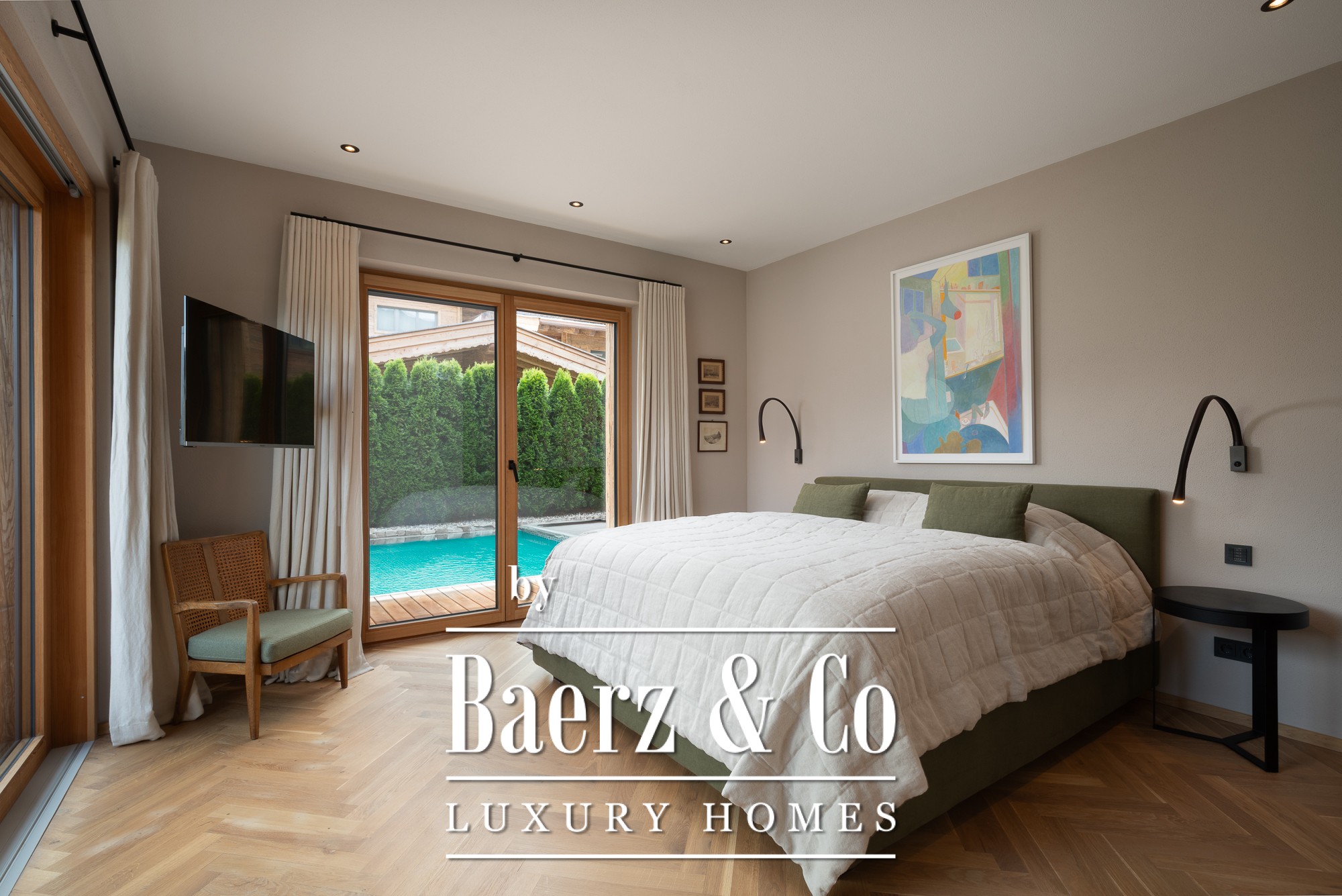 Two spacious bedrooms on the first floor each feature en-suite bathrooms and direct access to a secluded south-facing terrace, where a pool sets the stage for relaxation amidst views of meadows and the Kitzbüheler Horn, Fleckalm, Maierl, Gaisberg, and Hohe Salve mountains.