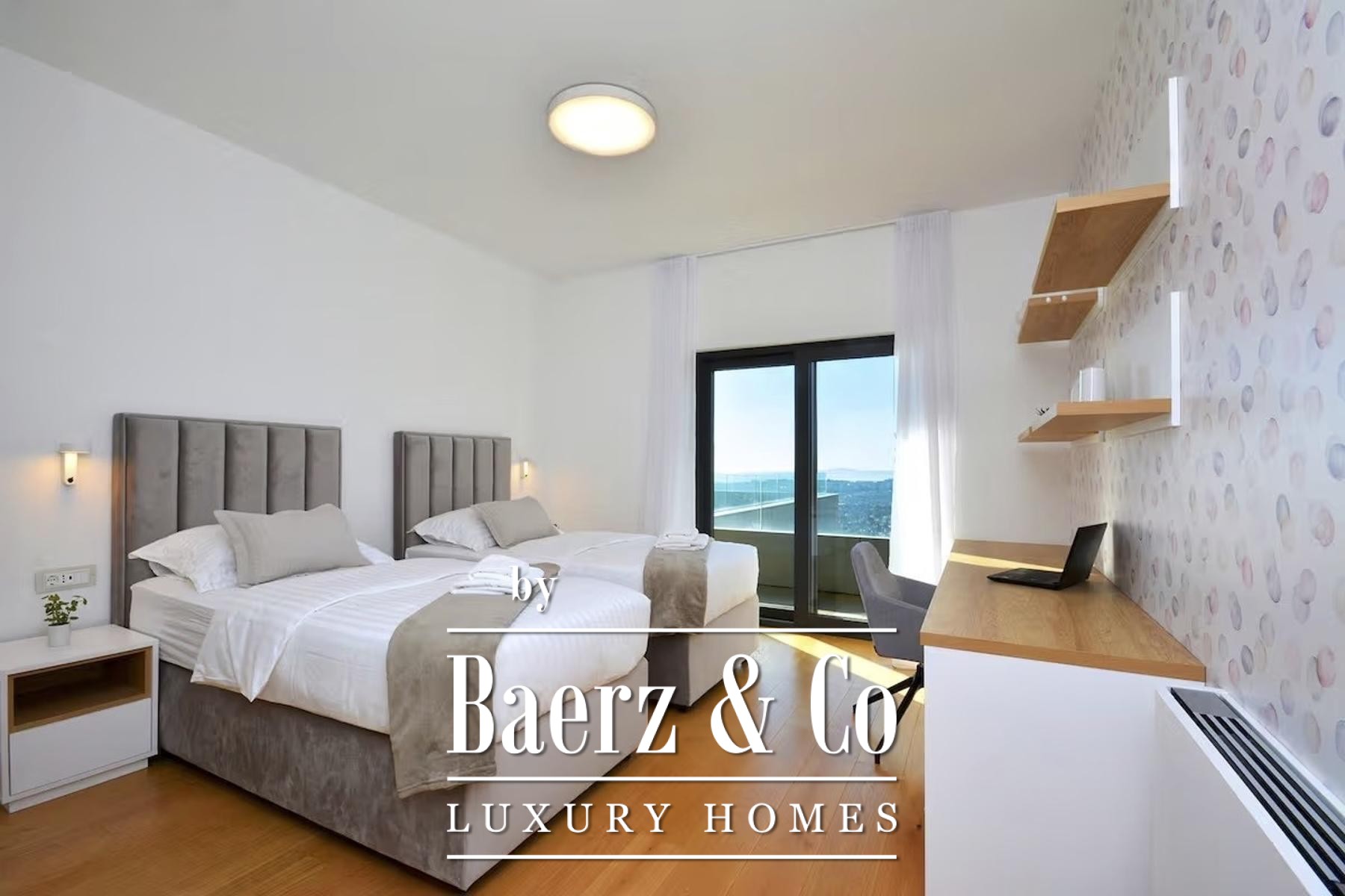 The first floor offers four bedrooms and two bathrooms, each room with access to a balcony and an expansive terrace, maintaining an unbroken connection to the sea. The villa’s 900 m² plot encompasses a two-car garage, additional private parking for four vehicles, and a beautifully landscaped courtyard.