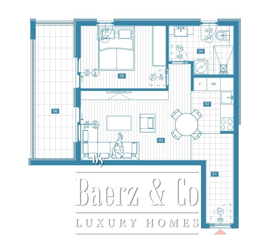 Inside, the apartment is structured with clarity: a hallway opens into the living space where kitchen and dining merge, leading to a bedroom, bathroom, and a private terrace. Finishes will be delivered complete throughout the floors, tiles, and bathroom, with equipped air conditioning providing seasonal comfort. The residential project features its own pool, and a direct asphalt link brings a measured ease to coastal exploration.
