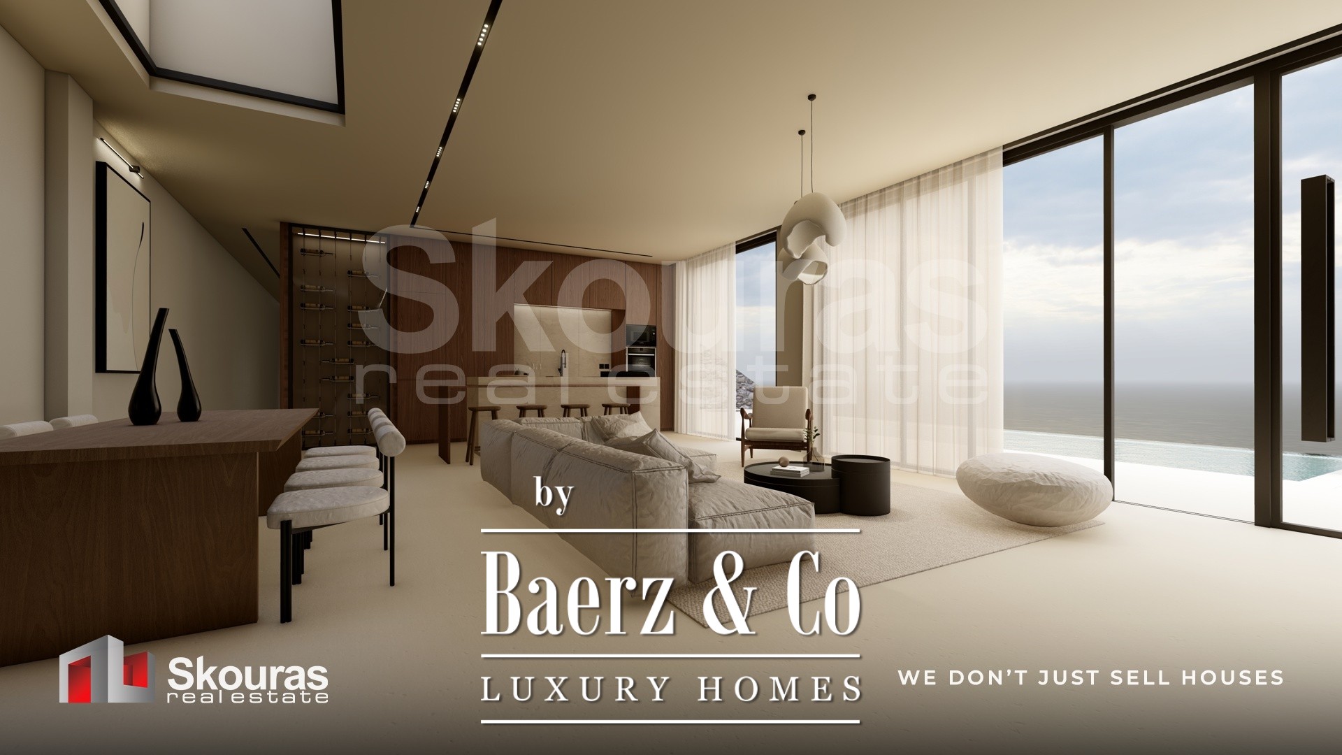 The villa features three generously proportioned bedrooms, each with its own en-suite bathroom and walk-in closet, ensuring both autonomy and refinement for residents and guests. Expansive glazing defines the open-plan living area, drawing in sea views and natural light, while the modern kitchen and dedicated wine cellar create a setting attuned to quiet luxury. Smart home technology elevates the experience of daily living.