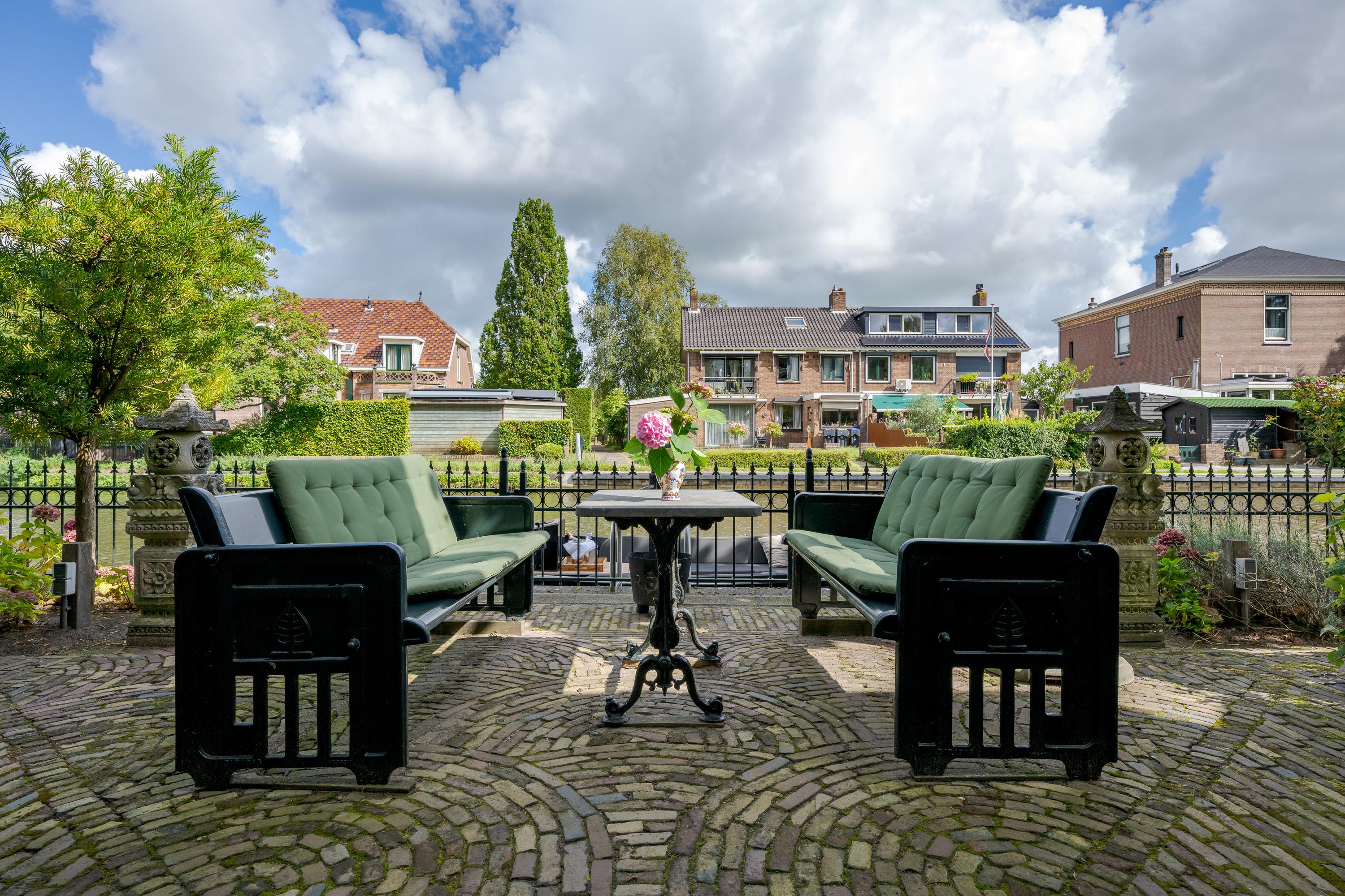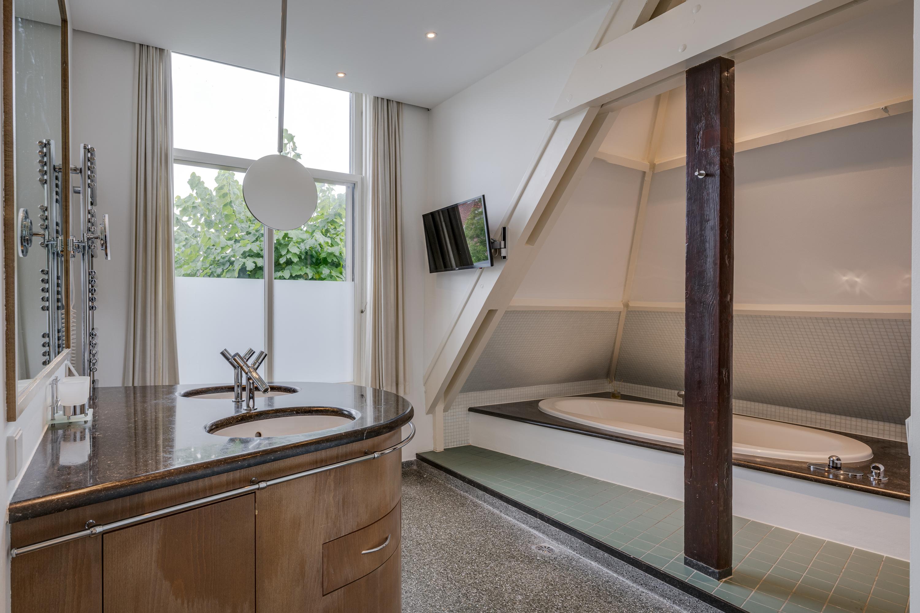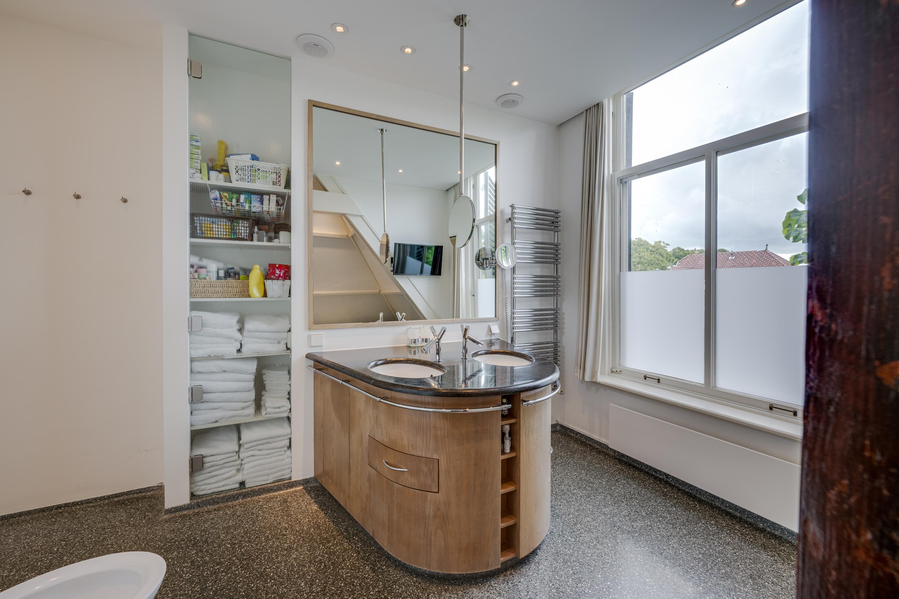 Upstairs, four serene bedrooms offer leafy, water-facing perspectives; the master suite includes a walk-in wardrobe and a refined bathroom featuring granite floors, underfloor heating, a sunken bath, sauna, and Turkish bath. Three bathrooms in total assure comfort and privacy. The estate’s boathouse allows effortless river access, opening leisure to the waterways of De Kaag and the Groene Hart.