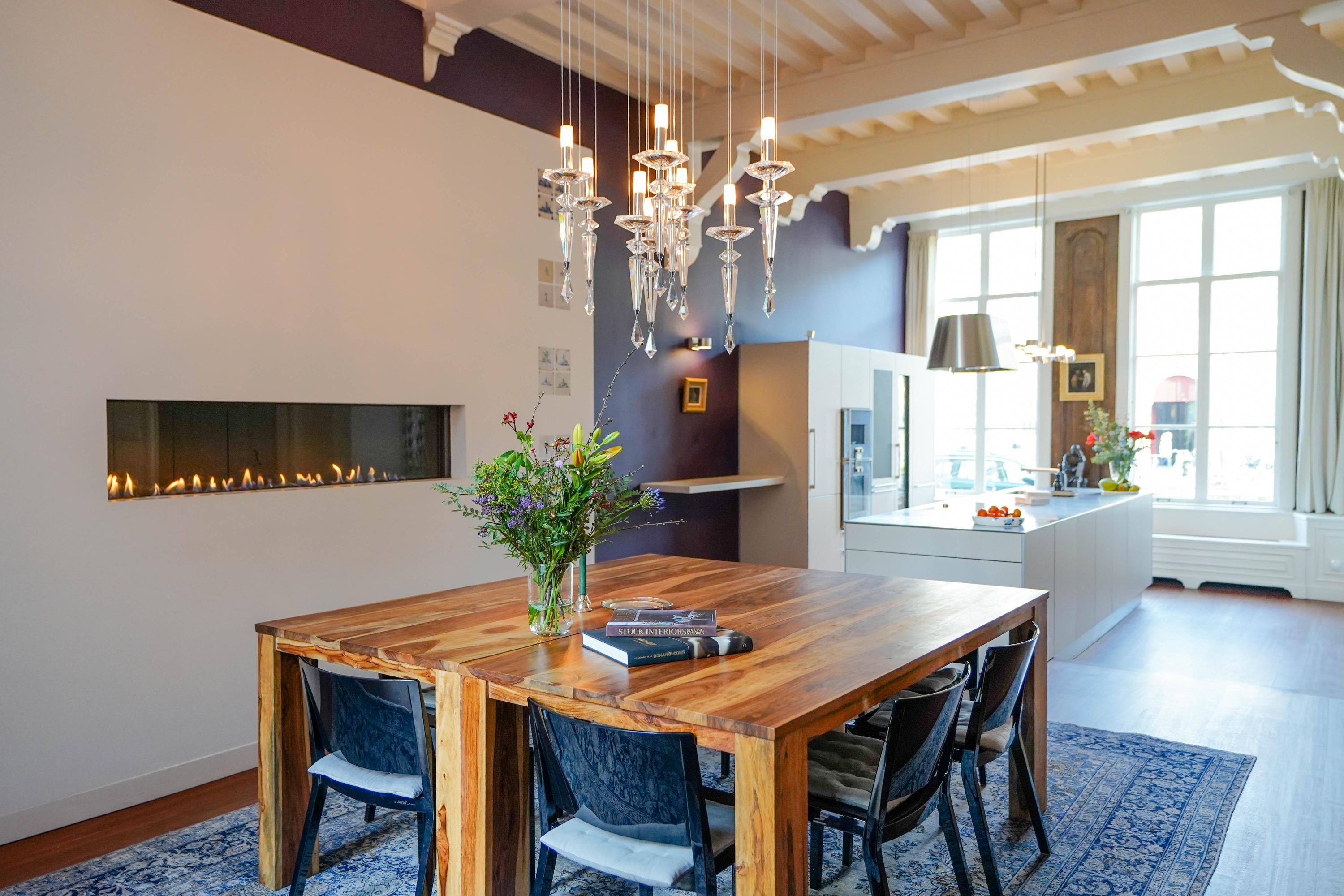 intimate sitting room surrounding the fireplace; at the front is a spacious living room, three windows wide, with a magnificent view of the canal and the historic cityscape.