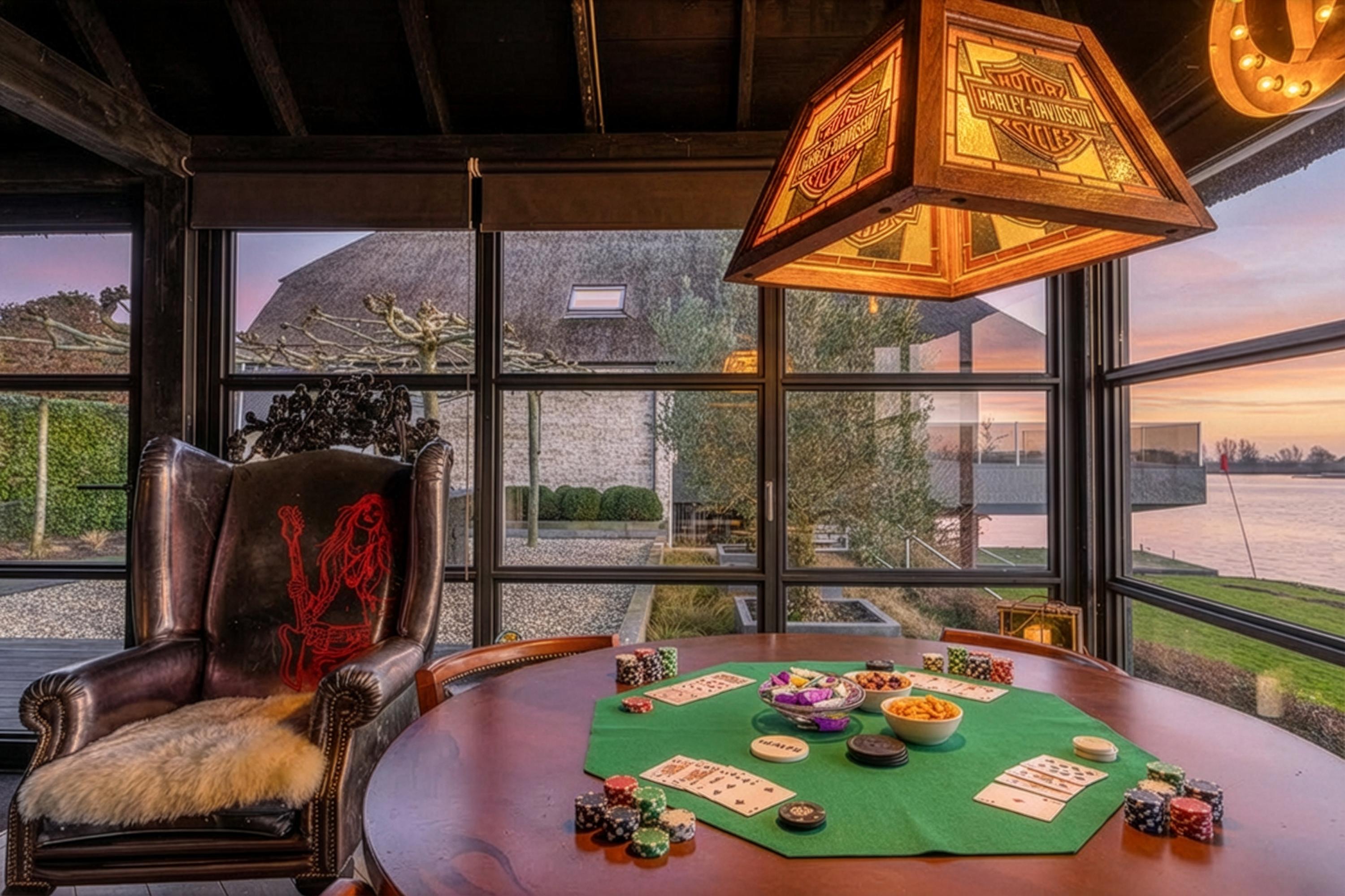 De Werf 5 in Lekkerkerk is a home for people who know what they want. Peace, space, water at your feet and comfort at a high level. This thatched villa is located in a truly rare spot, directly on the river Lek, with its own private jetty and boat lift. Here, you can step straight from your garden onto the boat and sail towards the Biesbosch, Dordrecht or Rotterdam. The view over the water never gets old and changes every moment of the day. This is living with allure, freedom and privacy.