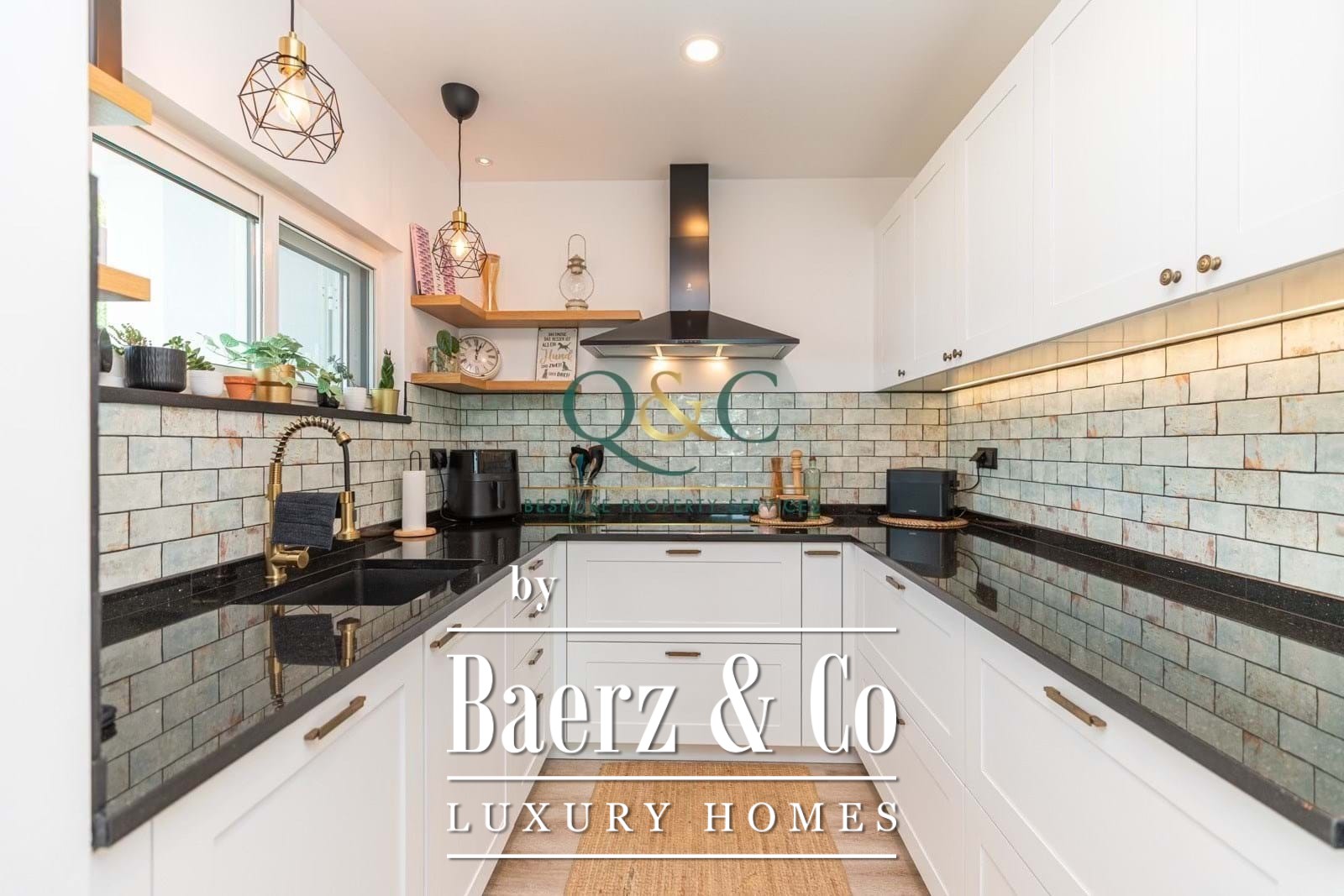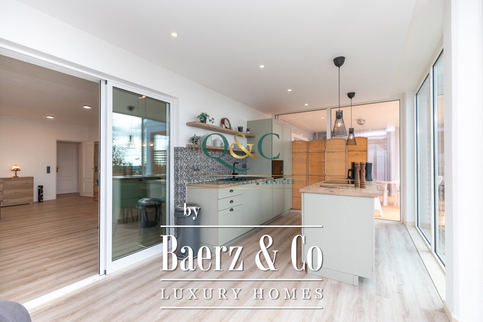 The lower floor hosts two independent apartment units, each with its own kitchen, living area, bedroom, private terrace, and garden access. One apartment enjoys a conservatory with coastal vistas, suitable for guests, family, or rental.