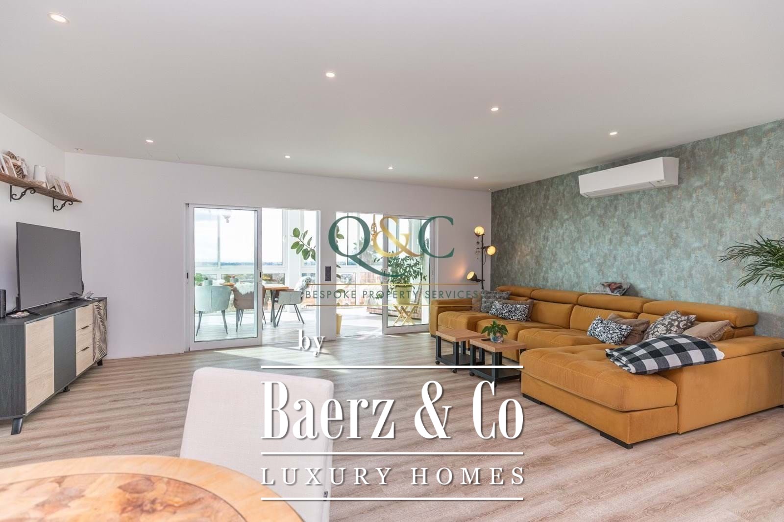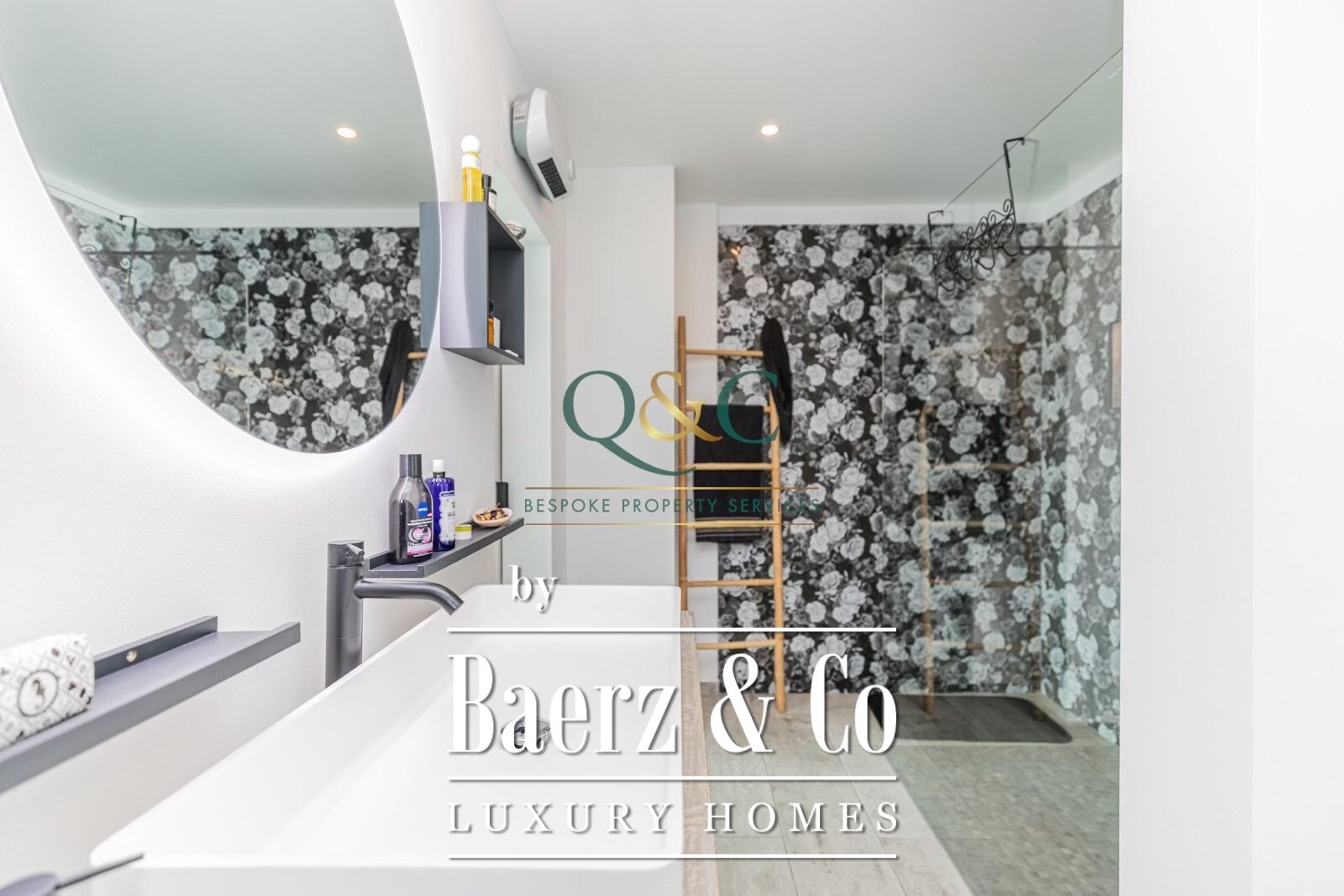 Built in 2009 to Swiss SIA technical standards and recently enhanced, the villa provides 414 m² of immaculate living space across two levels. Arriving through a gated entrance, guests are met with a sense of discretion and secure privacy. The main floor features an entrance hall, two generous en-suite bedrooms, a contemporary open-plan living and dining area with pellet stove, and a modern kitchen opening directly onto a southwest-facing terrace with pergola. New floor-to-ceiling glazing in the conservatory frames panoramic coastline views, while the swimming pool and terrace below offer seamless outdoor living.