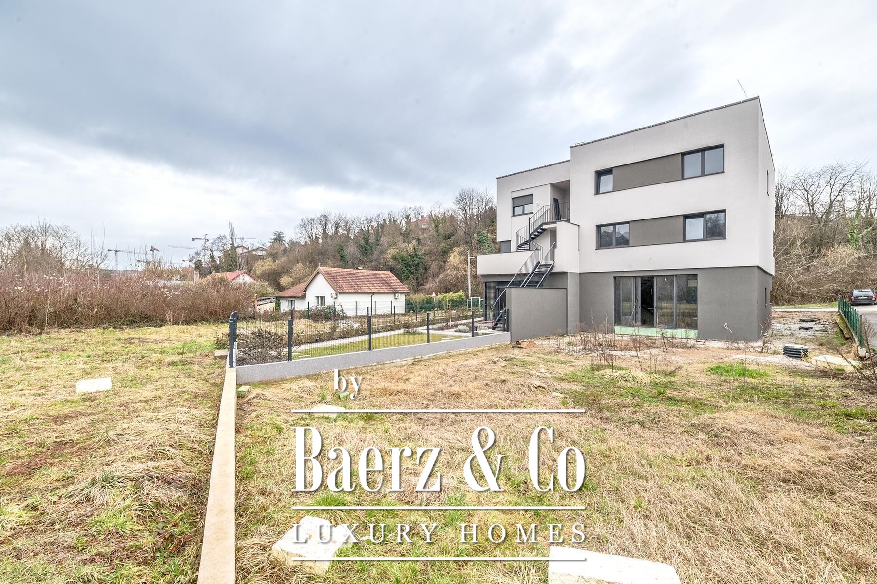 Schüco PVC joinery further enhances insulation and quietude. Set on a 300 m² plot, the property balances peace and community, with good access to central Zagreb and the essential amenities nearby. This luxury semi-detached house for sale in Maksimir offers a combination of privacy and proximity, underscored by discreet garden spaces and an understated architectural solidity.