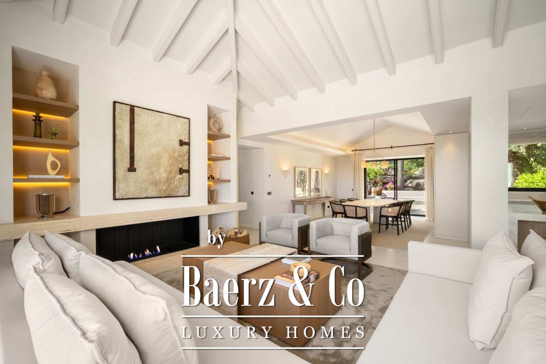Villa Marbella with Sea and Mountain Views sits quietly in Nueva Andalucía, minutes from Los Naranjos Golf Course and close to Marbella’s celebrated beaches and dining. This fully renovated single-level villa, with 241 m² of living space and set on an 855 m² elevated plot, captures the essence of Mediterranean life. The main living area is defined by its open-plan design, vaulted ceilings, and a palette of soothing natural tones. Light moves freely throughout, courtesy of floor-to-ceiling glass doors that lead to a generous terrace, where an infinity-edge pool appears suspended above the valley. From both inside and the rooftop terrace, expansive views reach across the valley to meet the sea.