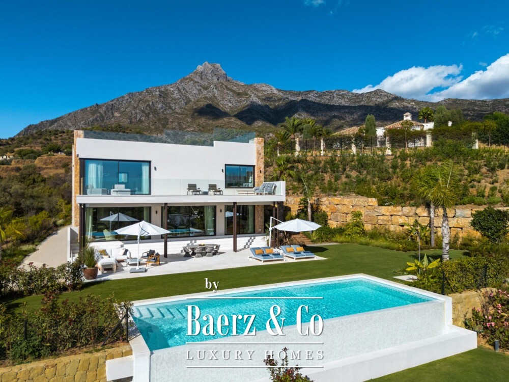 Villa Marbella Hill Club with sea and mountain views is an invitation to refined living on the edge of Marbella's Golden Mile. This newly constructed villa spans 825 m² across a generous 3,559 m² plot, shaping an atmosphere of both composure and quiet opulence. The interiors are tailored to this individual property, with a calm neutral palette and natural materials like wood and marble imparting a harmonious sense of luxury.