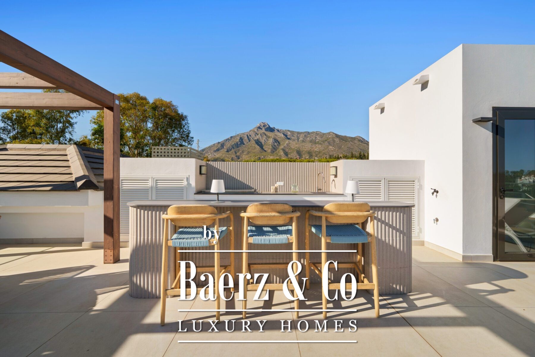 Expansive spaces include a formal dining room, a designer kitchen, and a refined entertainment lounge, each flowing with understated elegance. Private bedroom suites—each with its own bathroom—provide sanctuary, while the master suite introduces a spa-inspired bathroom with a freestanding tub and sweeping views of La Concha mountain. Outdoor living is both private and impressive, featuring multiple terraces, a rooftop lounge with Jacuzzi, and an infinity pool, all framed by landscaped gardens on a 1,556 m² plot.
