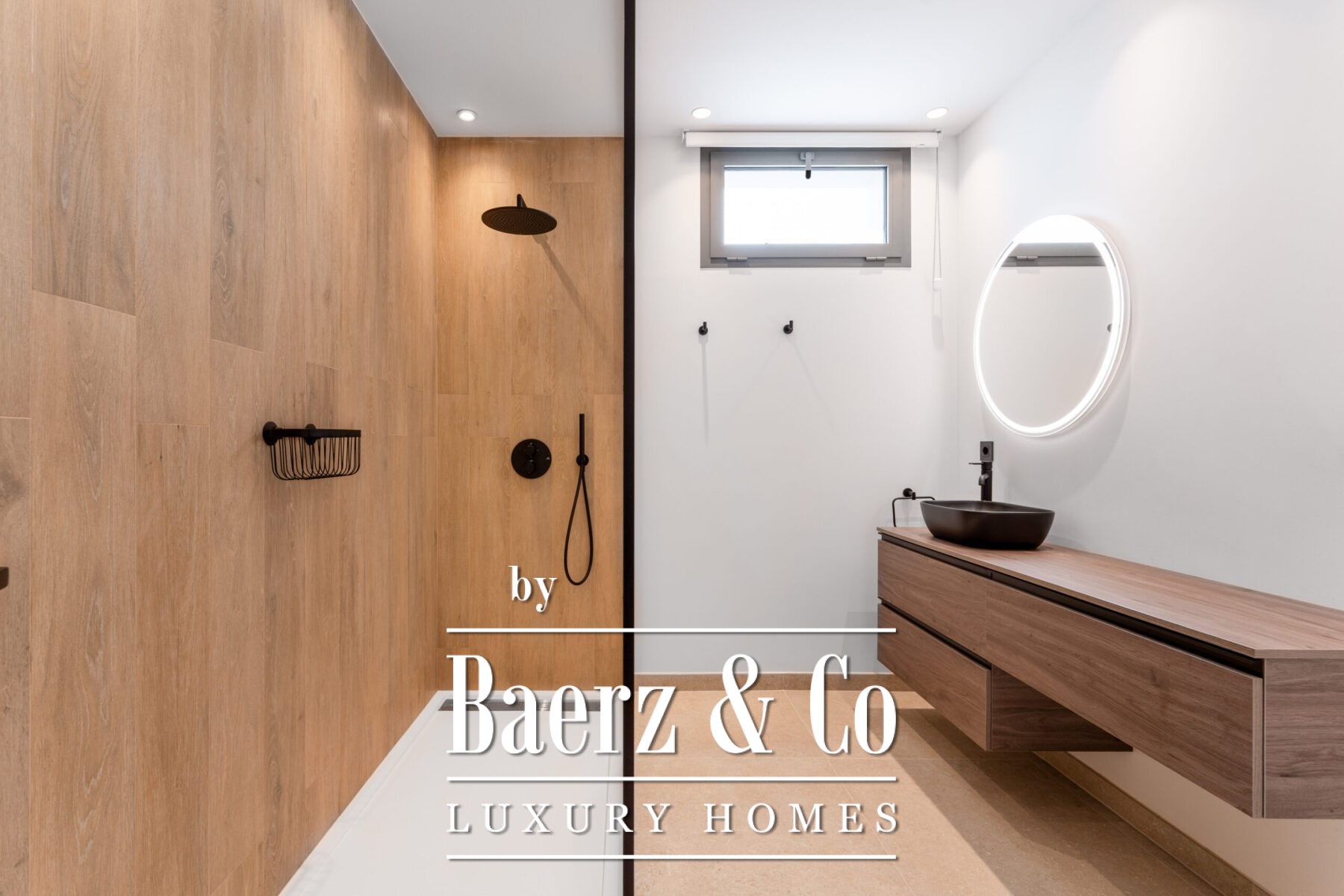 With a southwest orientation, the villa captures natural light and sunset views across the valley. Entering through a grand circular driveway that accommodates 10 cars, the sense of arrival is quietly impressive. The 453 m² interior unfolds into bright, open-plan spaces featuring soaring ceilings, wood accents, and elegant tile work that enhance a warm, inviting atmosphere. Three en-suite bedrooms on the main level have large windows opening directly onto terraces, seamlessly connecting indoors to a 1,340 m² plot with manicured gardens. The lower level offers two additional bedrooms, a games room, a lounge area, and a fully fitted laundry room, ensuring both social space and privacy.