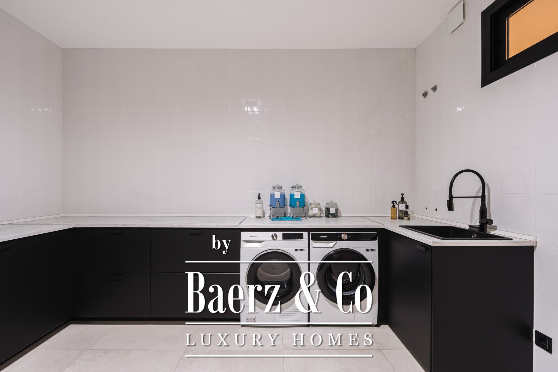 The ground floor includes a vast basement area accommodating a three-car garage, storeroom, and additional parking, enhancing both security and convenience. A comprehensive alarm system, security shutters, and private gates reflect a rigorous approach to privacy.