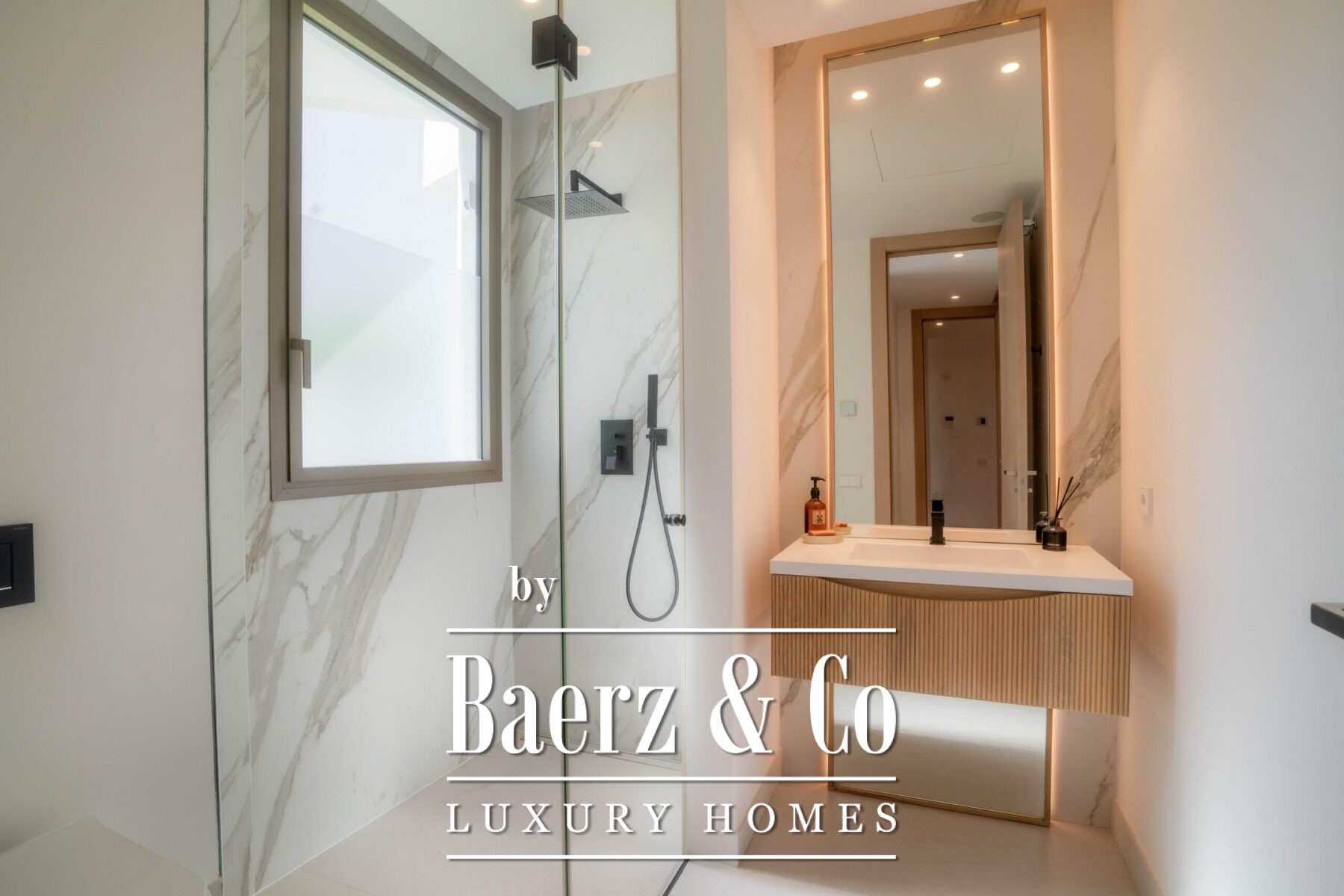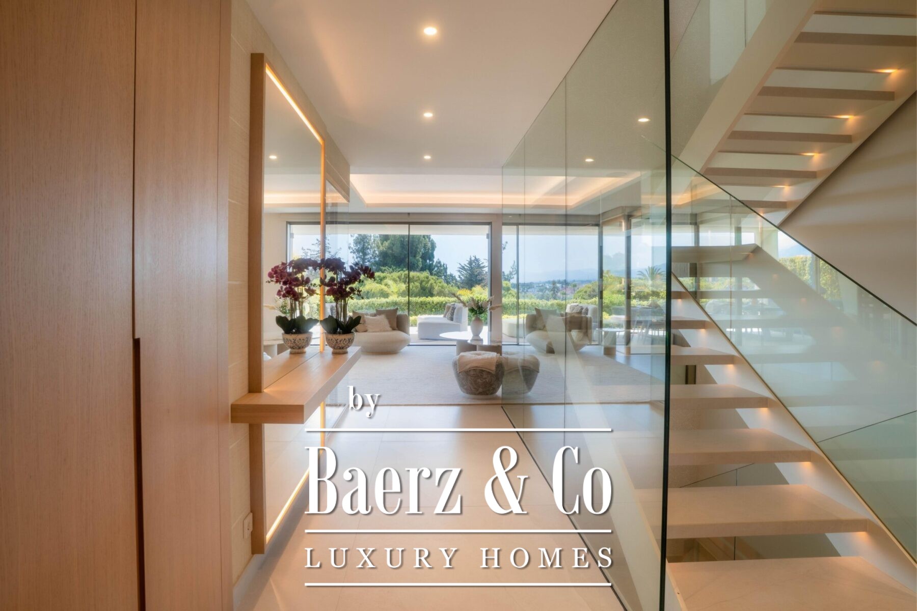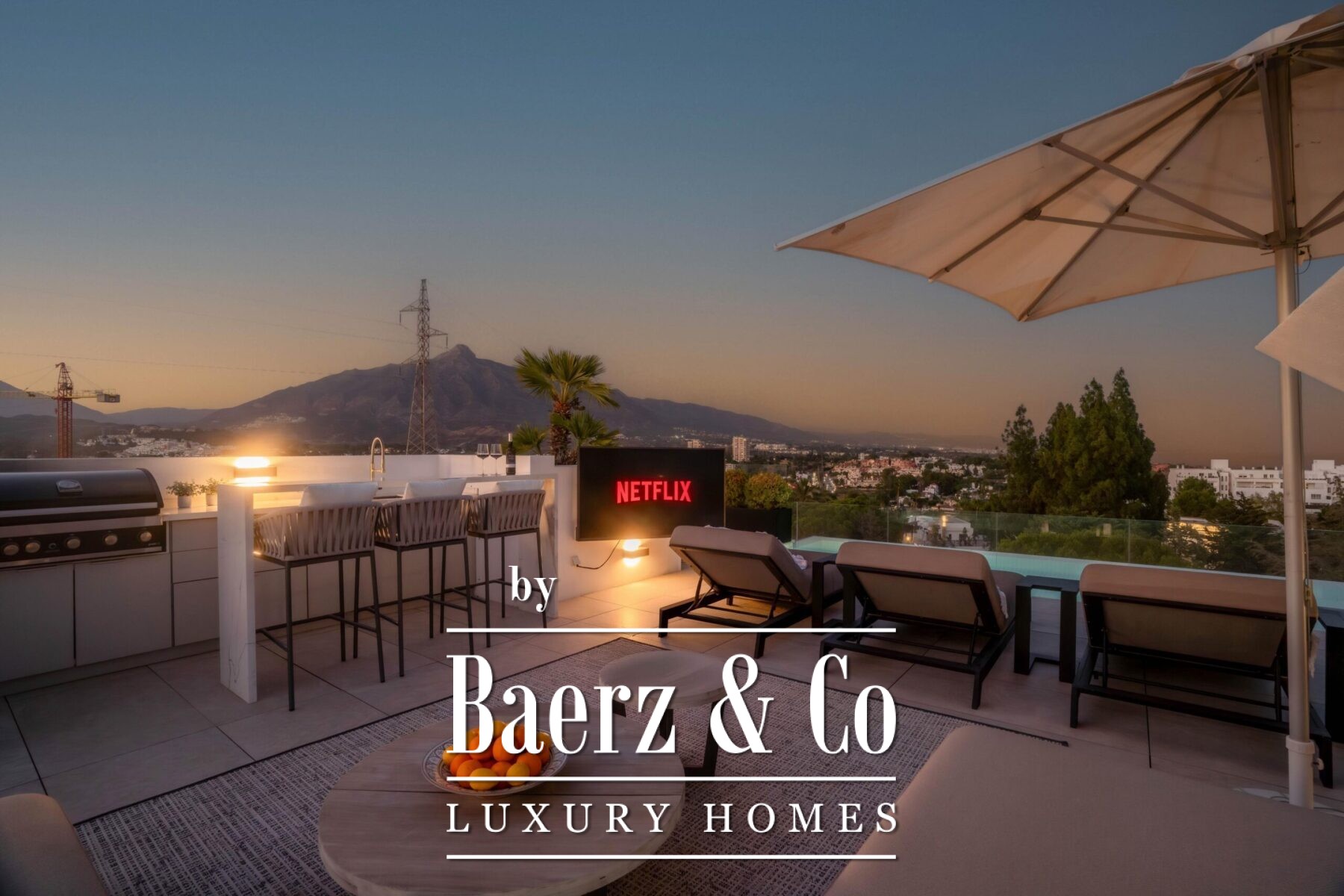 Generous living areas connect to a covered terrace designed for seamless indoor-outdoor living. The custom rooftop solarium, complete with a private plunge pool, opens up panoramic views over the Golf Valley and the iconic La Concha mountain. A private elevator links each of the four levels, allowing effortless access throughout, while the fully equipped Siematic kitchen invites convivial gatherings.