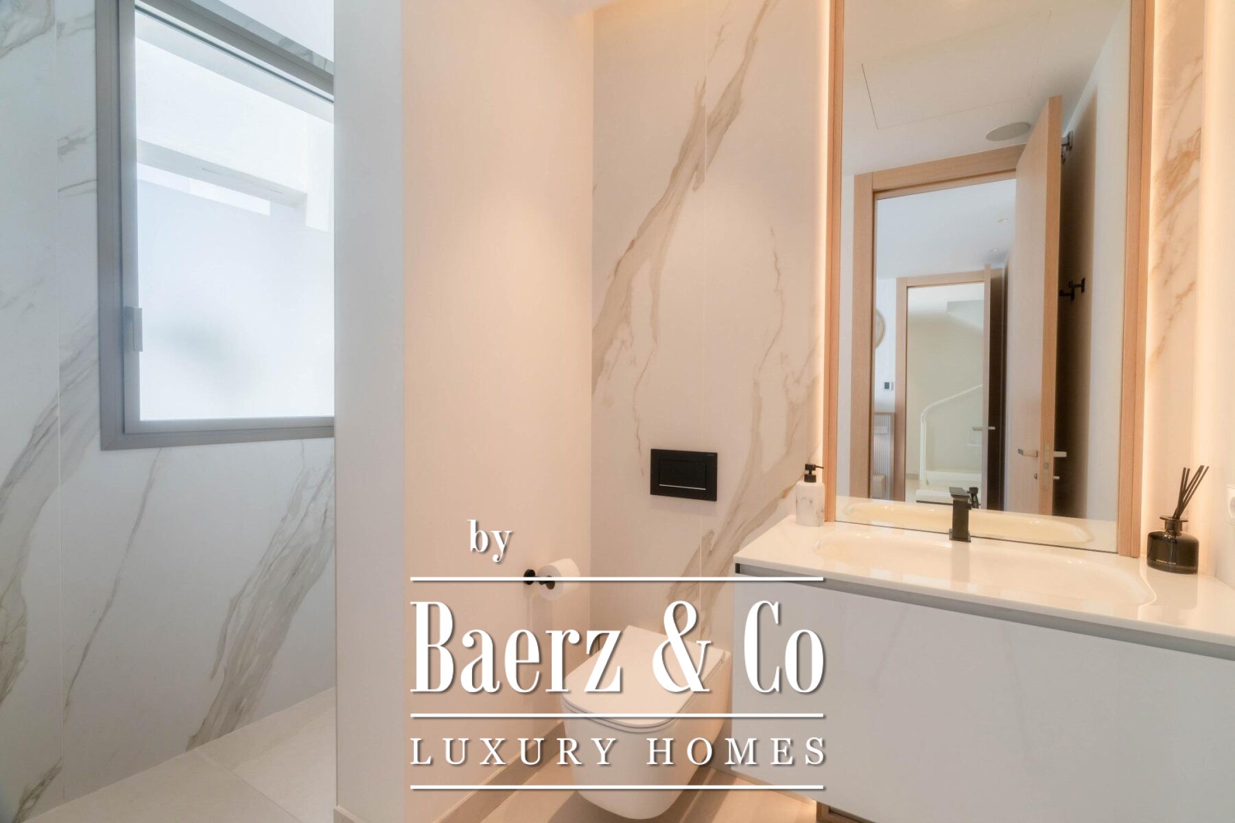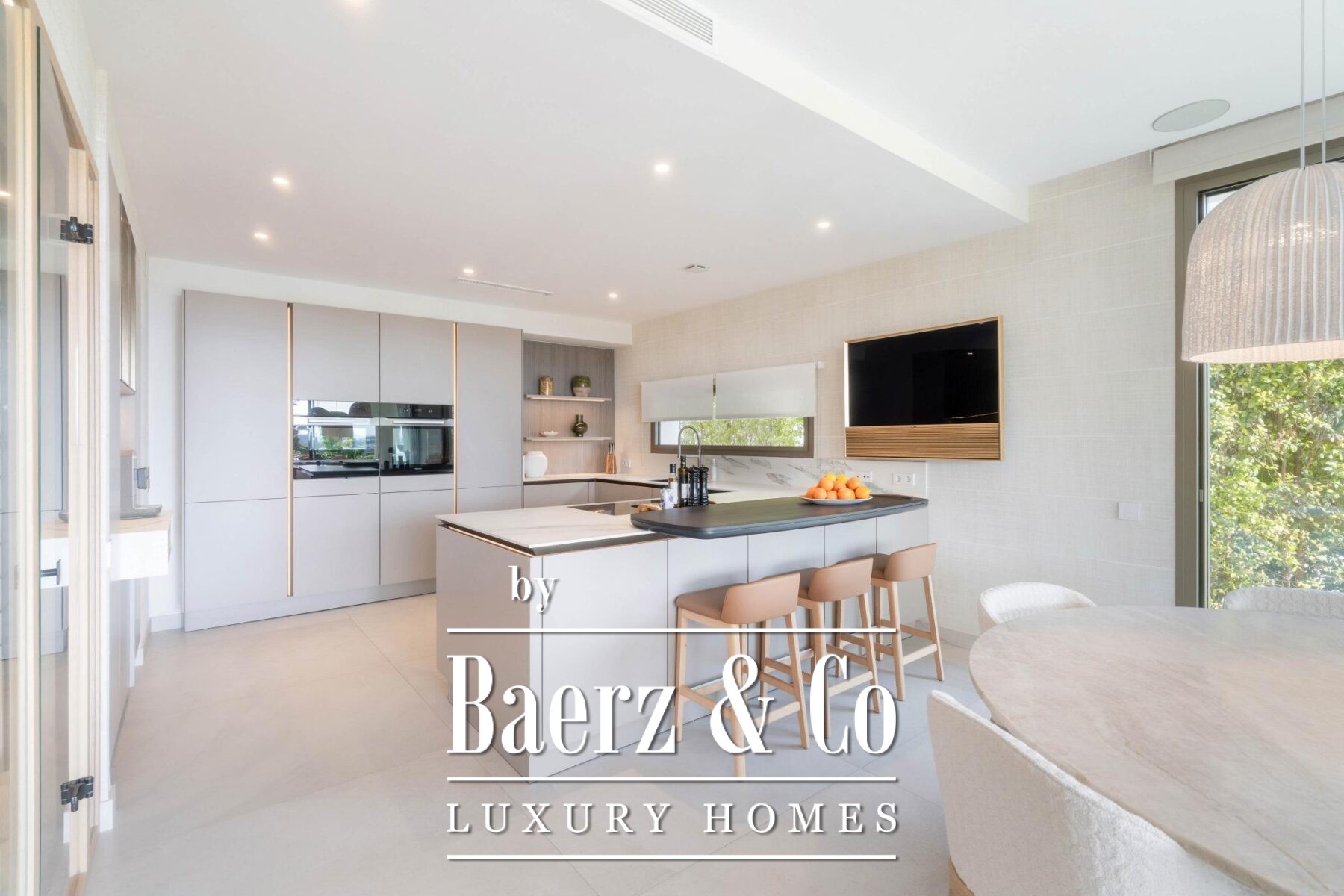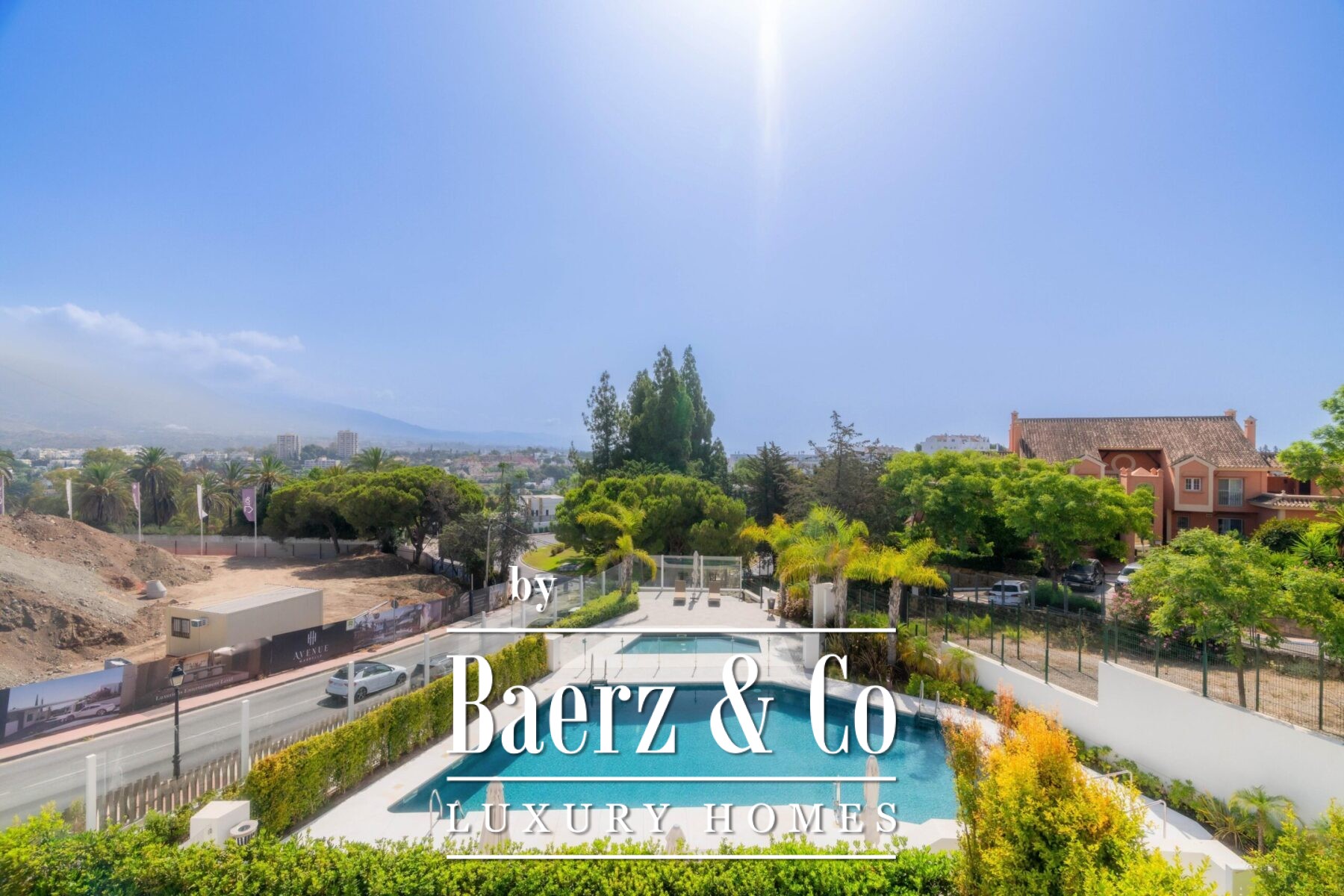 Generous living areas connect to a covered terrace designed for seamless indoor-outdoor living. The custom rooftop solarium, complete with a private plunge pool, opens up panoramic views over the Golf Valley and the iconic La Concha mountain. A private elevator links each of the four levels, allowing effortless access throughout, while the fully equipped Siematic kitchen invites convivial gatherings.
