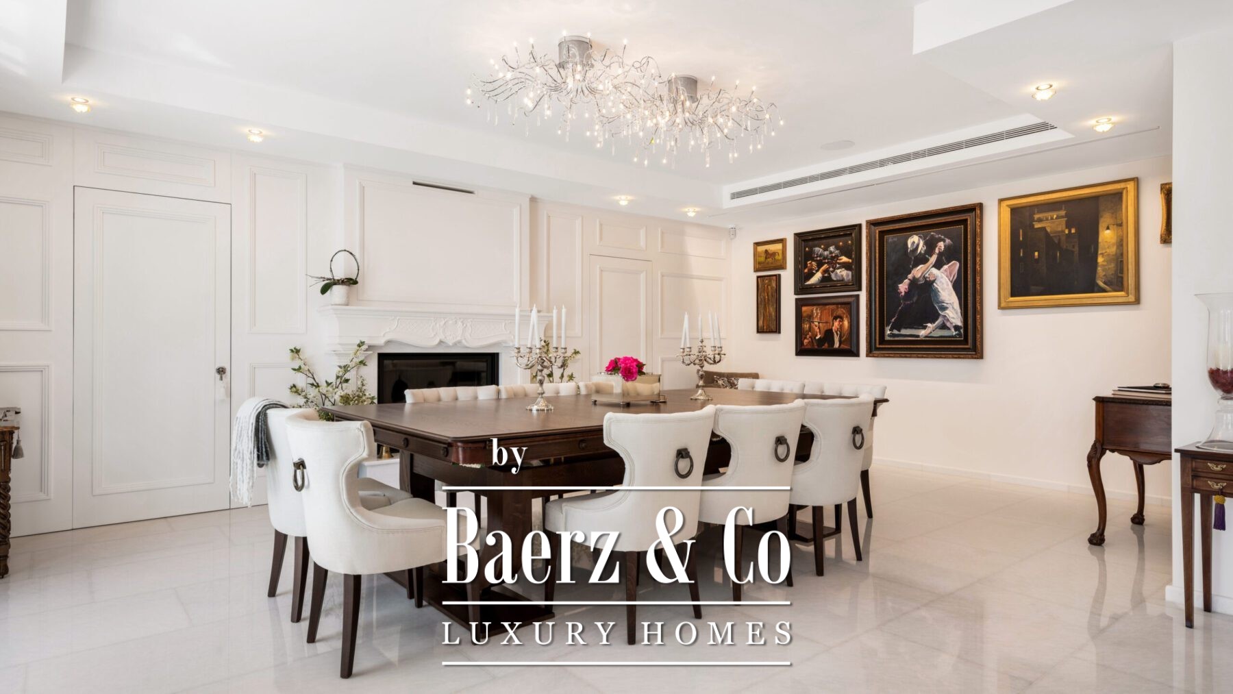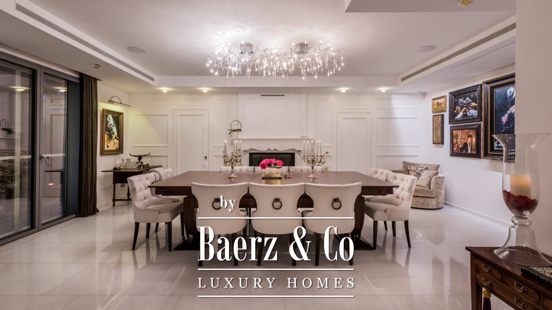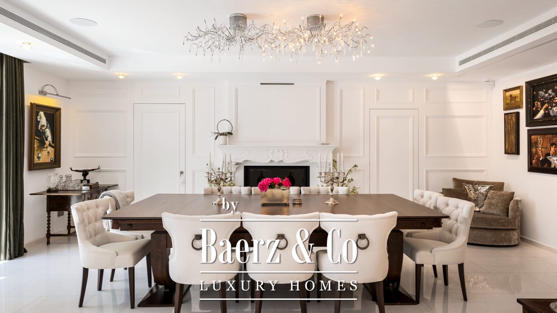 The main living area sets a welcoming tone, anchored by a stylish curved sofa, a sleek fireplace, and curated artwork. A formal dining space with long wooden table, twin chandeliers, and another fireplace creates an elegant setting for entertaining. The kitchen is equipped with taupe cabinetry, dark stone countertops, and an island cooktop. Adjacent dining and lounge areas feature exposed wood beams, a bar, and direct connection to gardens, terraces, and the pool.