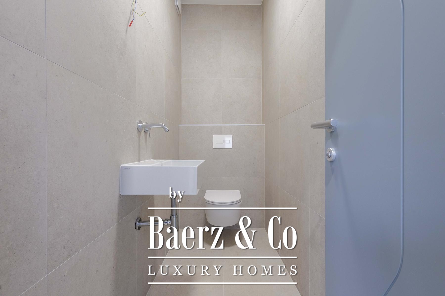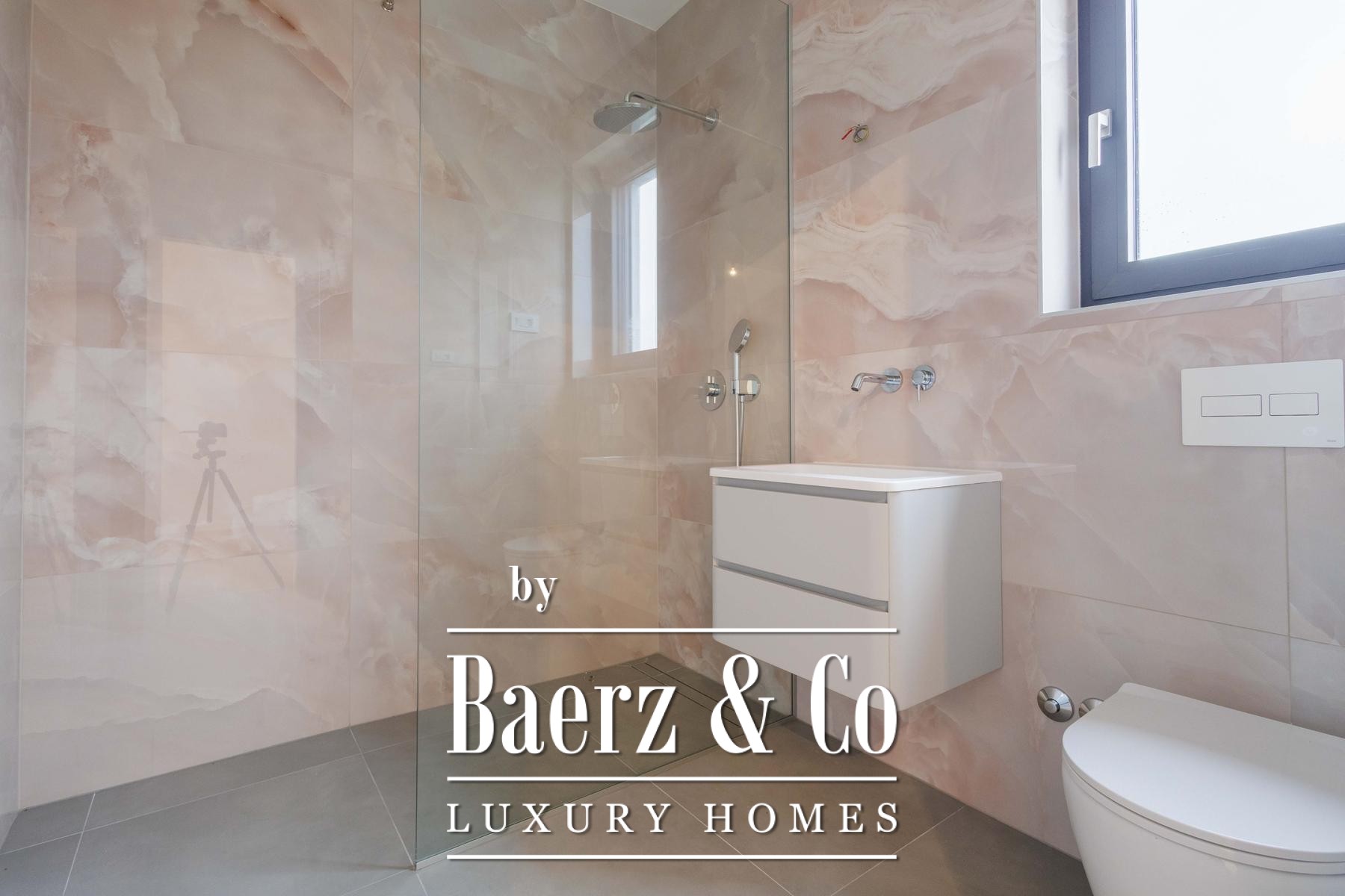 Ascending to the first floor, three bedrooms each come with private bathrooms, while four covered terraces create opportunities for quiet coastal views and privacy. The crowning rooftop terrace of 35 m² offers a secluded space for daytime sun or evenings spent by the sea. Material choices throughout are precise and premium, complemented by air conditioning, underfloor heating, and a heat pump system for year-round comfort. Four parking spaces, including two covered, underscore convenience and discretion.