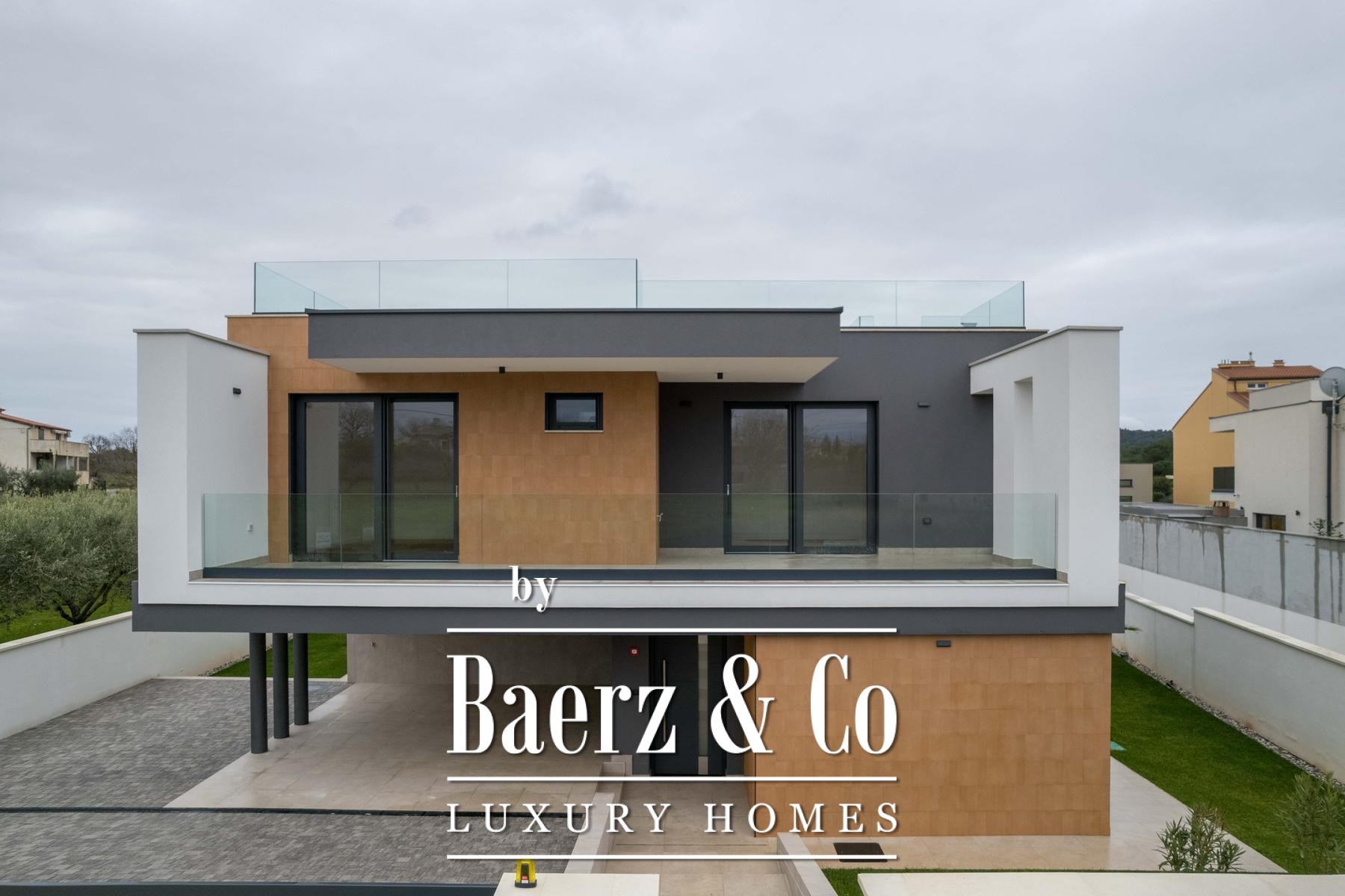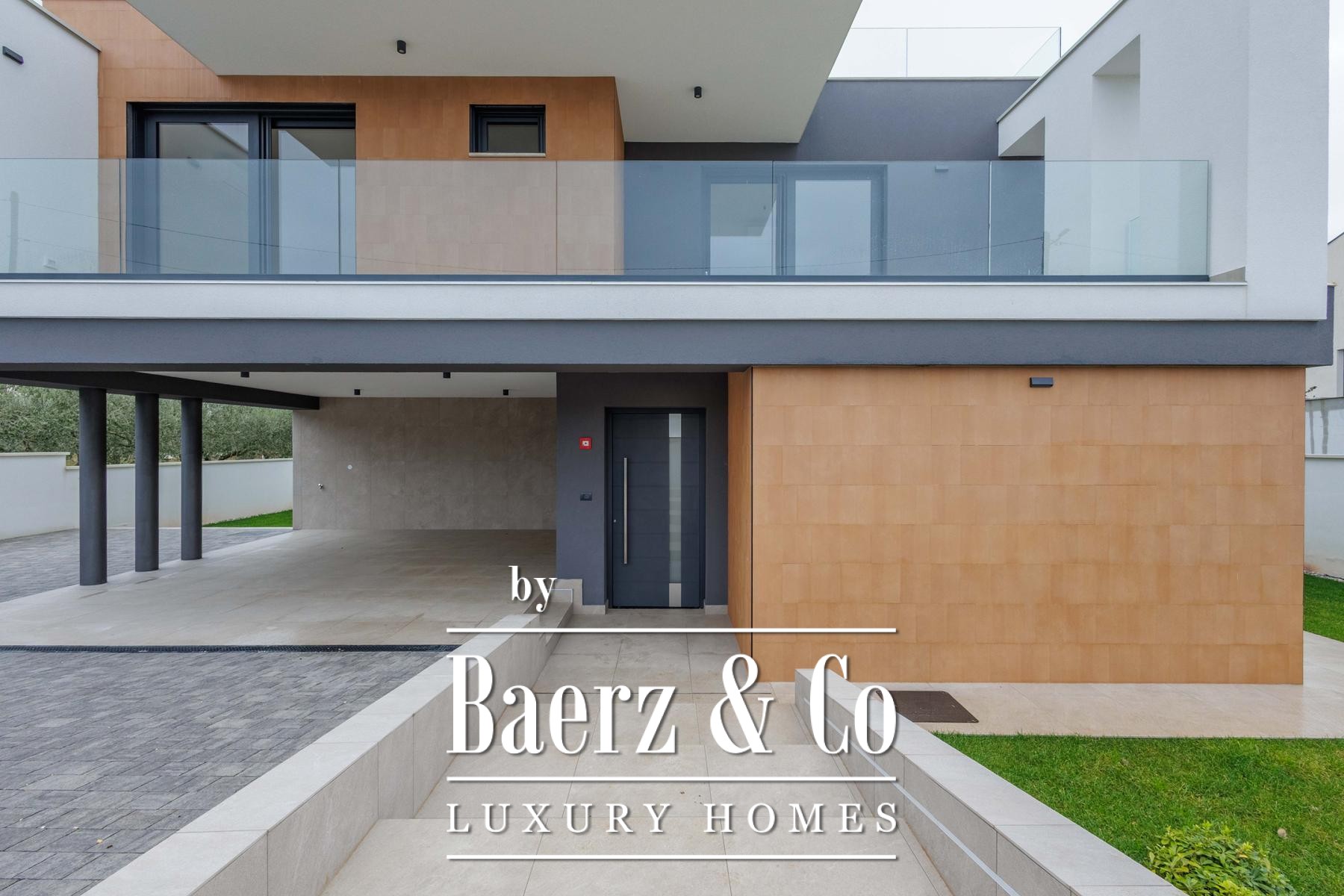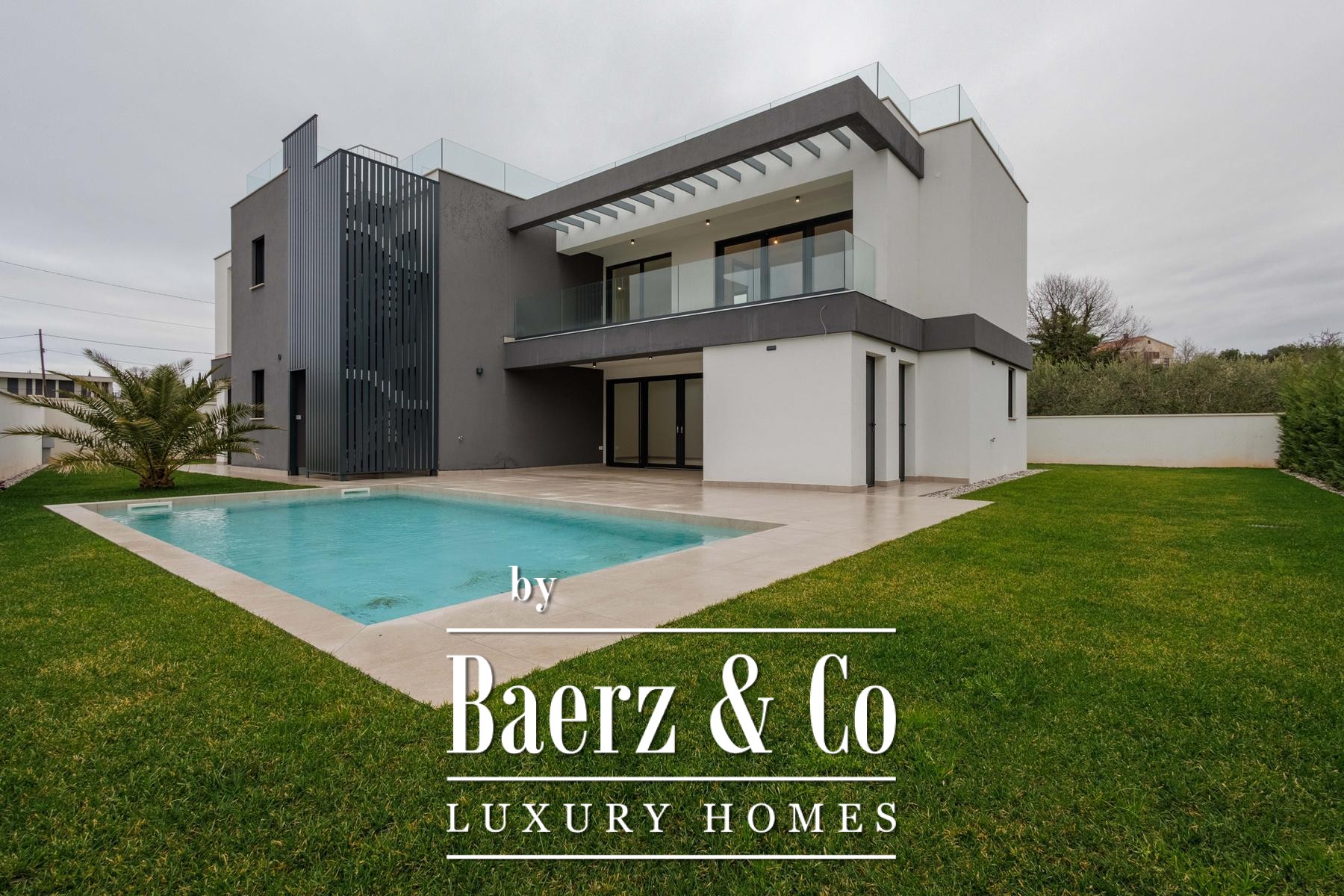Villa Medulin steps from the Adriatic is a contemporary retreat set just 20 meters from the shoreline in the south of the Istrian peninsula. This property offers 390 m² of living space, thoughtfully arranged across two floors, with a roof terrace that frames long sea views and southern light. The villa occupies a 720 m² plot, where interiors open easily to the outdoors. The ground level centers around a bright open plan living space, leading onto a covered terrace and a south-facing swimming pool. A modern kitchen, guest suite with bathroom, guest toilet, and generous storage spaces set a functional tone.