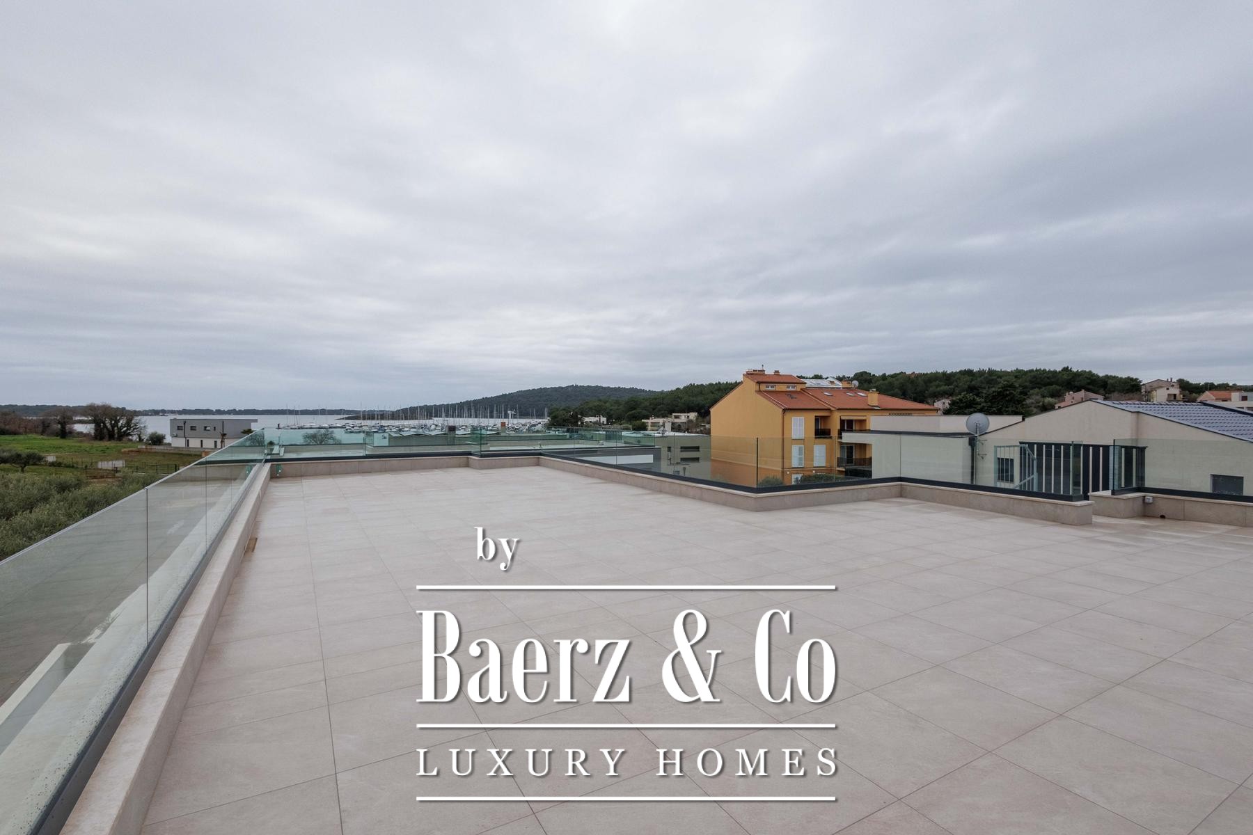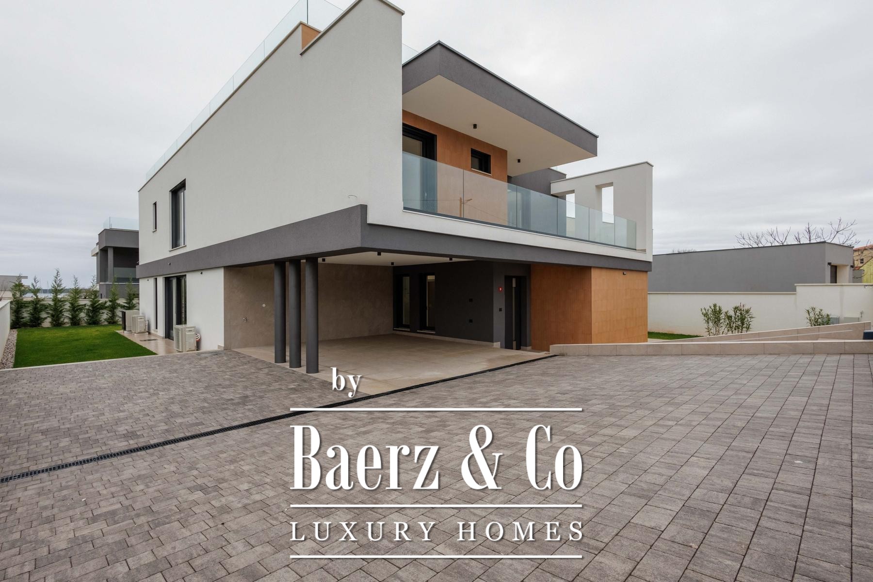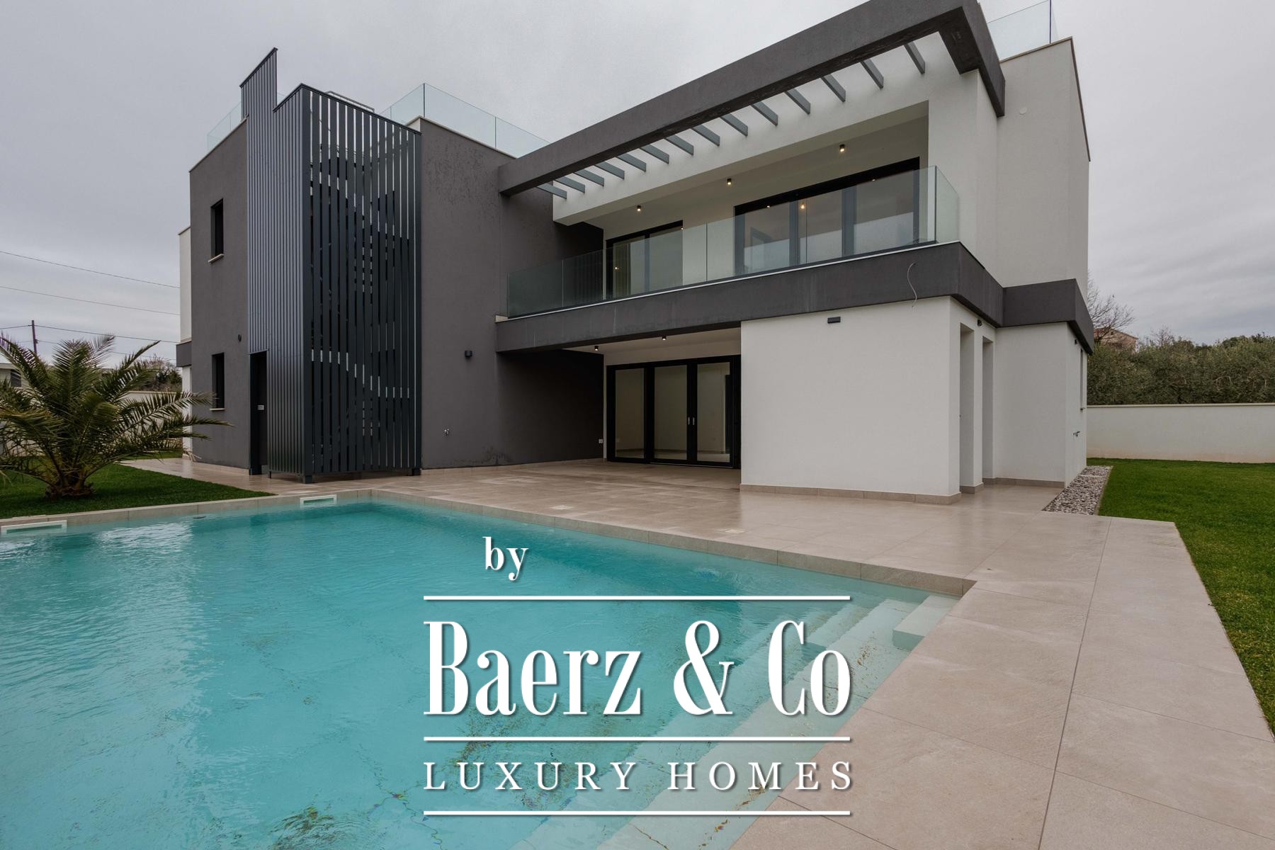 Villa Medulin steps from the Adriatic is a contemporary retreat set just 20 meters from the shoreline in the south of the Istrian peninsula. This property offers 390 m² of living space, thoughtfully arranged across two floors, with a roof terrace that frames long sea views and southern light. The villa occupies a 720 m² plot, where interiors open easily to the outdoors. The ground level centers around a bright open plan living space, leading onto a covered terrace and a south-facing swimming pool. A modern kitchen, guest suite with bathroom, guest toilet, and generous storage spaces set a functional tone.