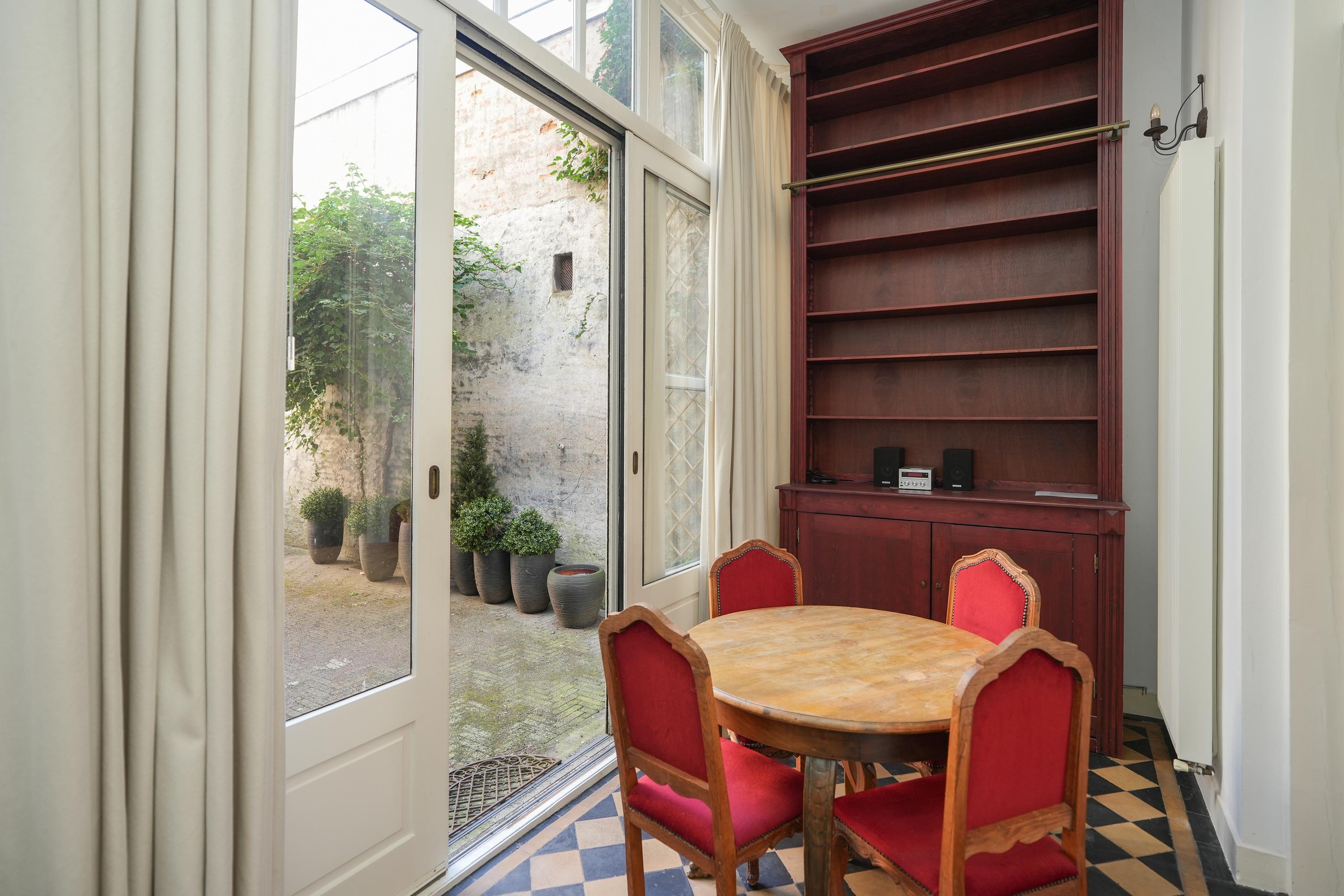 Statige hal/entree met meterkast en prachtig authentiek trappenhuis met marmeren vloeren, woonkamer en suite en eetkamer met schuifpui. In de kamer aan de voorzijde zijn de originele vensterbanken nog aanwezig, hier kan je lekker van de ochtendzon genieten. Via een tussenhal zijn het toilet, keuken en slaapkamer met badkamer bereikbaar. De sfeervolle binnentuin is toegankelijk zowel vanuit de eetkamer als de slaapkamer. De ruime keuken heeft een U-opstelling met inbouwapparatuur en een barretje.