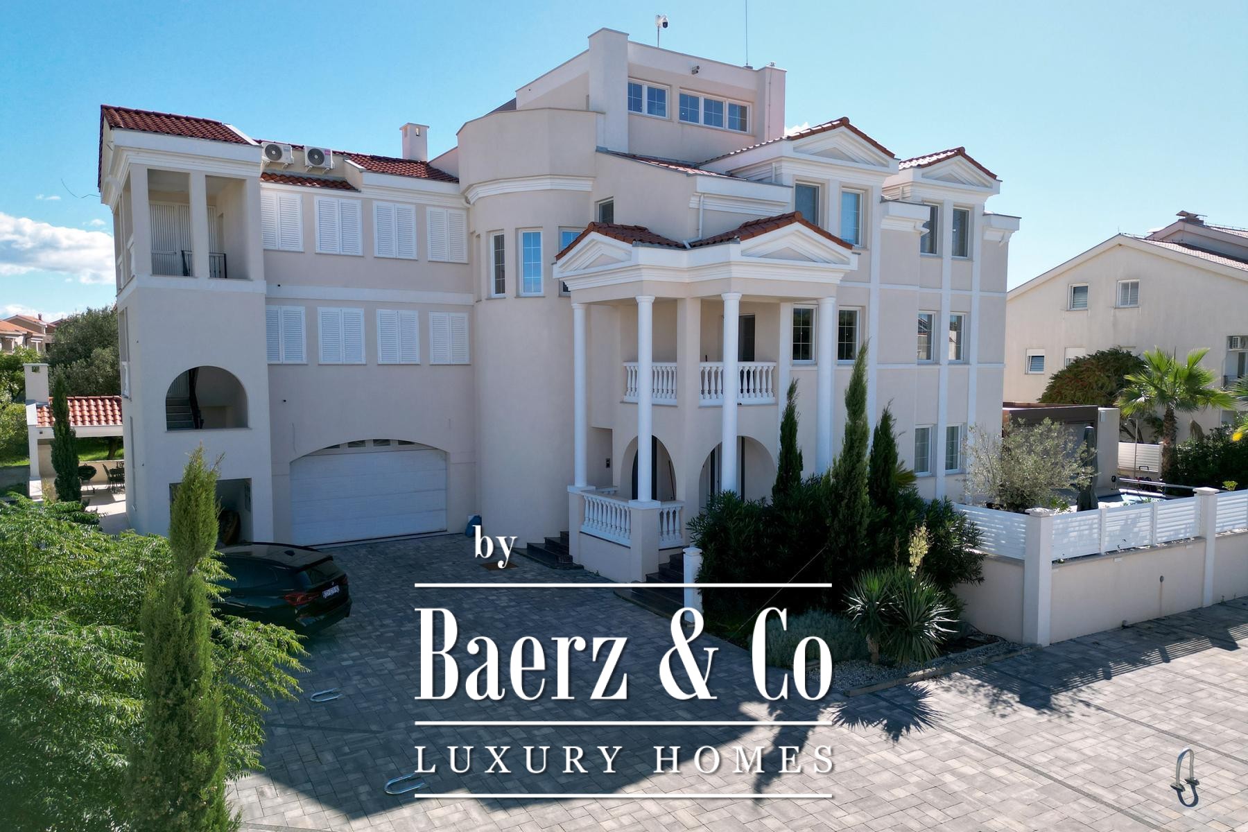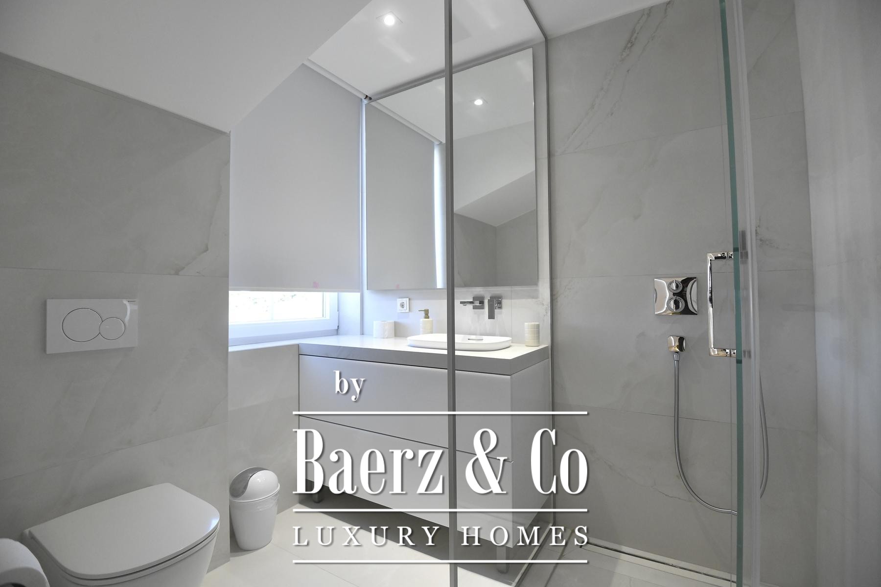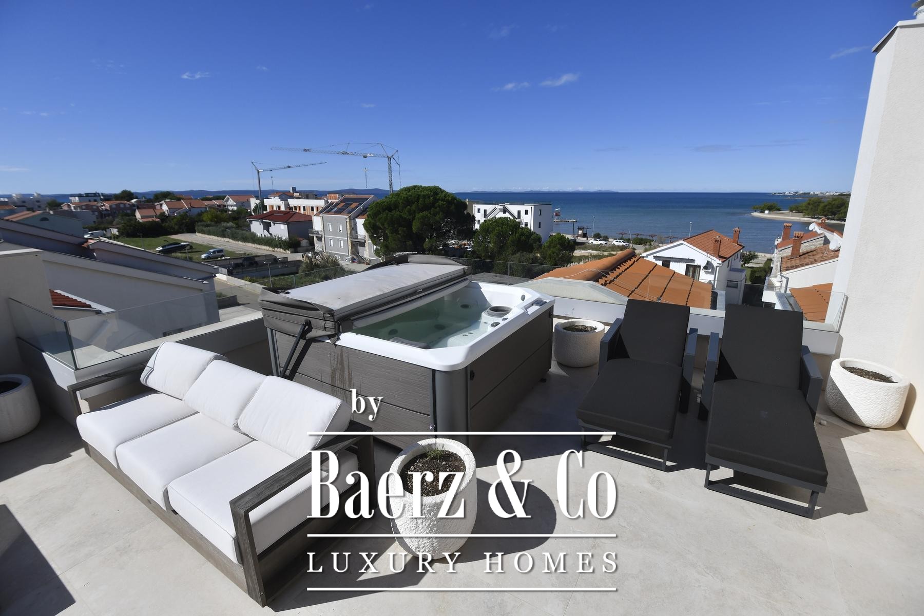 The kitchen, fitted with Miele and Liebherr appliances and quartz worktops, embodies functionality and craft. Four bedrooms and four bathrooms occupy the upper level, each space unfolding in calming neutrals, natural stone and wood. The private roof terrace stands apart—generous, intimate, and appointed with a bioclimatic pergola and jacuzzi, offering panoramic views across Zaton and the Adriatic horizon.