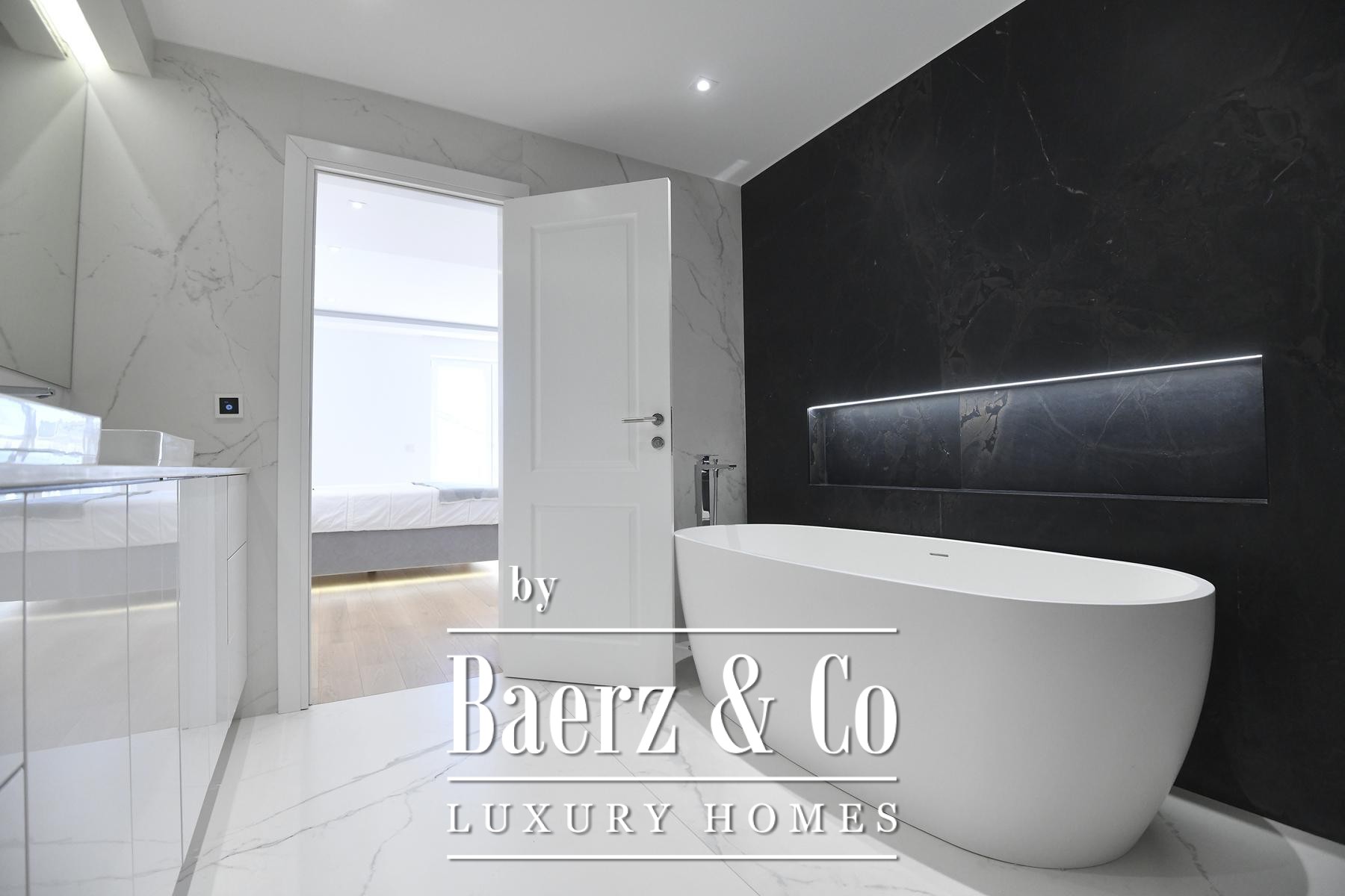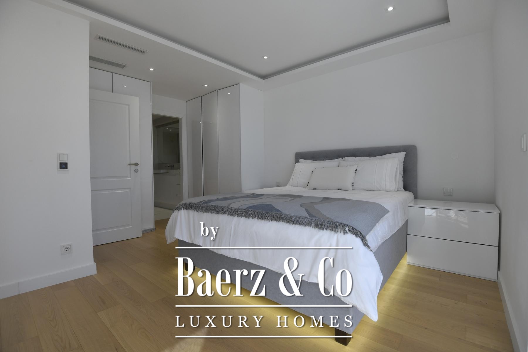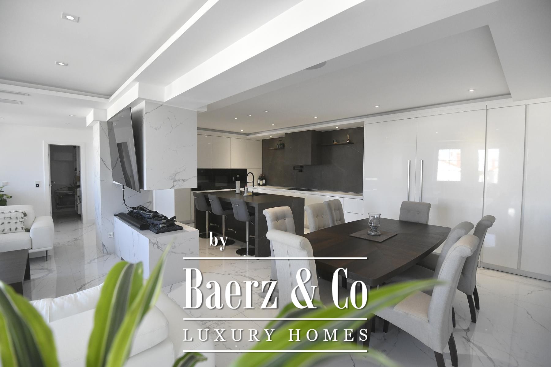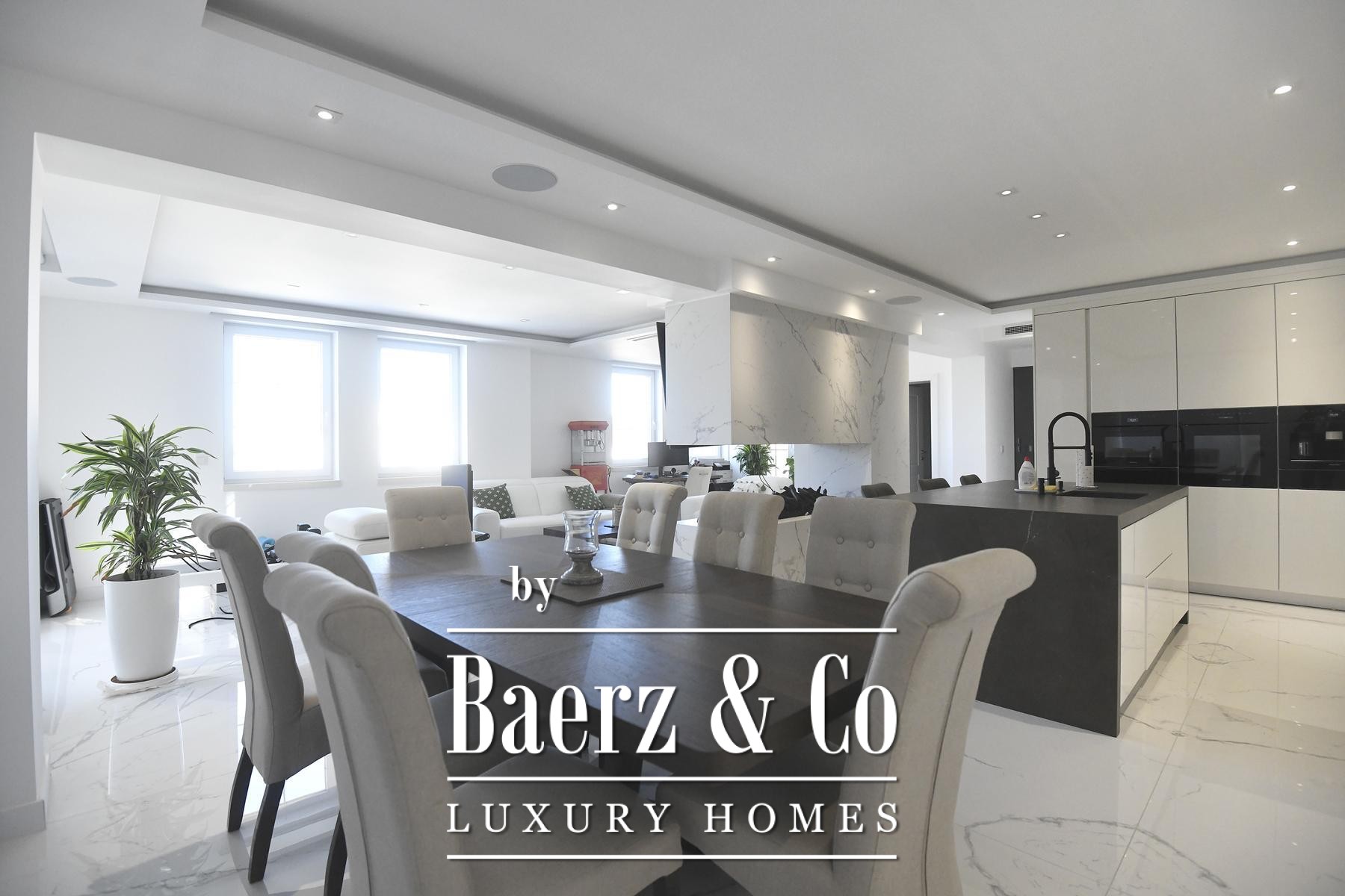 The focus here is on seamless spatial flow. An open-plan living and dining area is anchored by a marble-clad fireplace, set under a ceiling that draws in natural light from large glass surfaces and French doors that frame sea views. The tactile warmth of three-layer parquet floors is balanced by underfloor heating and discreet ceiling air conditioning, all managed via an advanced smart system for lighting, blinds and climate.
