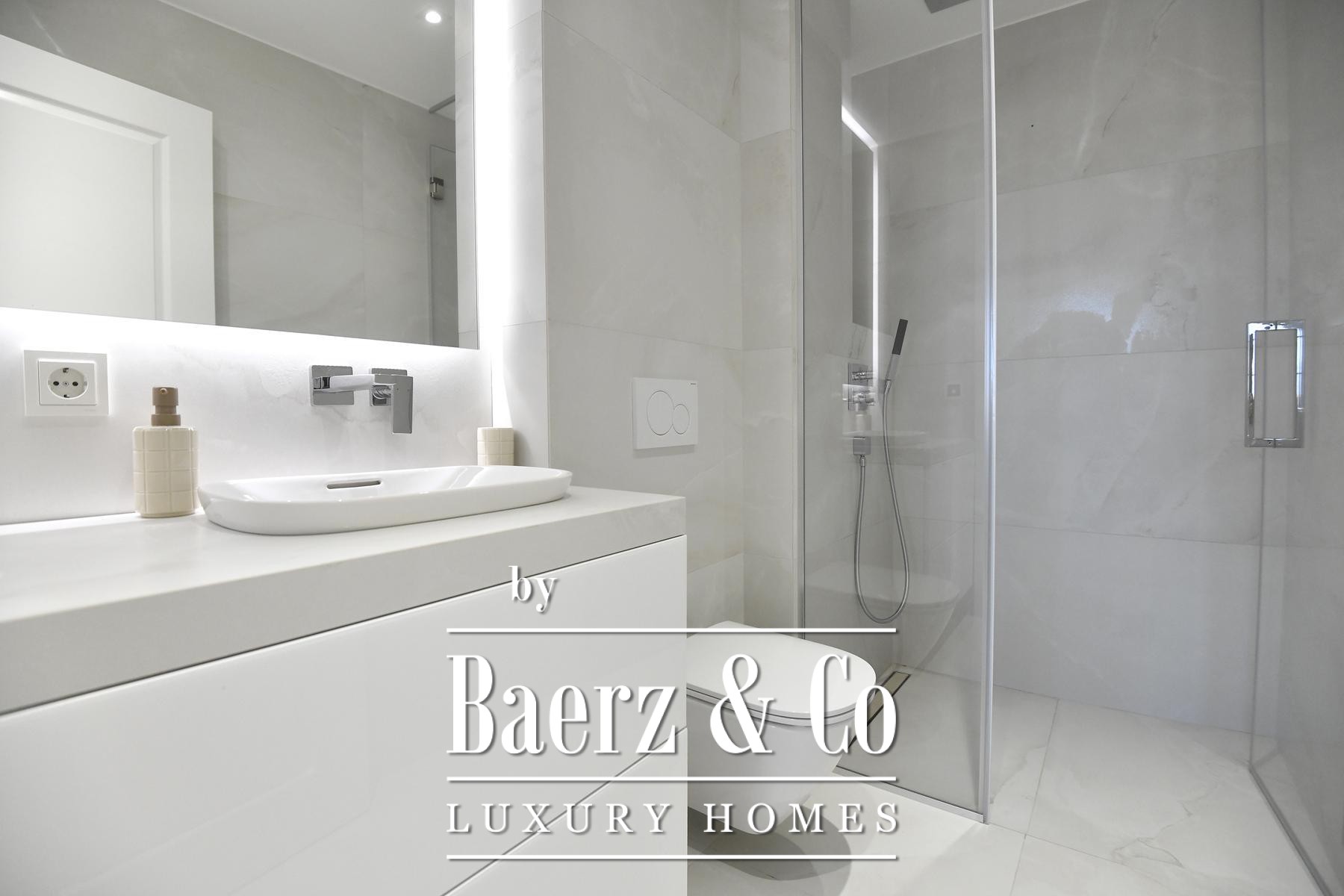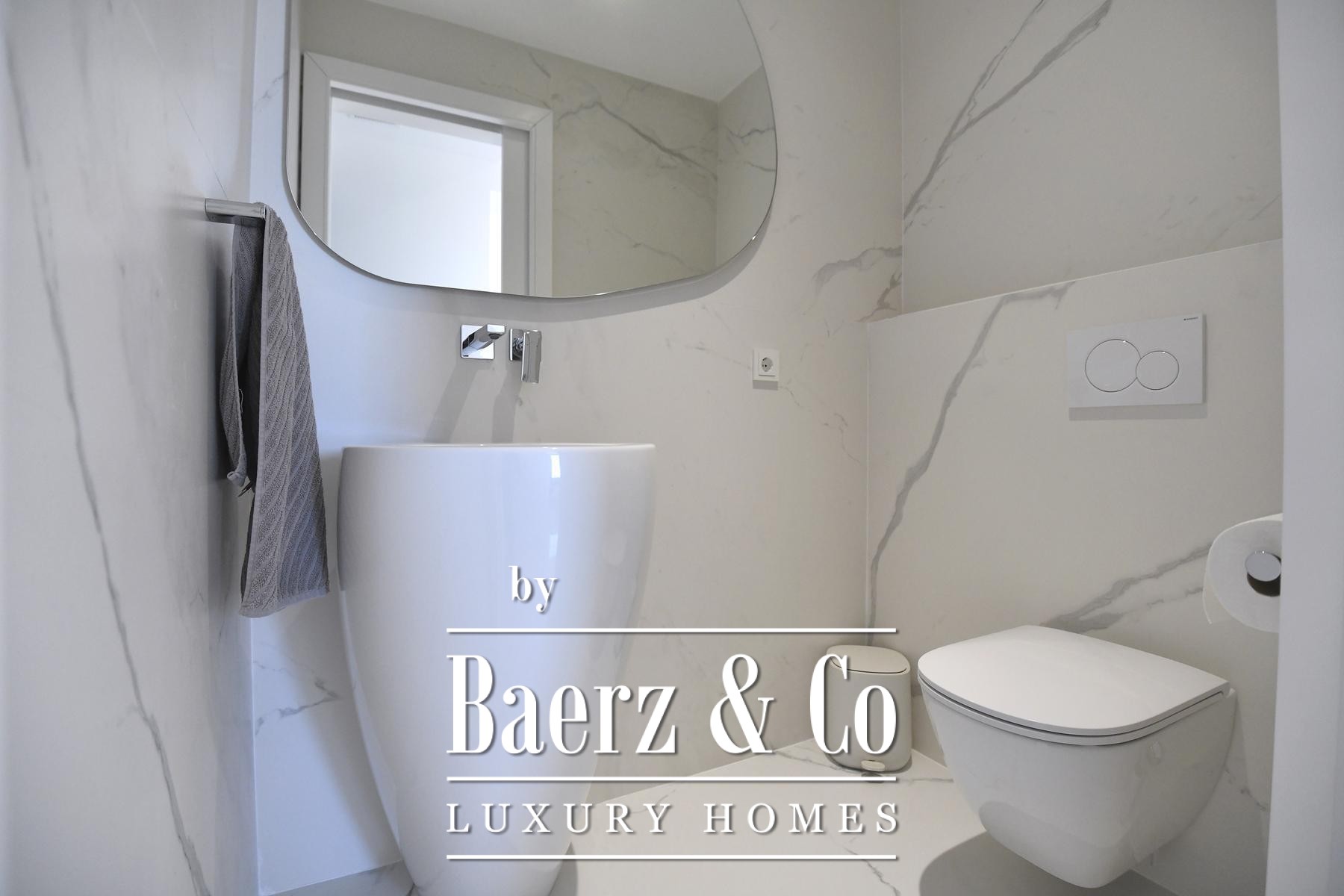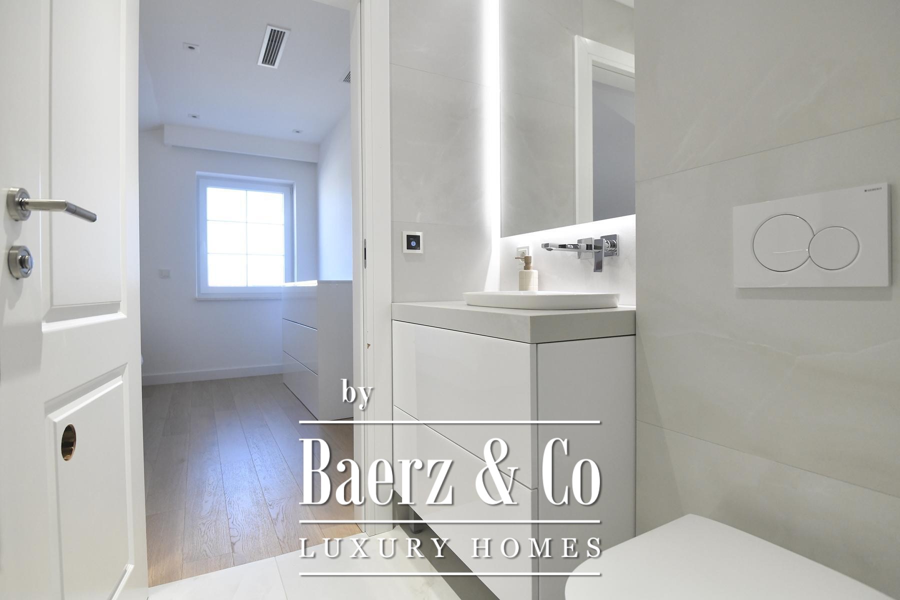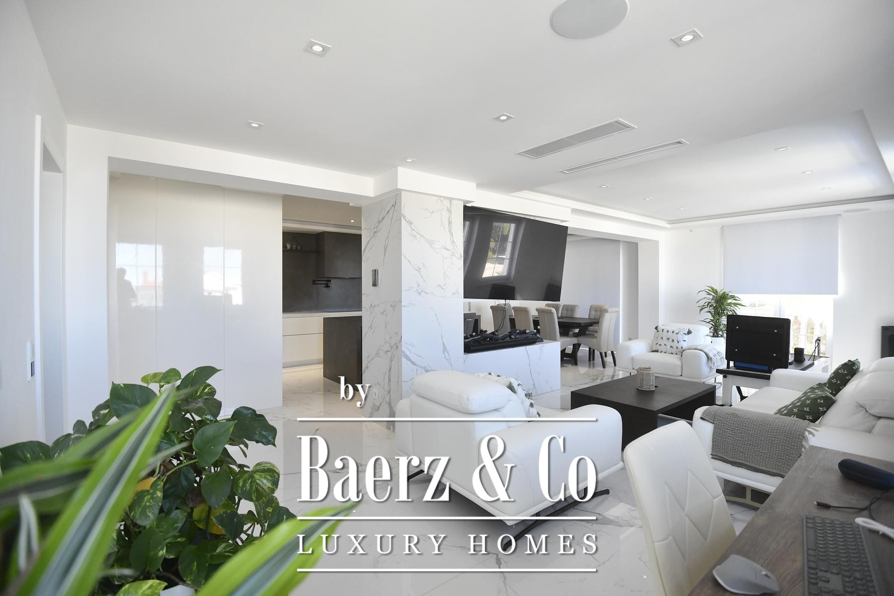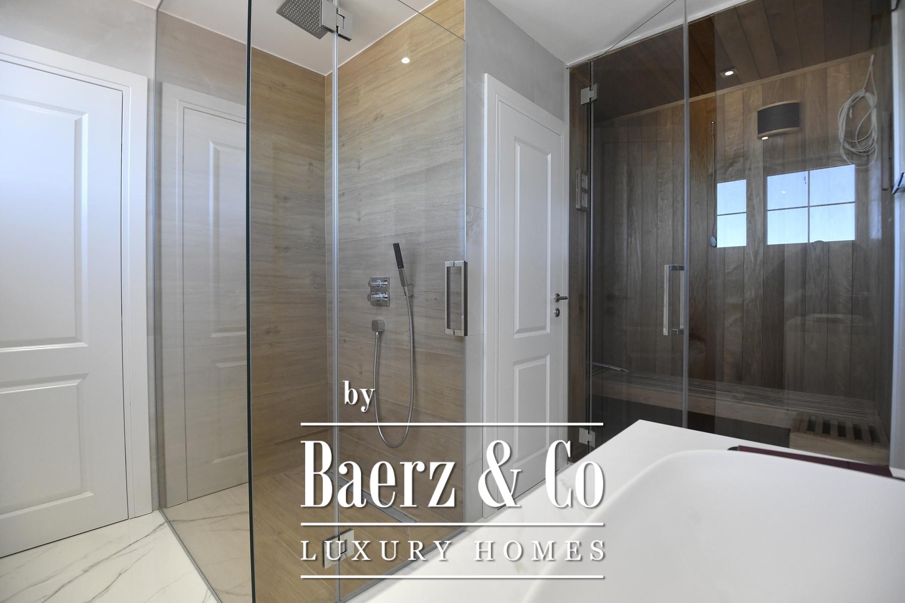 The focus here is on seamless spatial flow. An open-plan living and dining area is anchored by a marble-clad fireplace, set under a ceiling that draws in natural light from large glass surfaces and French doors that frame sea views. The tactile warmth of three-layer parquet floors is balanced by underfloor heating and discreet ceiling air conditioning, all managed via an advanced smart system for lighting, blinds and climate.