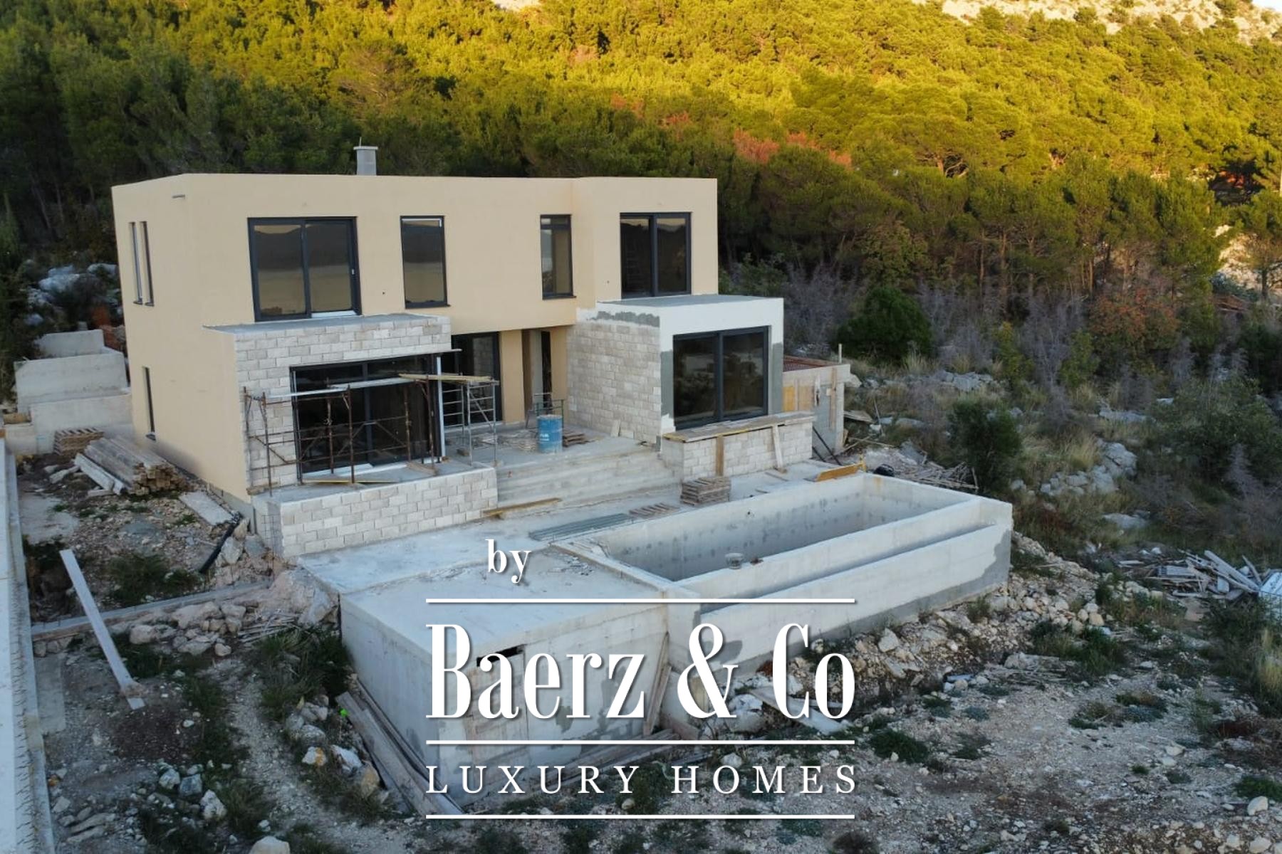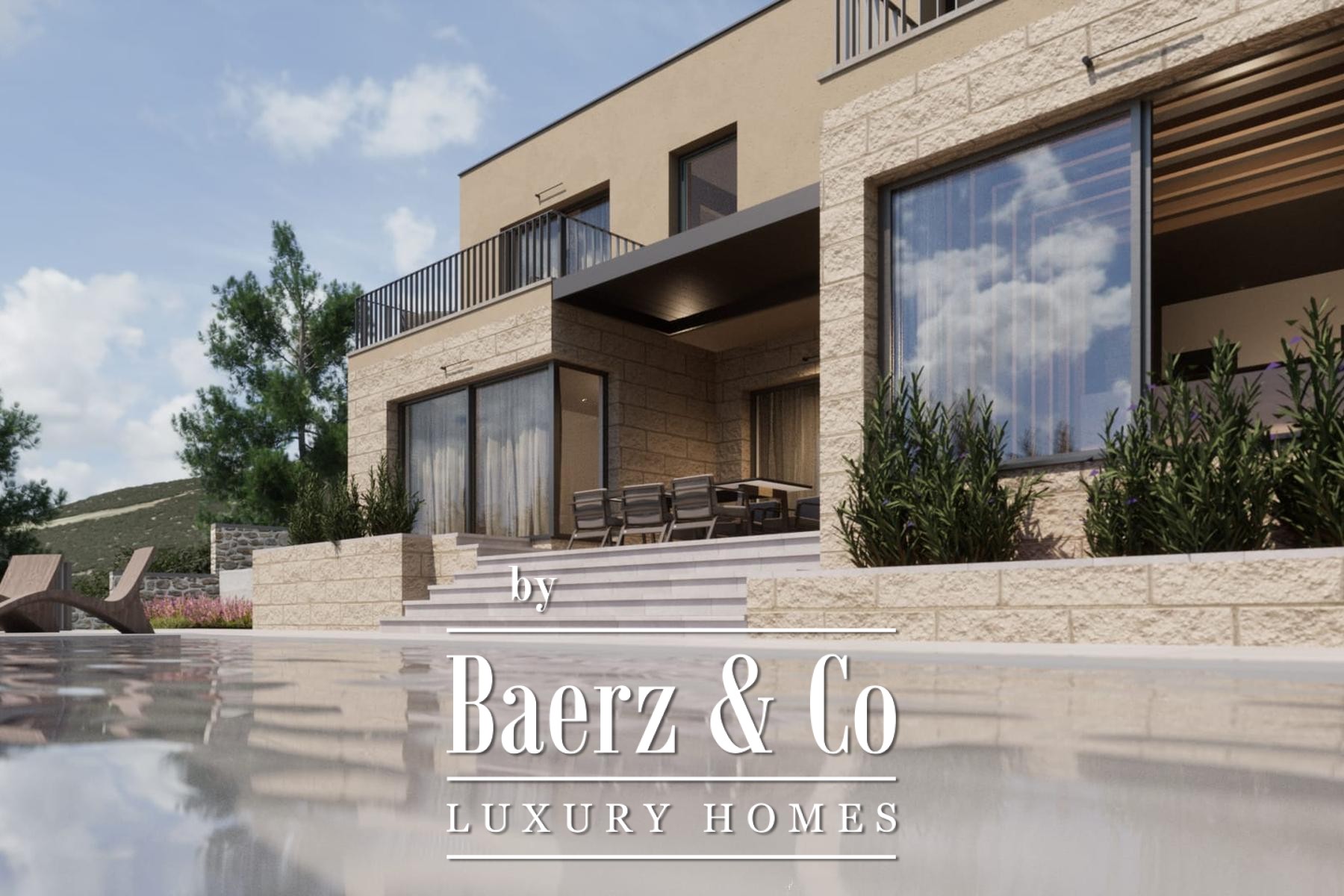 The exterior blends contemporary lines with materials native to the setting, including Brač stone and expansive glass walls. Outdoors, a sundeck, a terrace with dining and barbecue areas, a 32 m² swimming pool, and four parking spaces enhance the sense of escape and possibility.