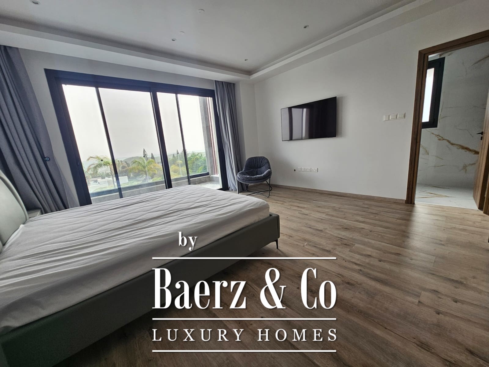Outdoors, the landscaped garden frames a private swimming pool and BBQ area, complemented by a poolside shower and toilet. Eight parking spaces, ample storage, a security door, and a dedicated service room complete the offering. This villa defines high-end living for those drawn to the unique panorama and tranquility of Parekklisia.