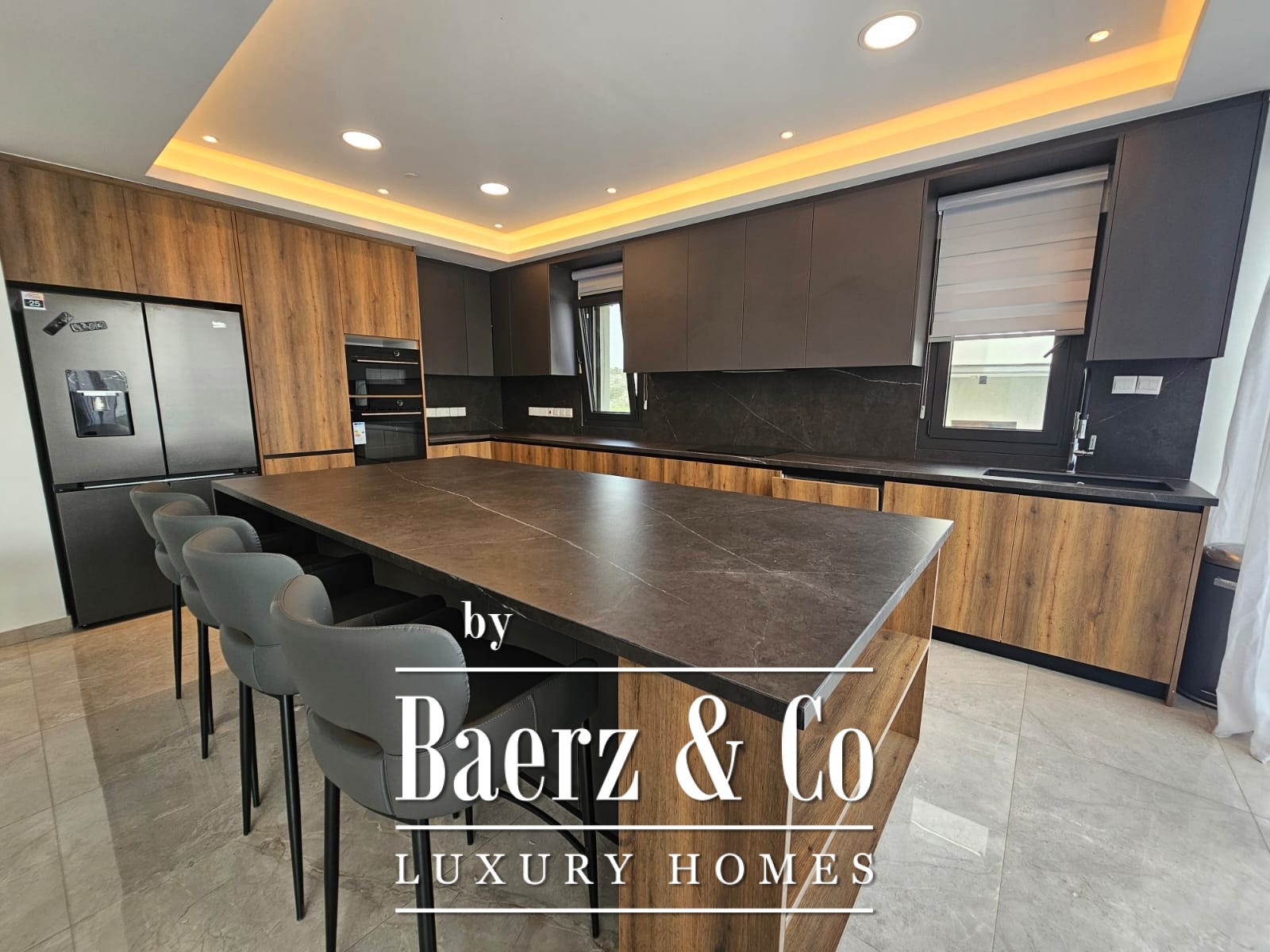 Set within a landscaped 888 sq.m. plot, the villa invites residents to savour quiet moments by the private swimming pool, host gatherings in the sunlit BBQ area, or simply relax in the exceptional living spaces. The layout includes four bedrooms, three bathrooms, and two guest WCs, while a service room adds further convenience. Interiors are finished to exacting standards, featuring large-format tiles, aluminium double-glazed windows for thermal and sound insulation, and a fully integrated underfloor heating and air conditioning system.