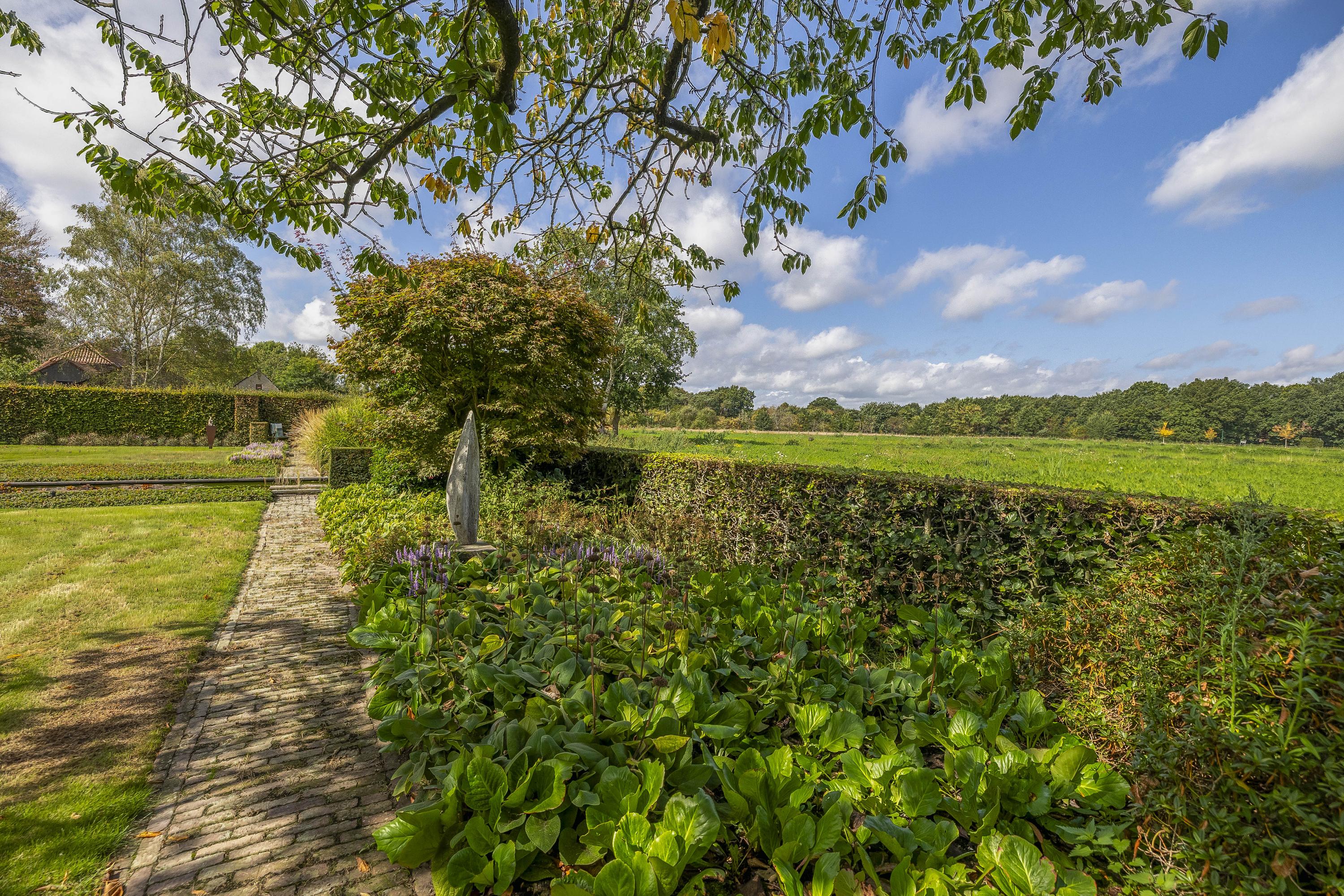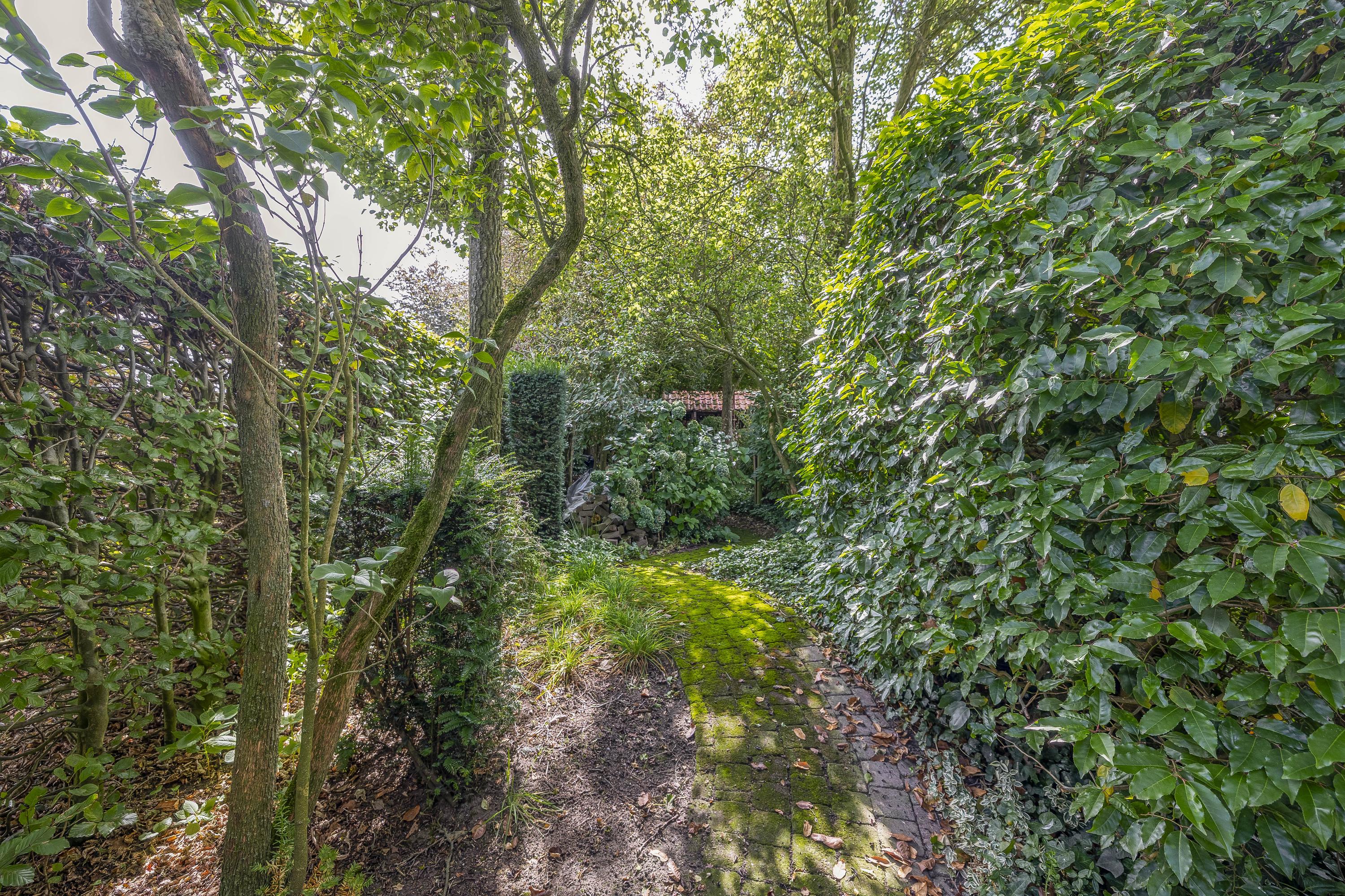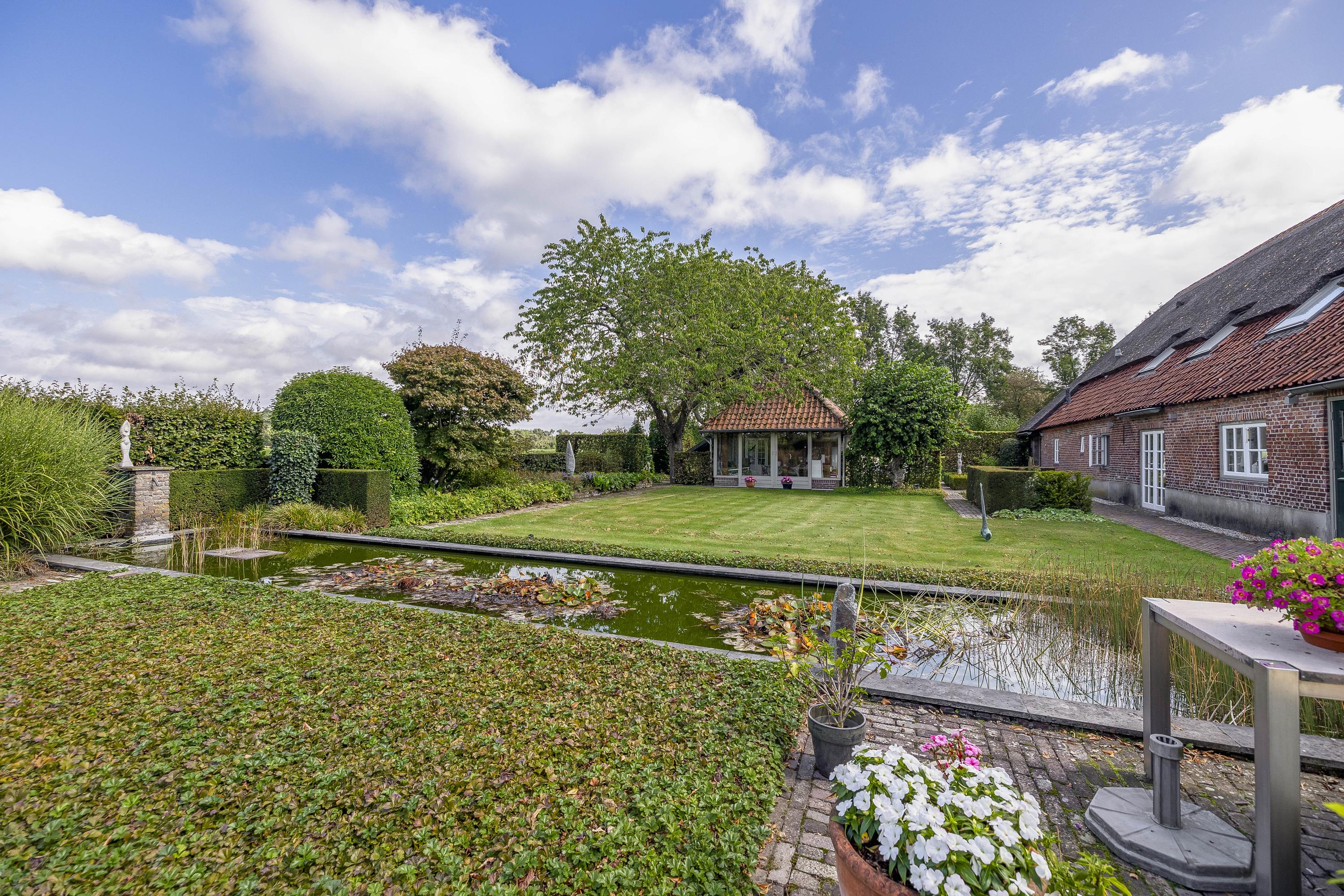 Behind the house and on the sides is a beautifully landscaped garden. On the left side is a nice, spacious area with a lawn, plant borders, old baked clinker paving, and various beech hedges. At the rear, you can enjoy a beautiful view, a large pond (with biological filter), a spacious lawn, plant borders, and mature vegetation. The garden is well laid out and well maintained. There is a double driveway on the right side of the property. The garden even offers the possibility of keeping small animals. There is also a section of the garden with a “lovers' lane.” To the left of the house is a landscaped jeu-de-boules court.