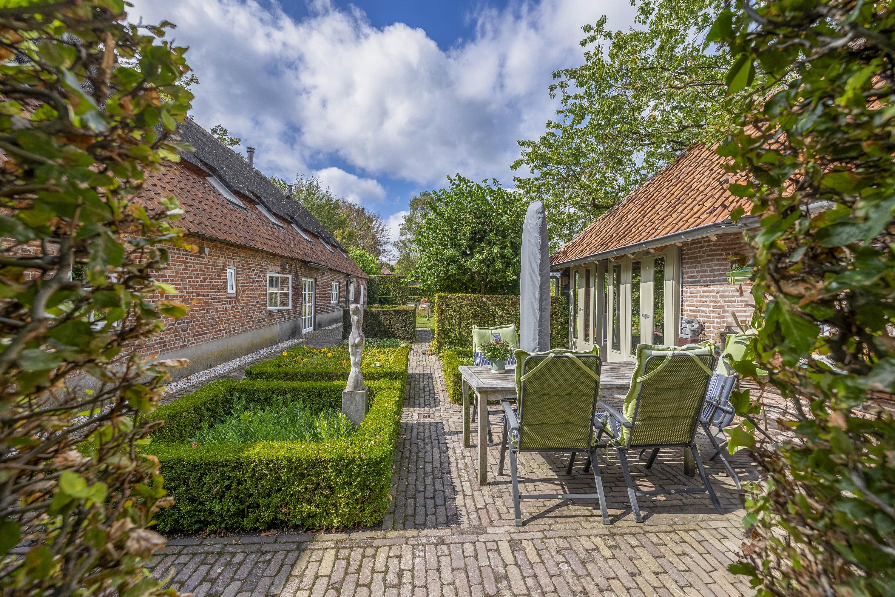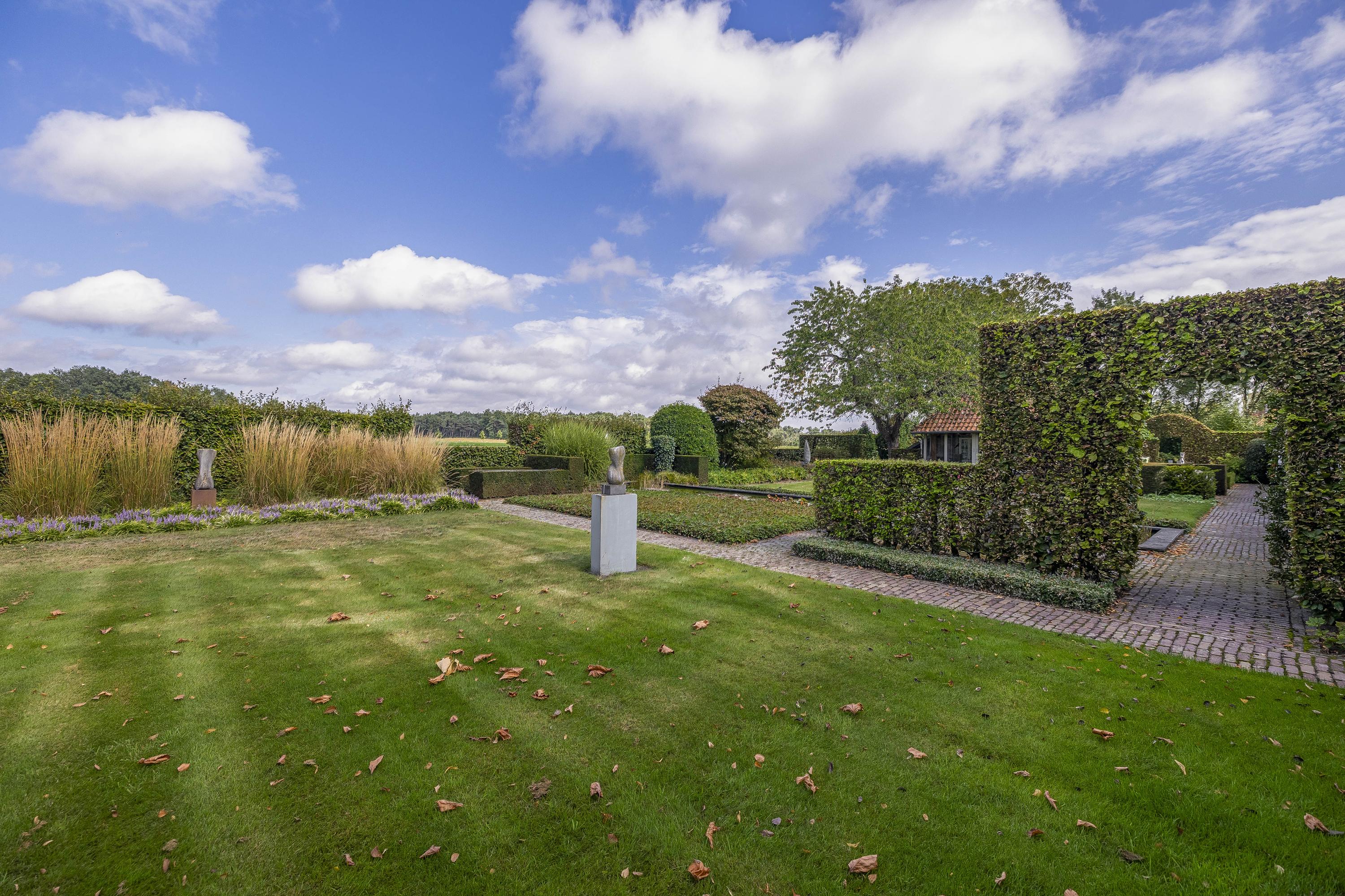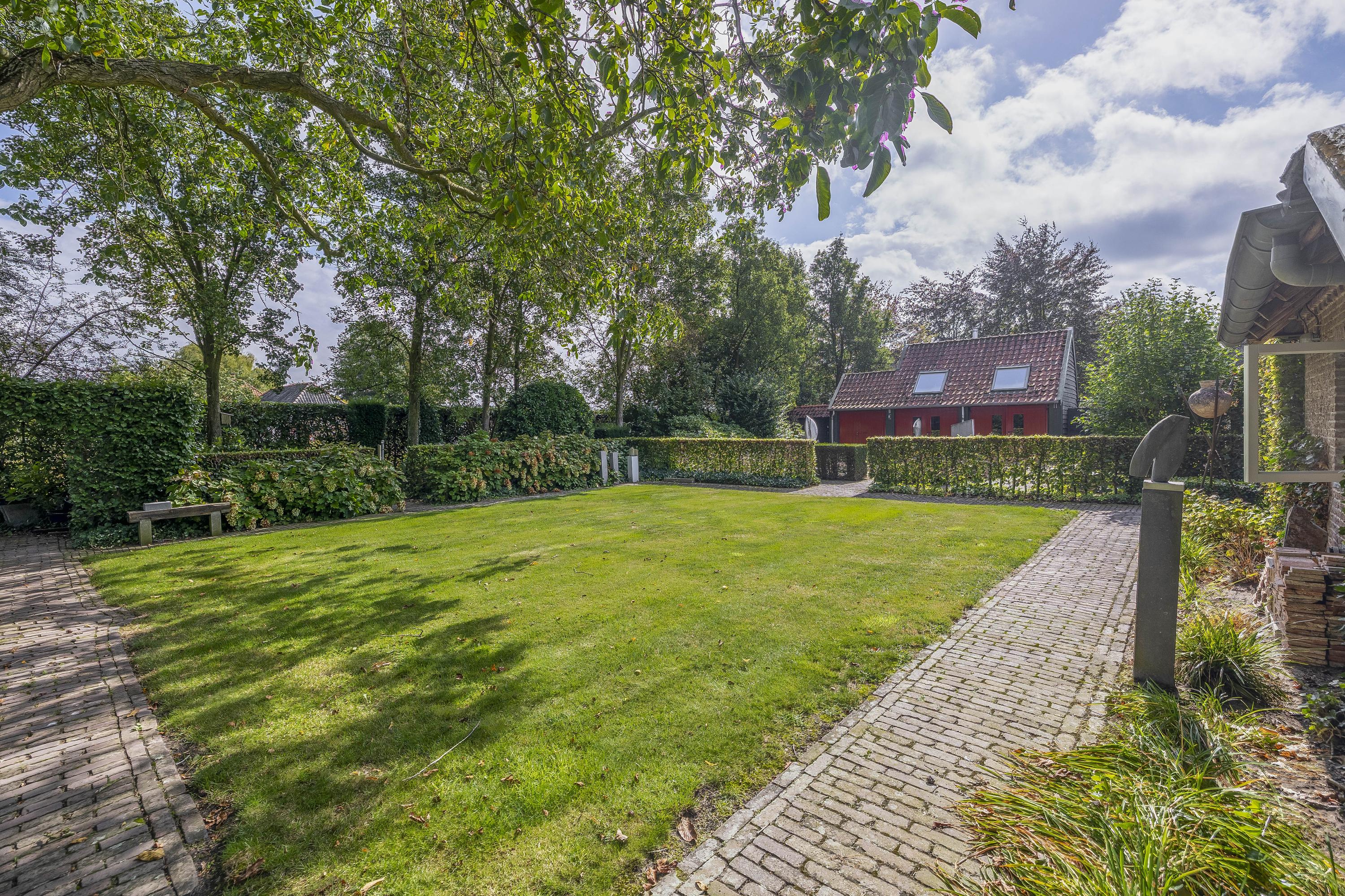 Behind the house and on the sides is a beautifully landscaped garden. On the left side is a nice, spacious area with a lawn, plant borders, old baked clinker paving, and various beech hedges. At the rear, you can enjoy a beautiful view, a large pond (with biological filter), a spacious lawn, plant borders, and mature vegetation. The garden is well laid out and well maintained. There is a double driveway on the right side of the property. The garden even offers the possibility of keeping small animals. There is also a section of the garden with a “lovers' lane.” To the left of the house is a landscaped jeu-de-boules court.