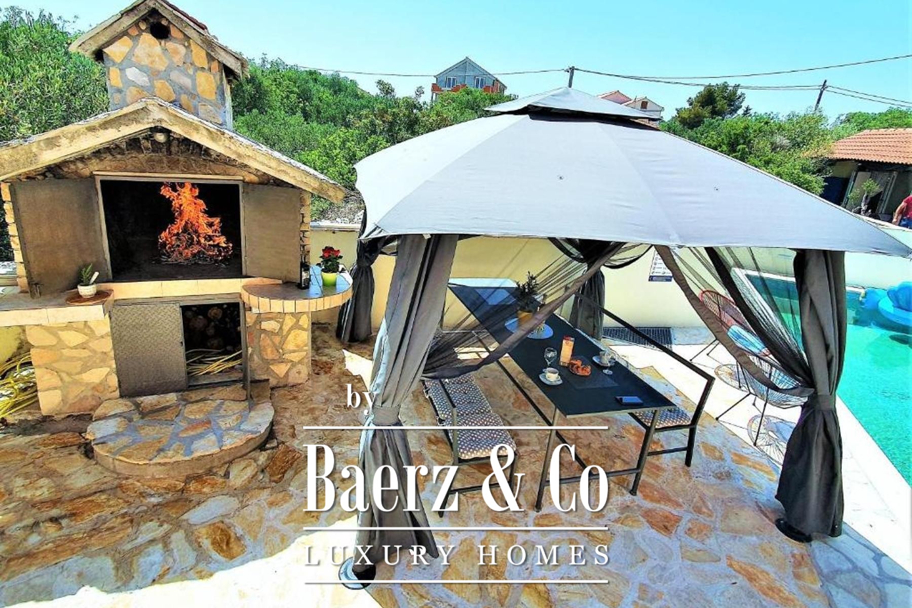 of which has a private bathroom, one separate bathroom, and a living room with kitchen and dining area. The living room opens onto a spacious covered terrace. On the second floor there are two more studio apartments, each of which consists of a living room with kitchen and dining area, a bathroom and a terrace with a sea view.Around the house there is a beautiful garden with a grill, a large swimming pool and a sunbathing area. The house has 6 parking spaces, two of which are covered. The microlocation of the house is excellent, in a very quiet place, yet only 500 meters from the sea.All other information on request.